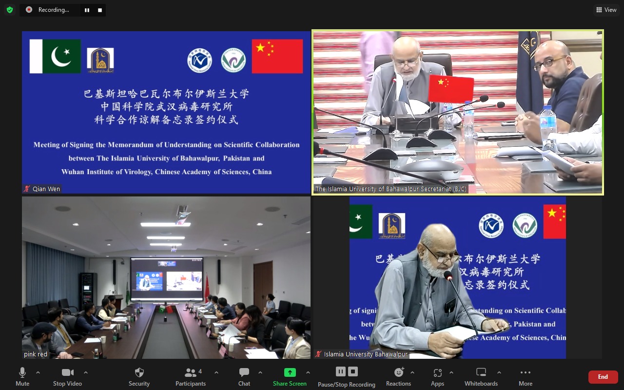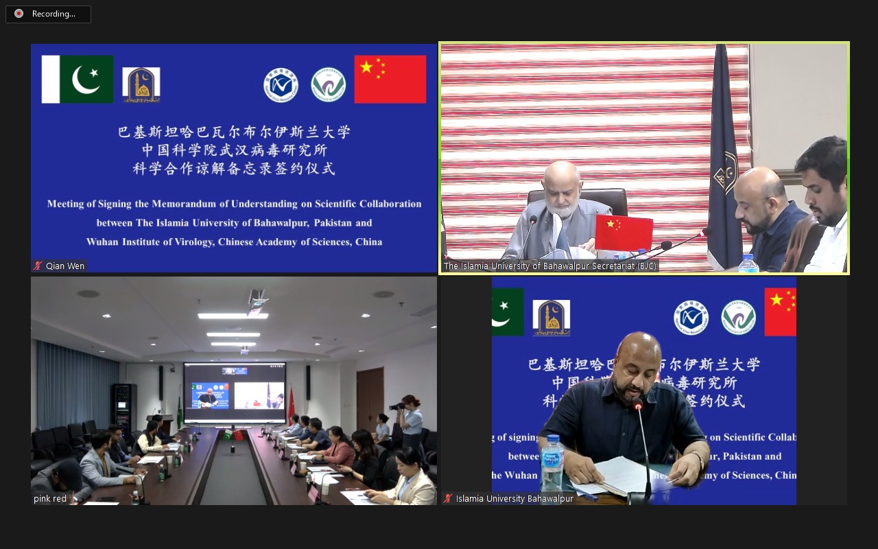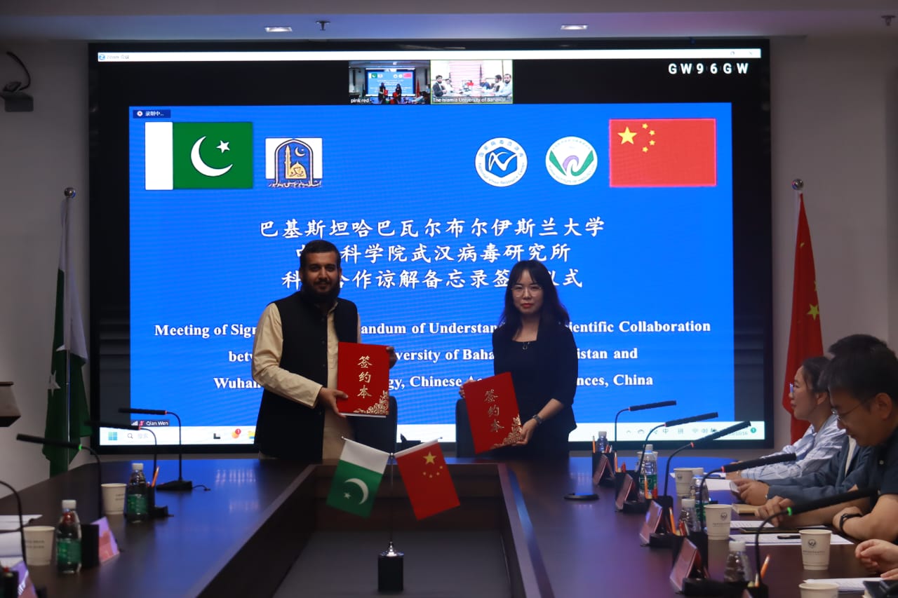 Memorandum of Understanding signing ceremony between the Islamia University of Bahawalpur, Pakistan and the Wuhan Institute of Virology, Chinese Academy of Sciences , China. Prof. Dr. Naveed Akhtar, Vice Chancellor, the Islamia University of Bahawalpur, Pakistan and Prof. Dr. Xi Zhou, Deputy Director General, Chinese Academy of Sciences, China signed MoU.