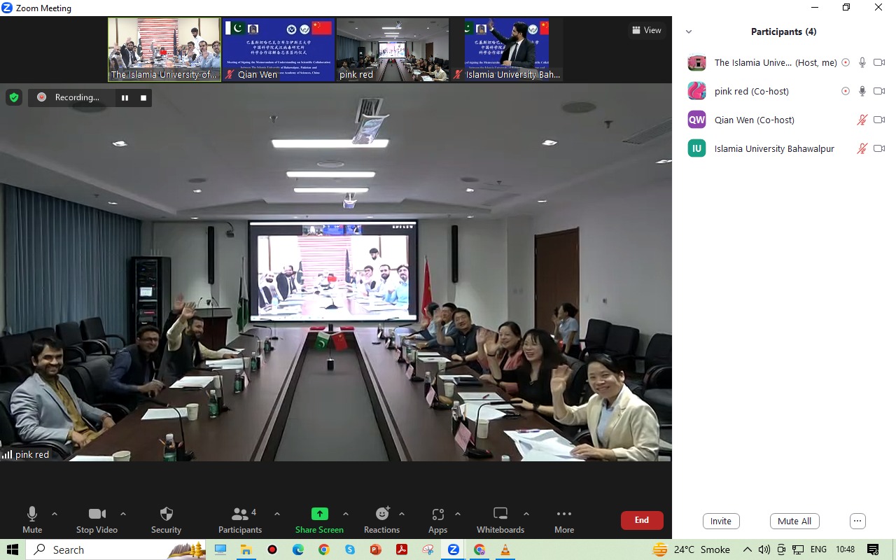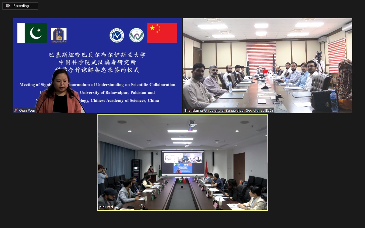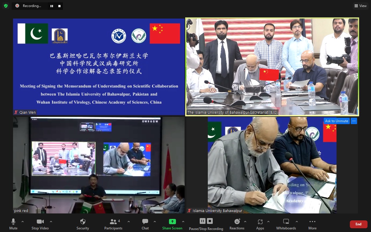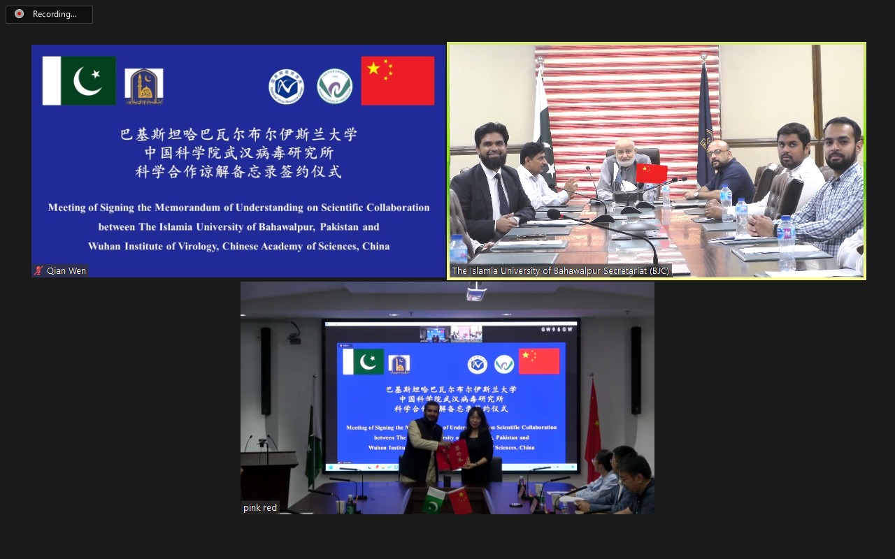 Memorandum of Understanding signing ceremony between the Islamia University of Bahawalpur, Pakistan and the Wuhan Institute of Virology, Chinese Academy of Sciences , China. Prof. Dr. Naveed Akhtar, Vice Chancellor, the Islamia University of Bahawalpur, Pakistan and Prof. Dr. Xi Zhou, Deputy Director General, Chinese Academy of Sciences, China signed MoU.