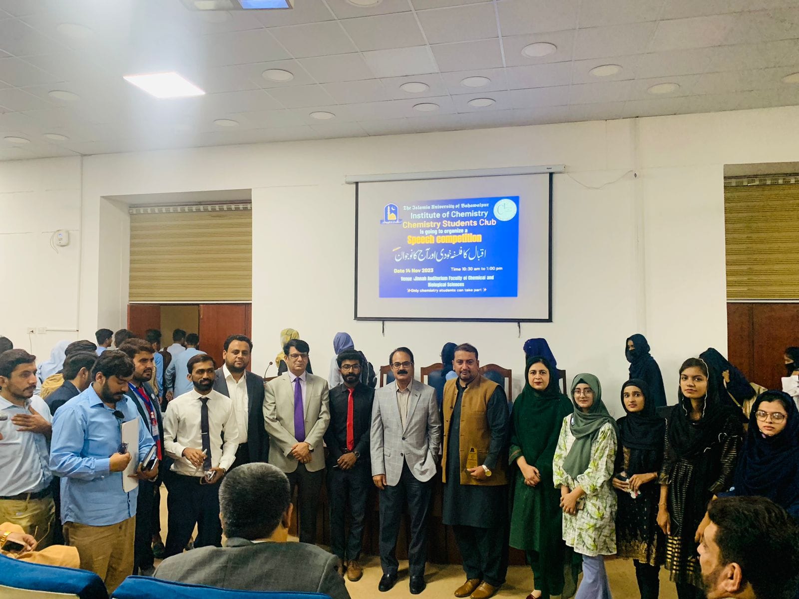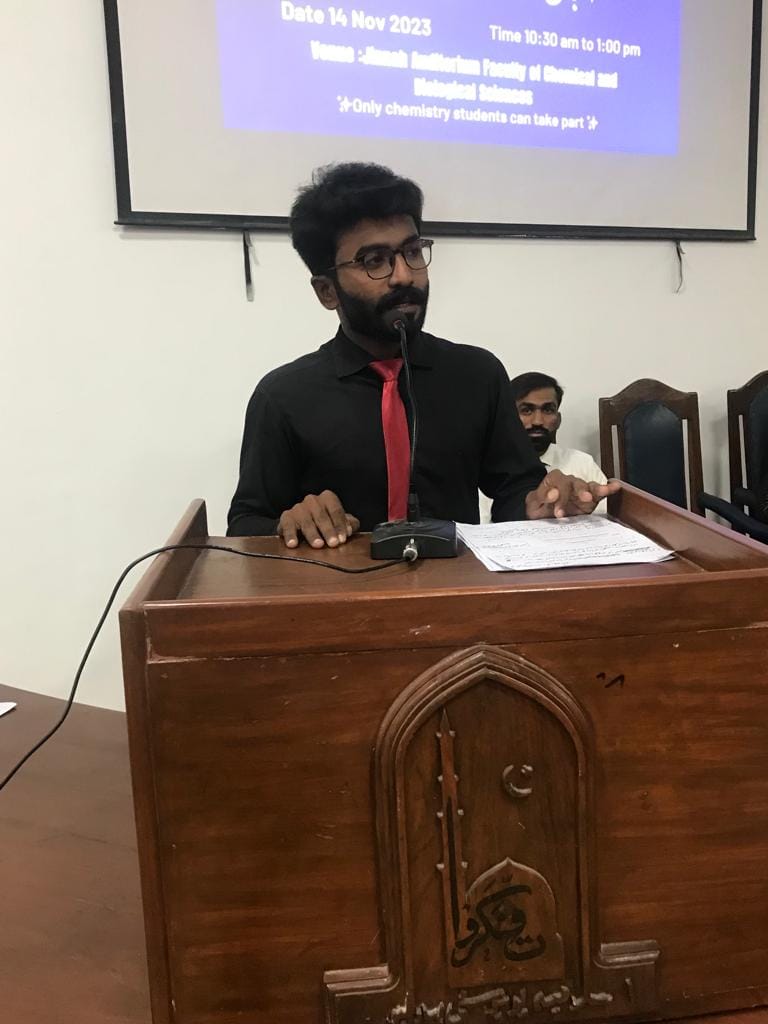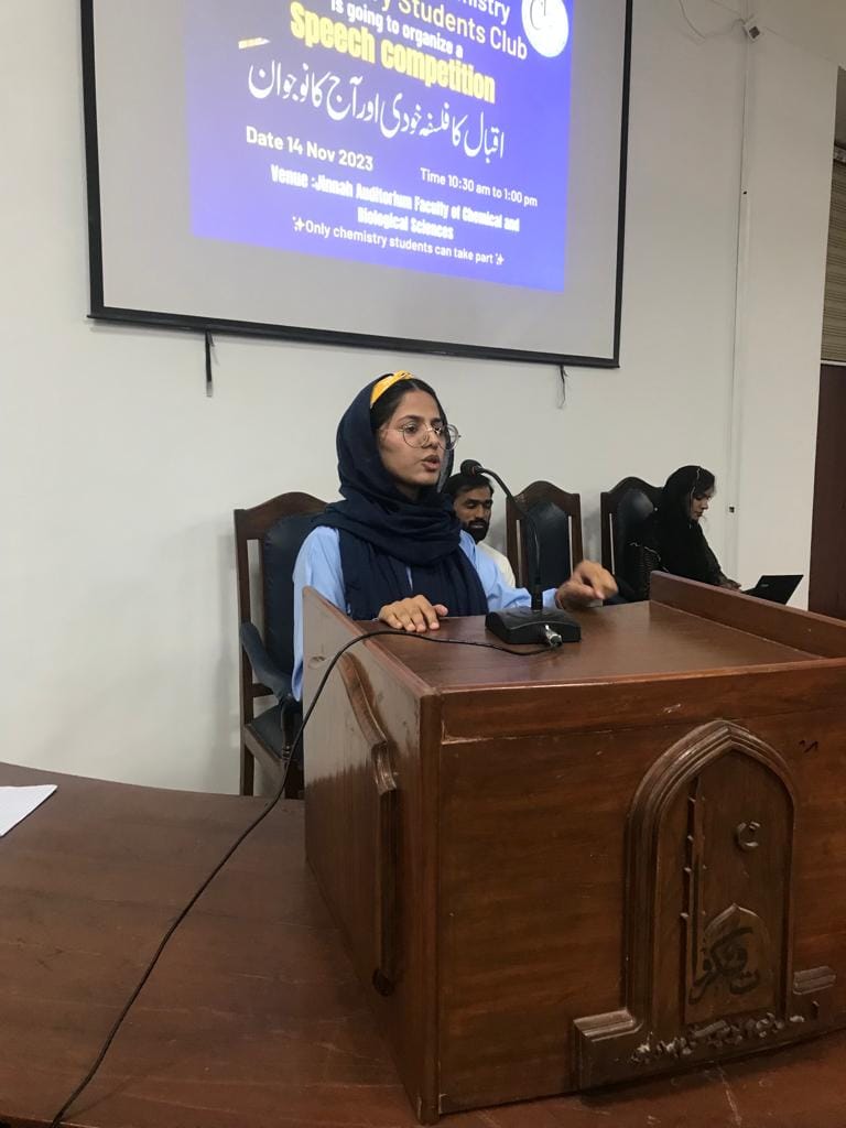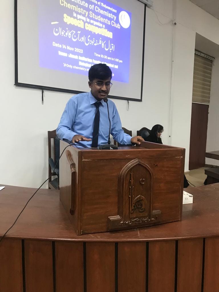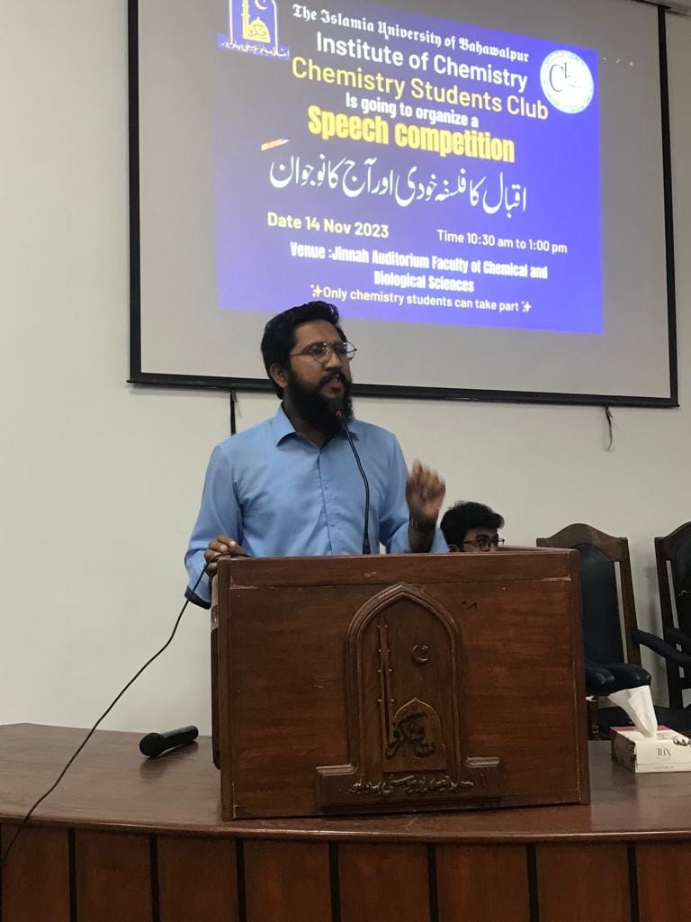 On the occasion of Iqbal Day, Chemistry Students Club, The Islamia University of Bhawalpur organized a speech competition on 14 November 2023 at Jinnah Auditorium, Faculty of Chemical & Biological Sciences.