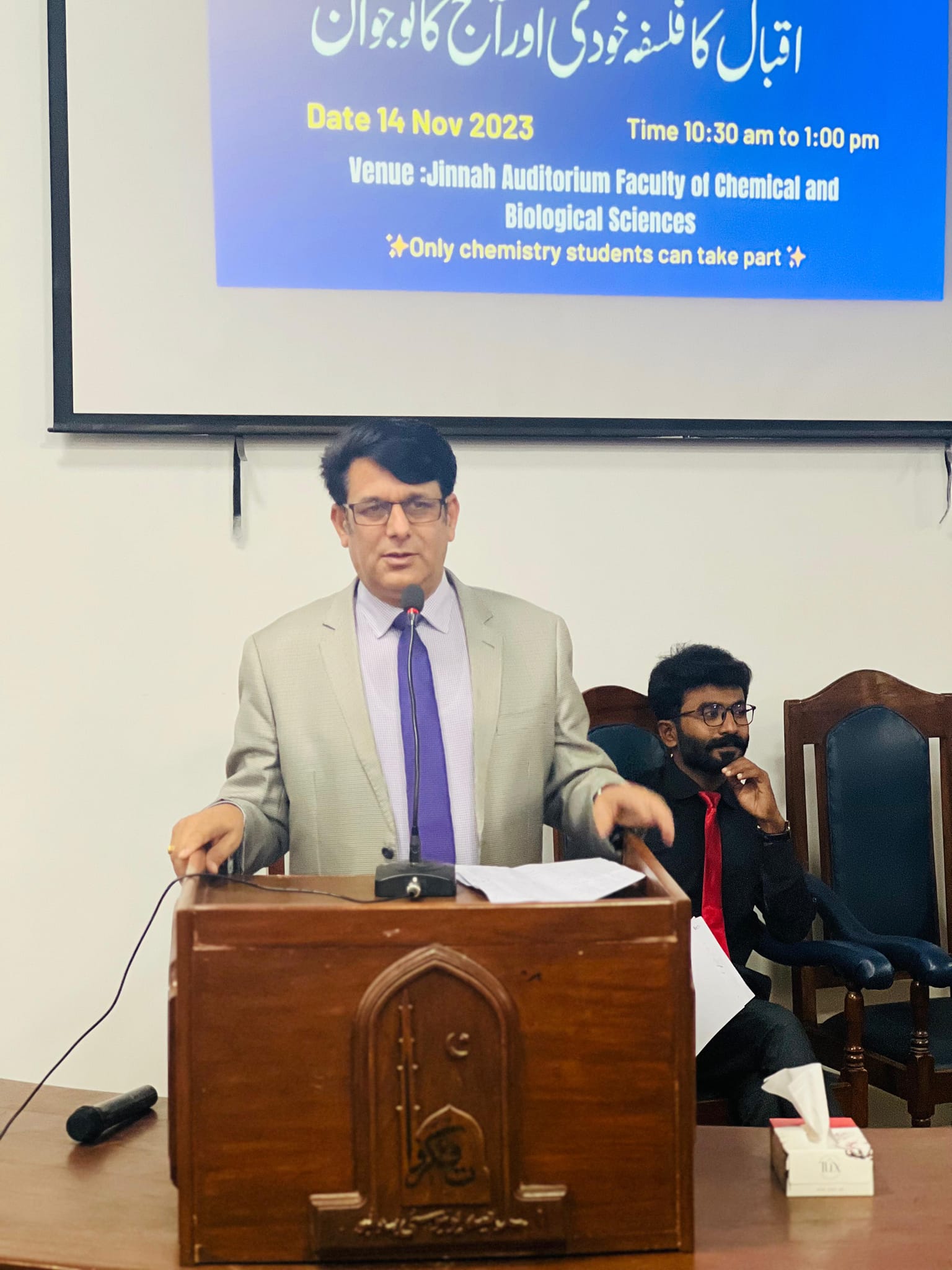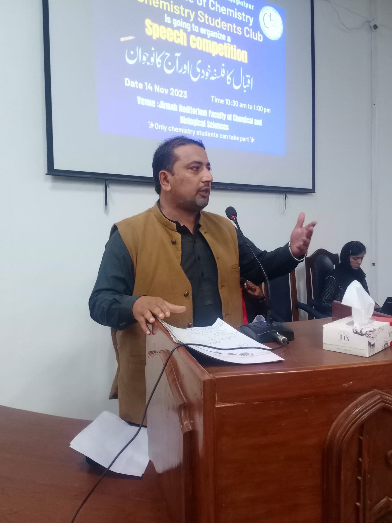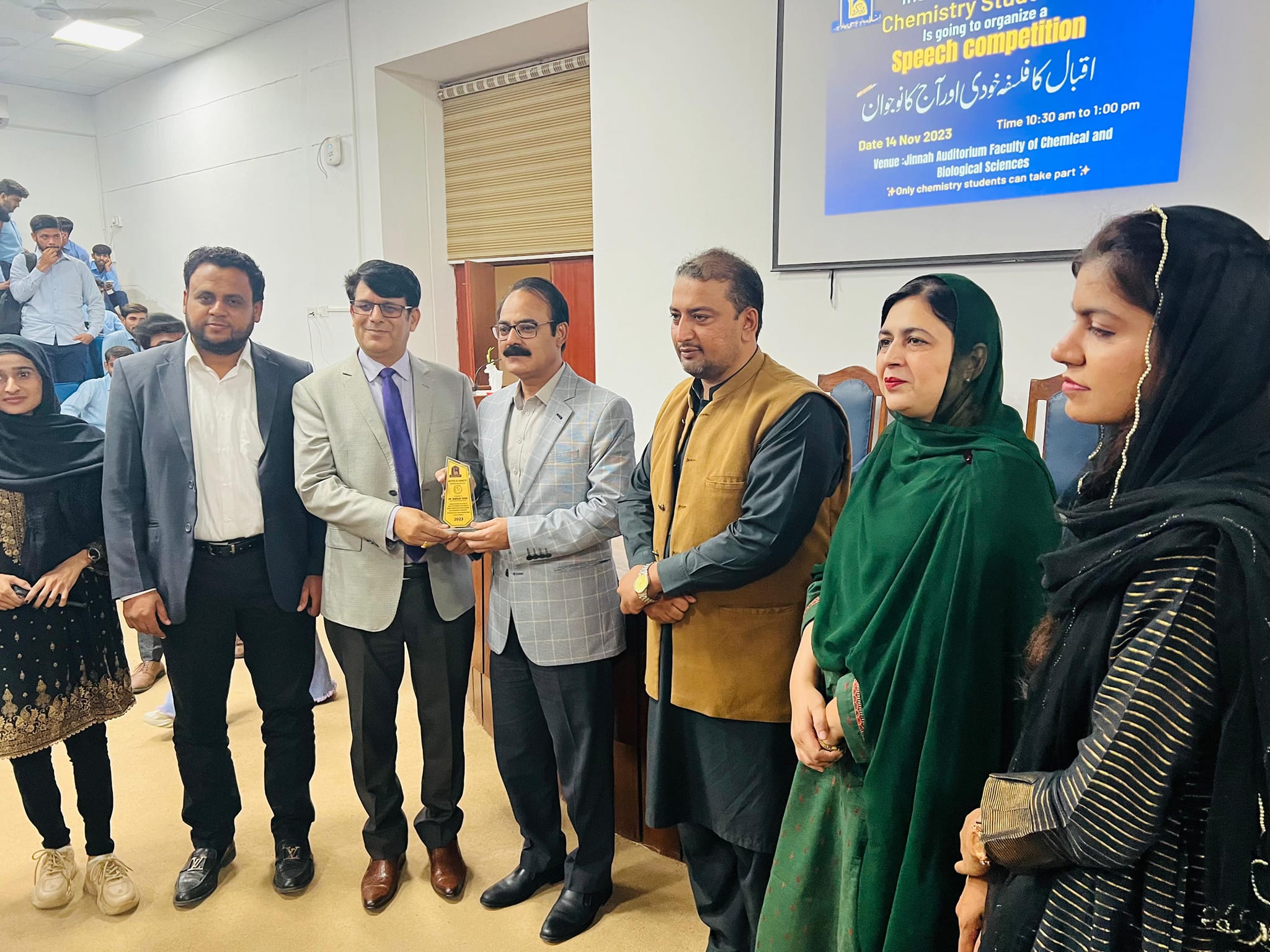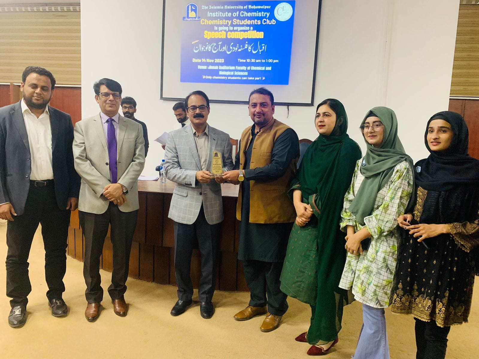 On the occasion of Iqbal Day, Chemistry Students Club, The Islamia University of Bhawalpur organized a speech competition on 14 November 2023 at Jinnah Auditorium, Faculty of Chemical & Biological Sciences.