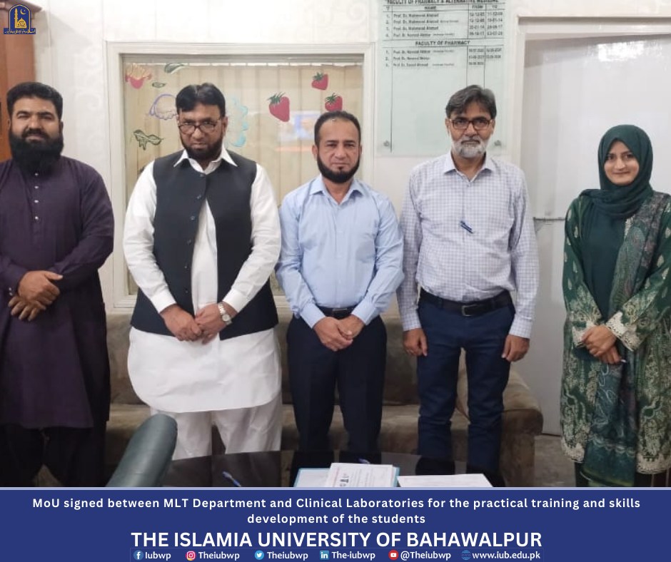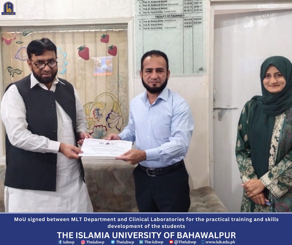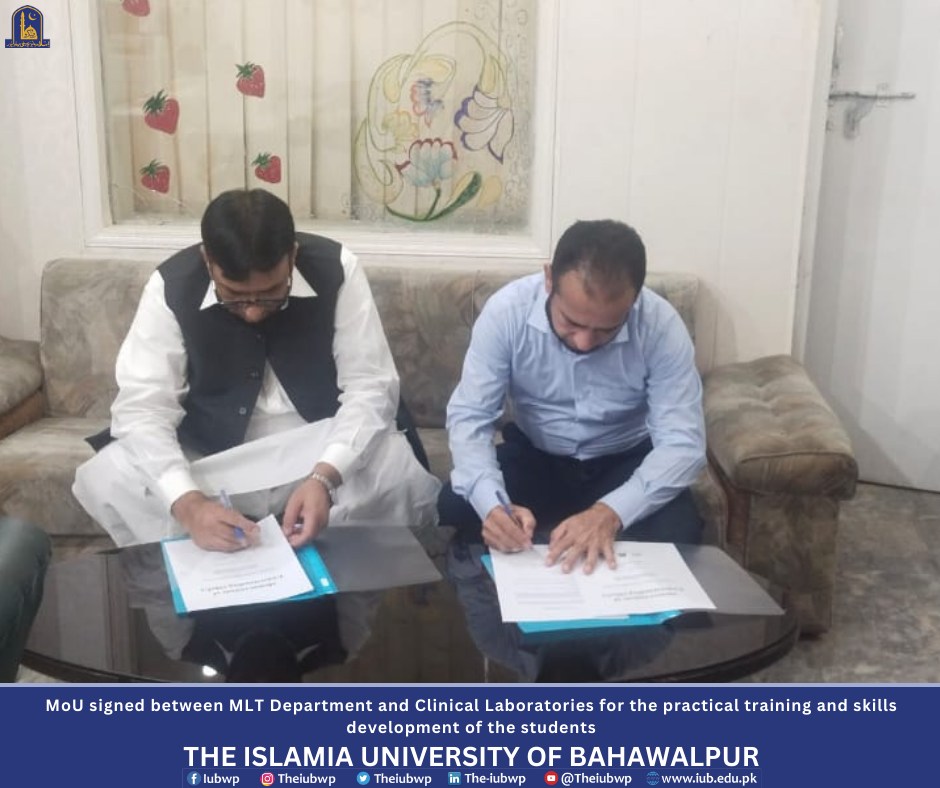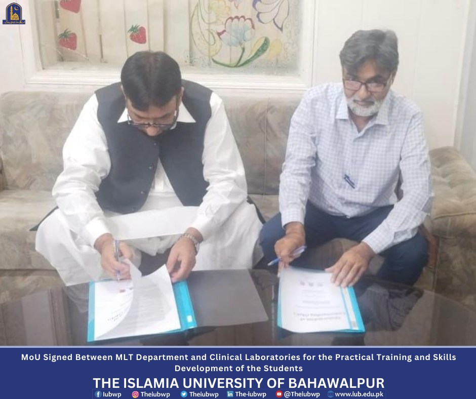 MoU has been signed between the Department of Medical Laboratory Technology (MLT), the Islamia University of Bahawalpur (IUB) and two Clinical Laboratories (Bahawalpur Laboratory and Kashif Diagnostic Laboratory) in Bahawalpur city for the practical training and skills development of the students of BS (MLT). The event was organized on Monday 14 October 2024 at Khawaja Farid Campus.