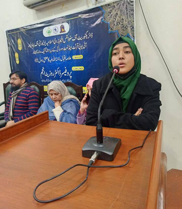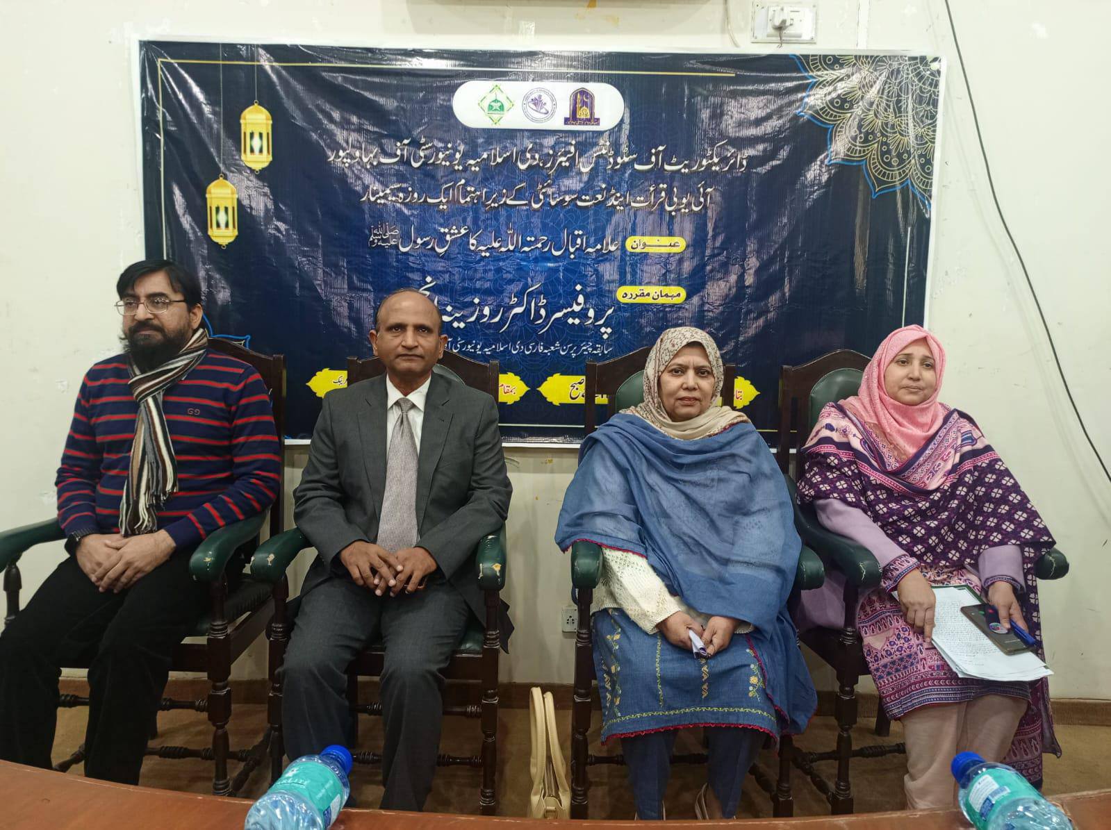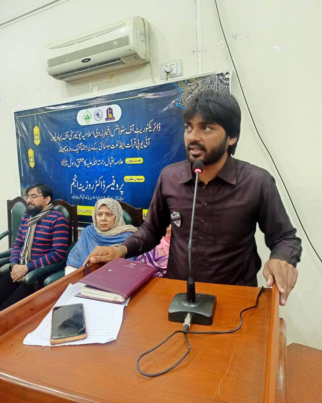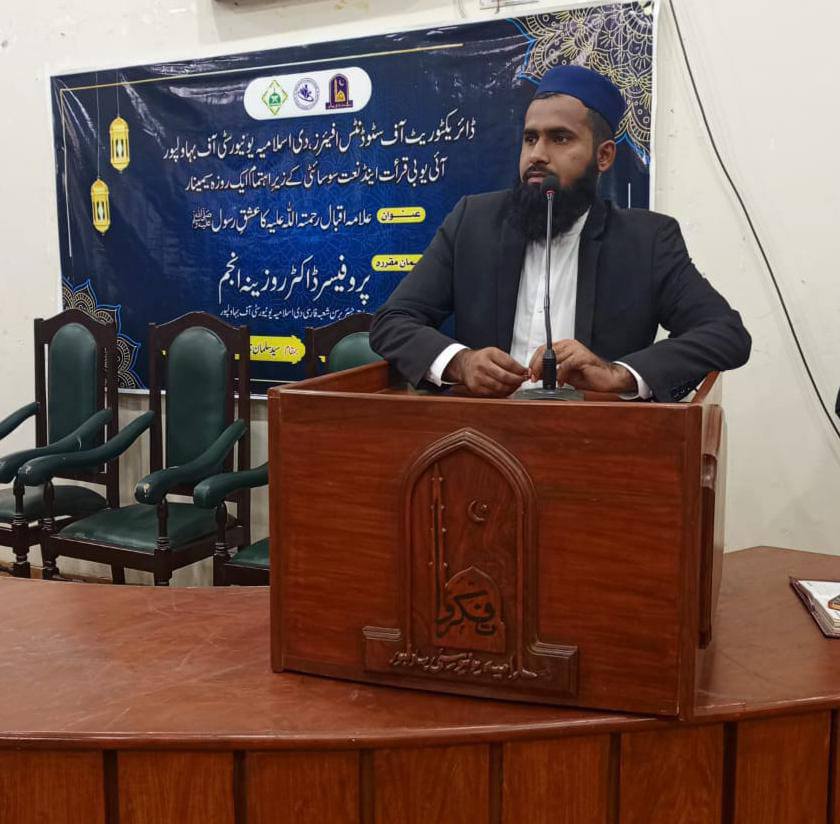 A seminar titled "علامہ اقبال رحمۃ اللہ علیہ کا عشق رسولﷺ" was organized by the IUB Qiraat and Naat Society Directorate of Student Affairs in the auditorium of the Faculty of Islamic Learning, Islamia University of Bahawalpur.