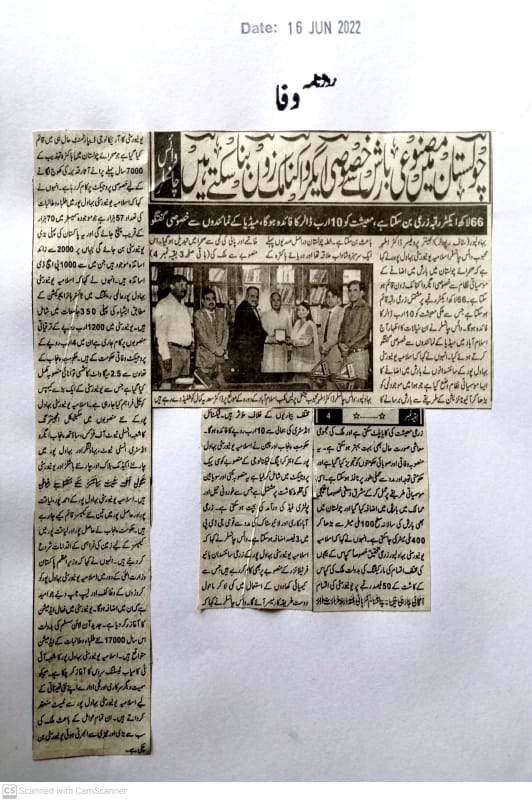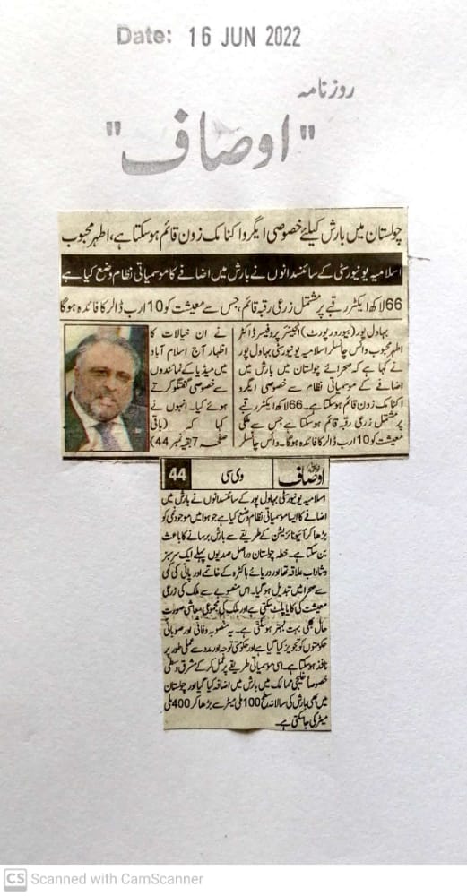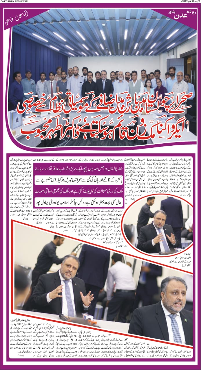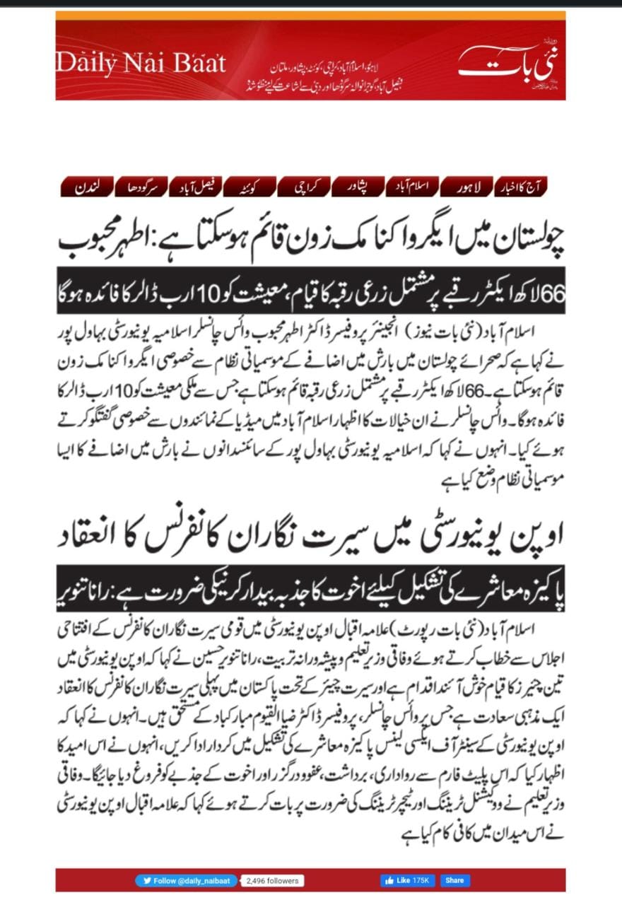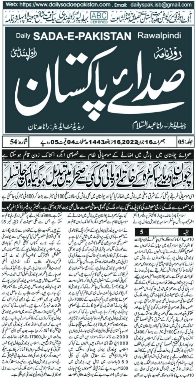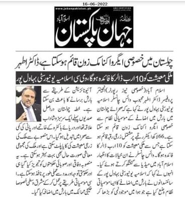 This was stated by Engr. Prof. Dr. Athar Mahboob while talking to media in Islamabad. During the talks, they proposed to set up an agro-economic zone in Cholistan to mitigate the effects of the famine. He said that an agricultural area of 6.6 million acres could be established which could benefit the national economy to the tune of 10 Billion USD.