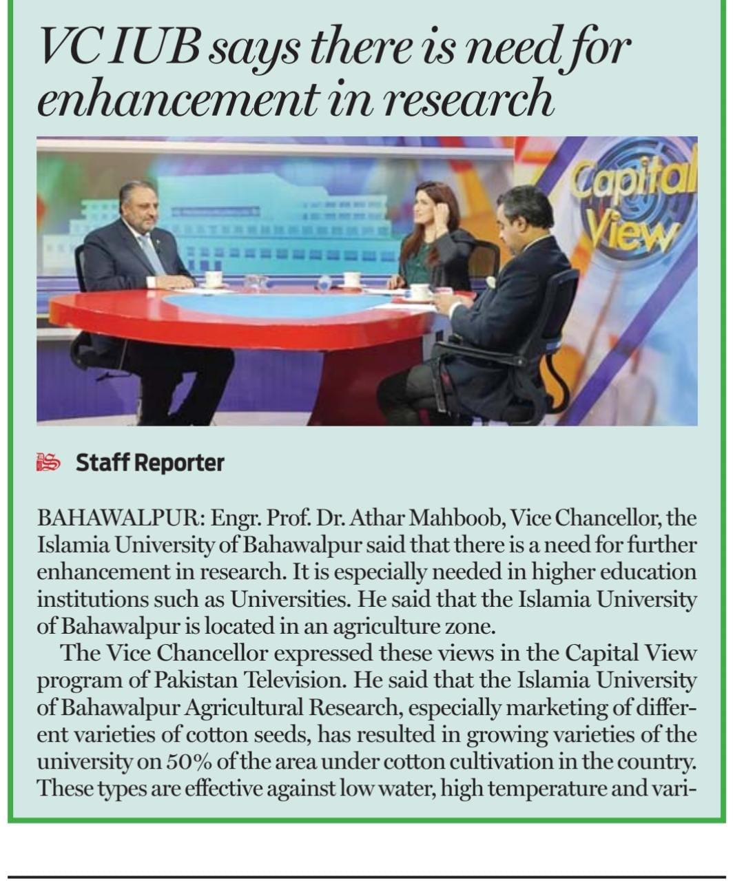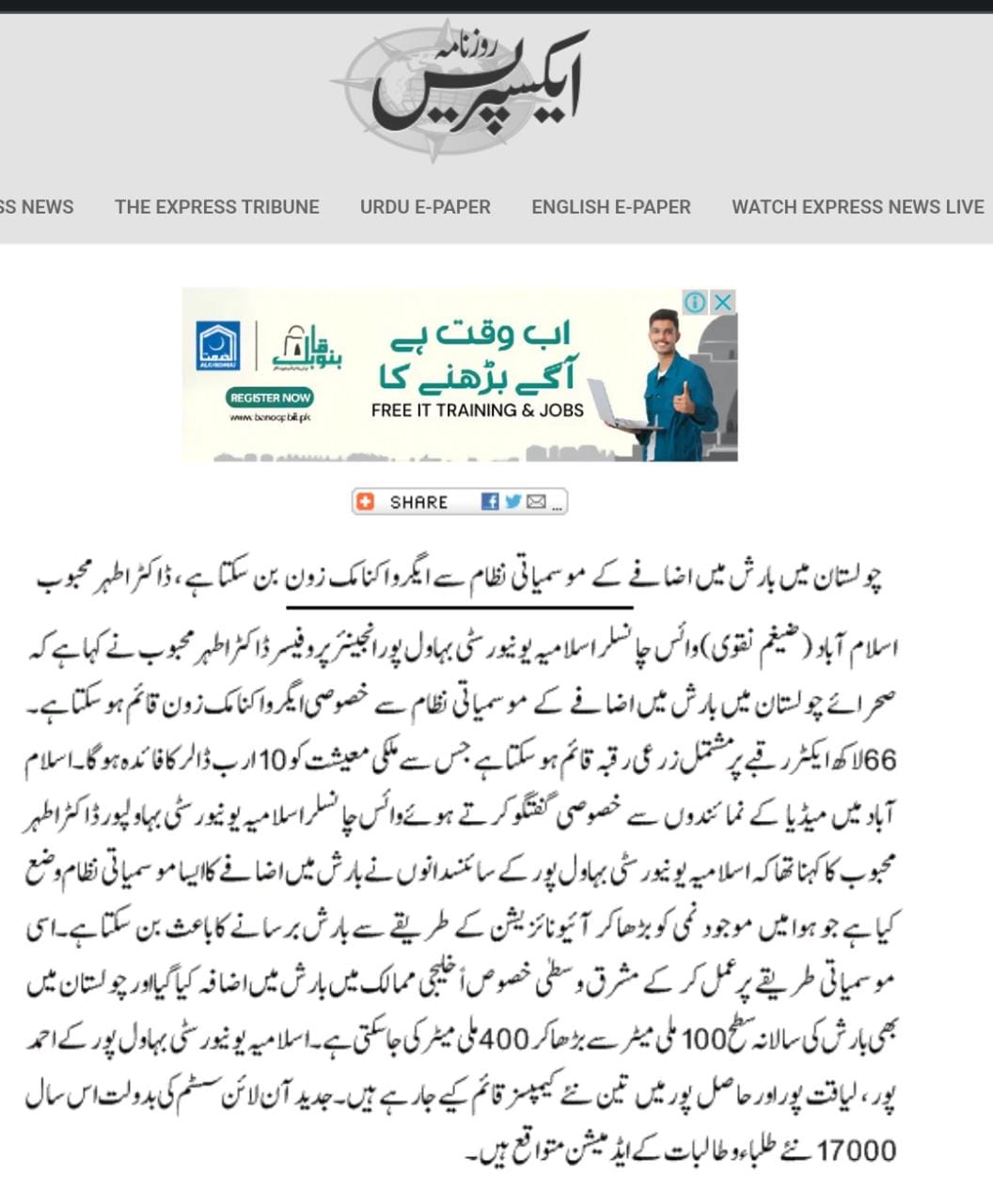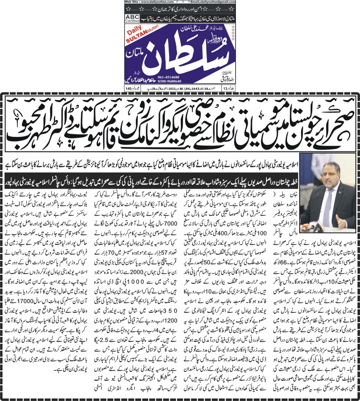 This was stated by Engr. Prof. Dr. Athar Mahboob while talking to media in Islamabad. During the talks, they proposed to set up an agro-economic zone in Cholistan to mitigate the effects of the famine. He said that an agricultural area of 6.6 million acres could be established which could benefit the national economy to the tune of 10 Billion USD.