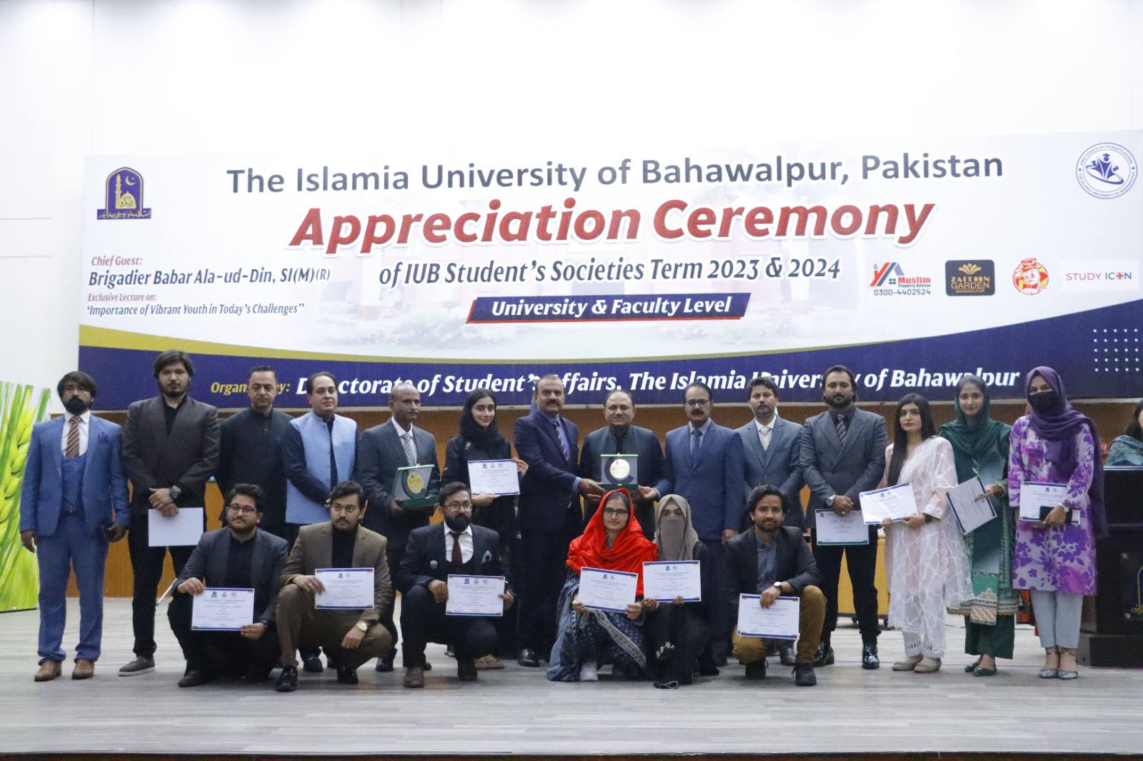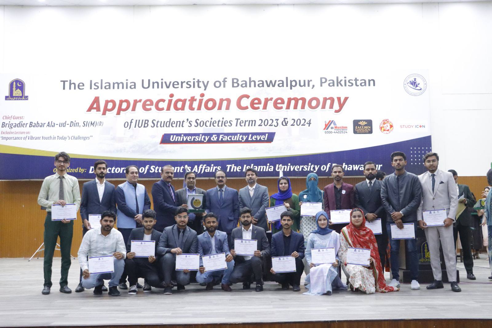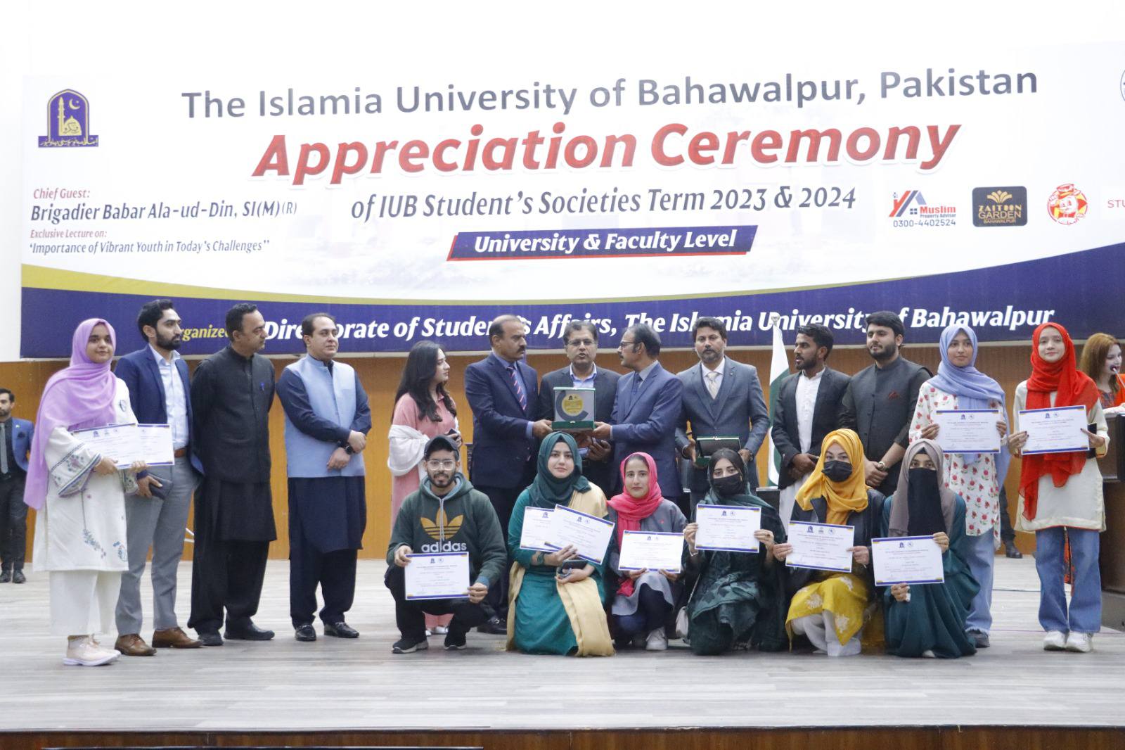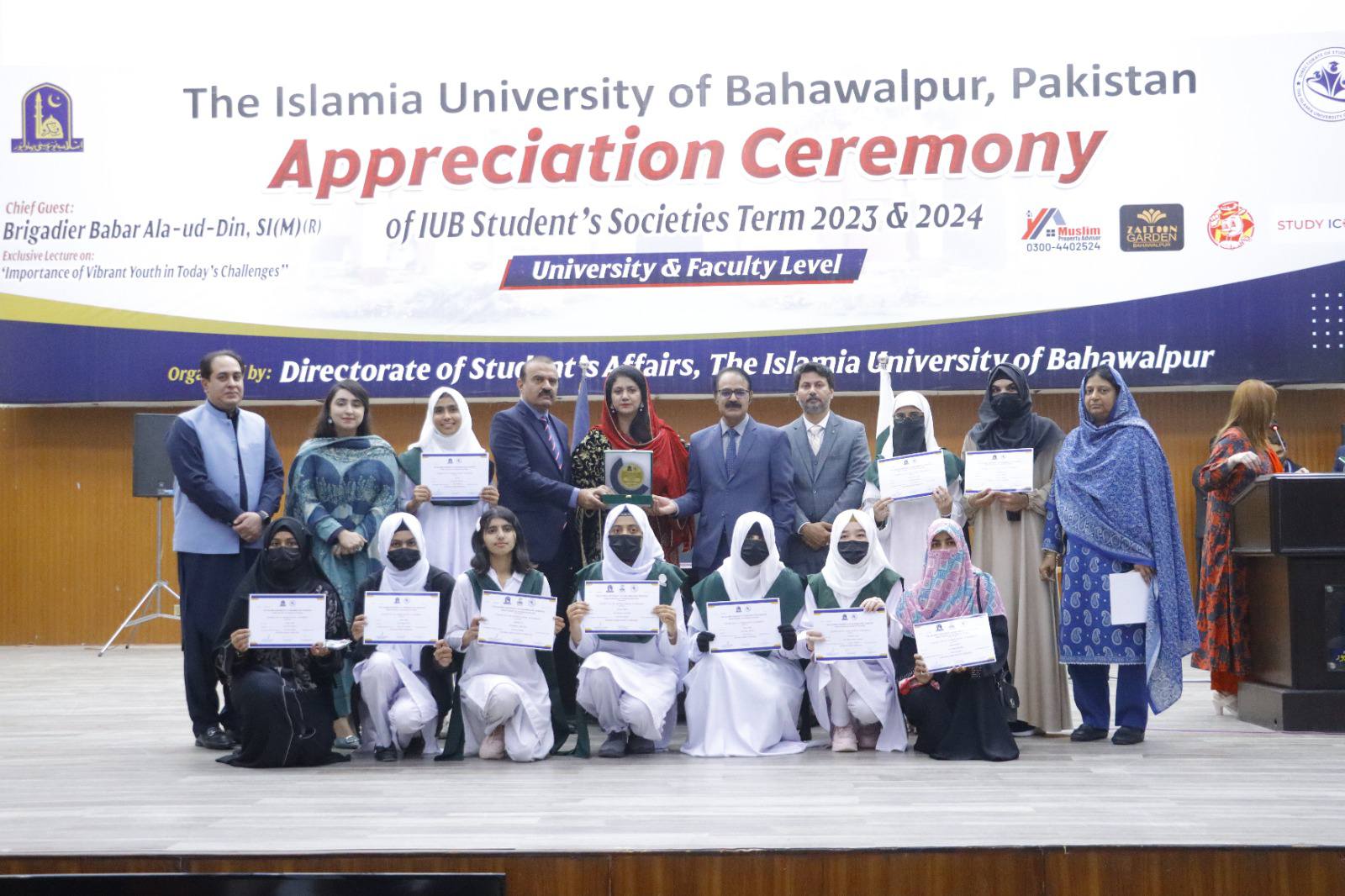 27 February 2025: The Islamia University of Bahawalpur organized an appreciation ceremony for student societies 2023–24 at the Khawaja Ghulam Farid Auditorium, Baghdad ul Jadeed Campus. Chairperson Chief Minister Punjab Inspection, Surveillance, and Monitoring Directorate Brigadier Babar Alauddin Sitara-e-Imtiaz Military (R) was the chief guest on this occasion.