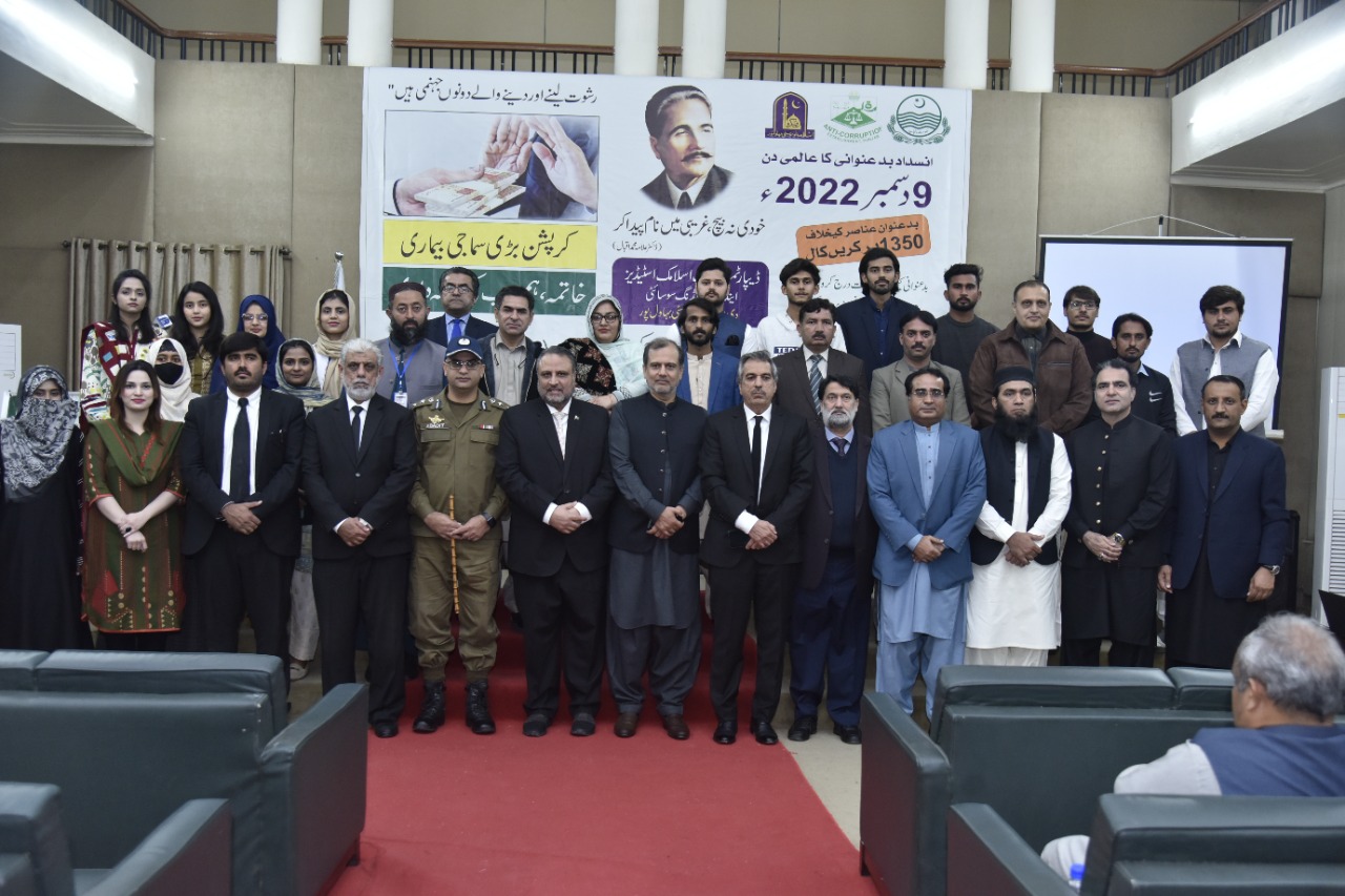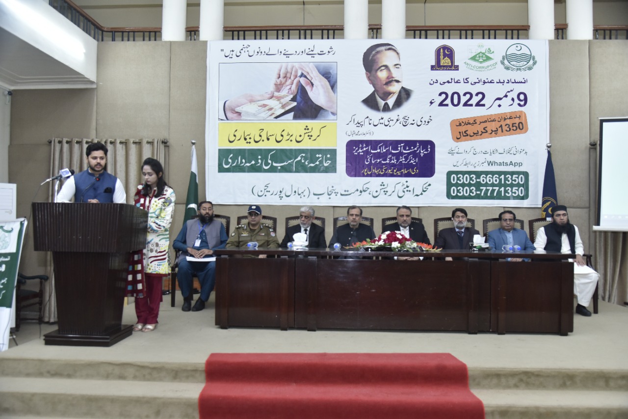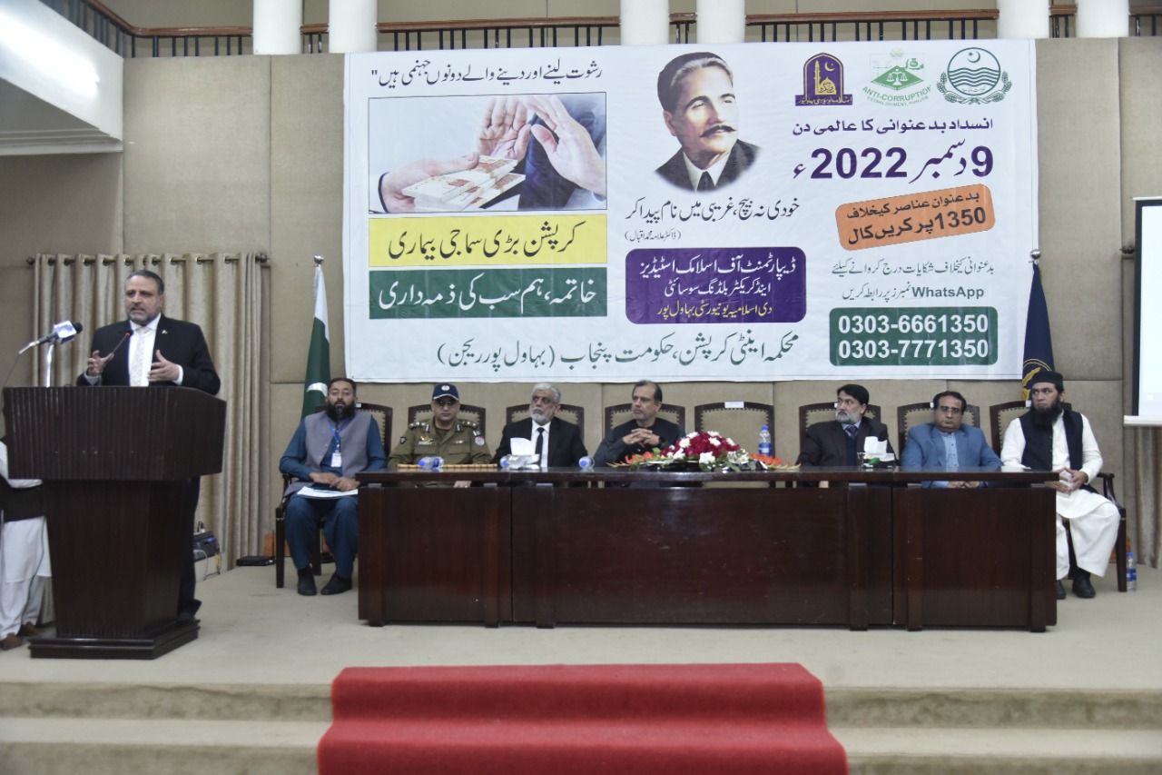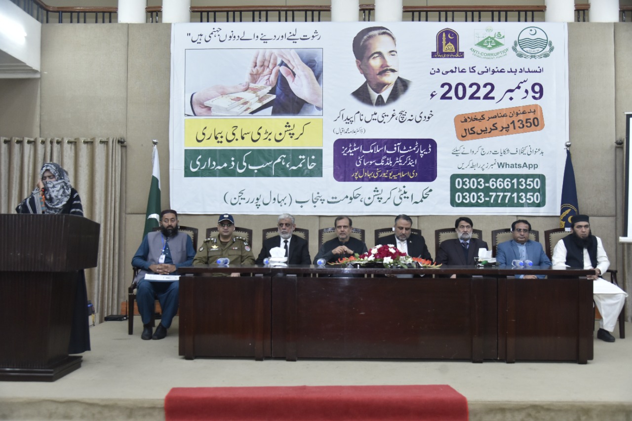 The Islamia University of Bahawalpur and Department of Anti-Corruption Government of Punjab Bahawalpur organized an awareness seminar on the occasion of World Anti-Corruption Day at Abbasia Campus.