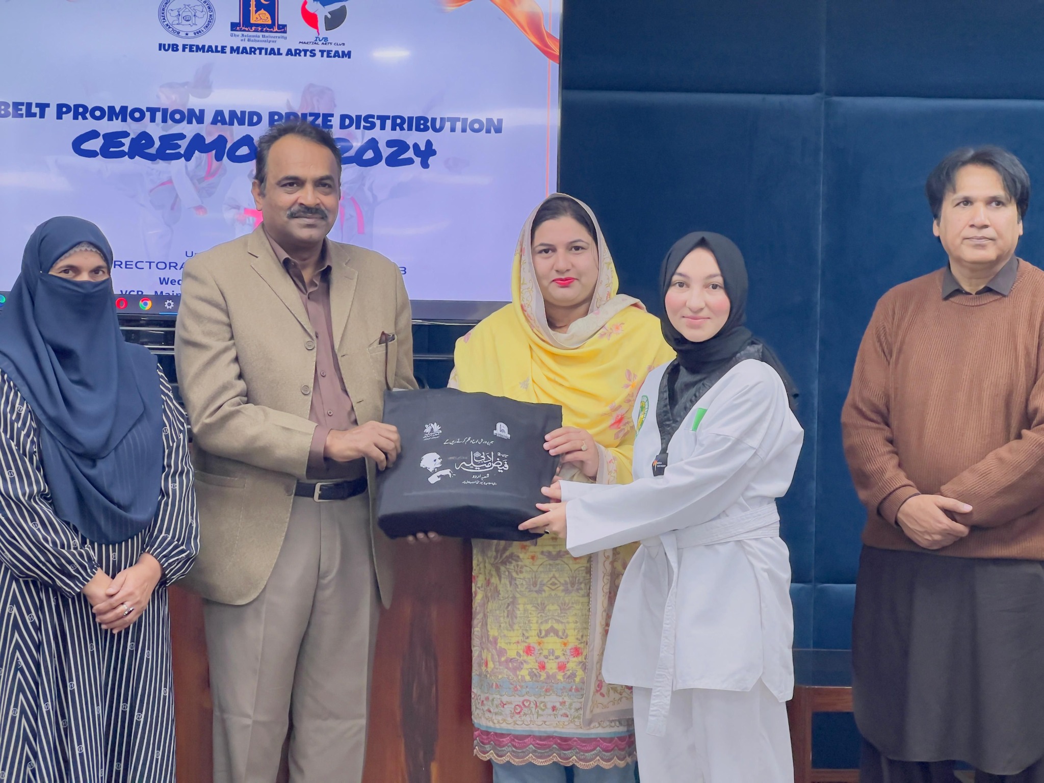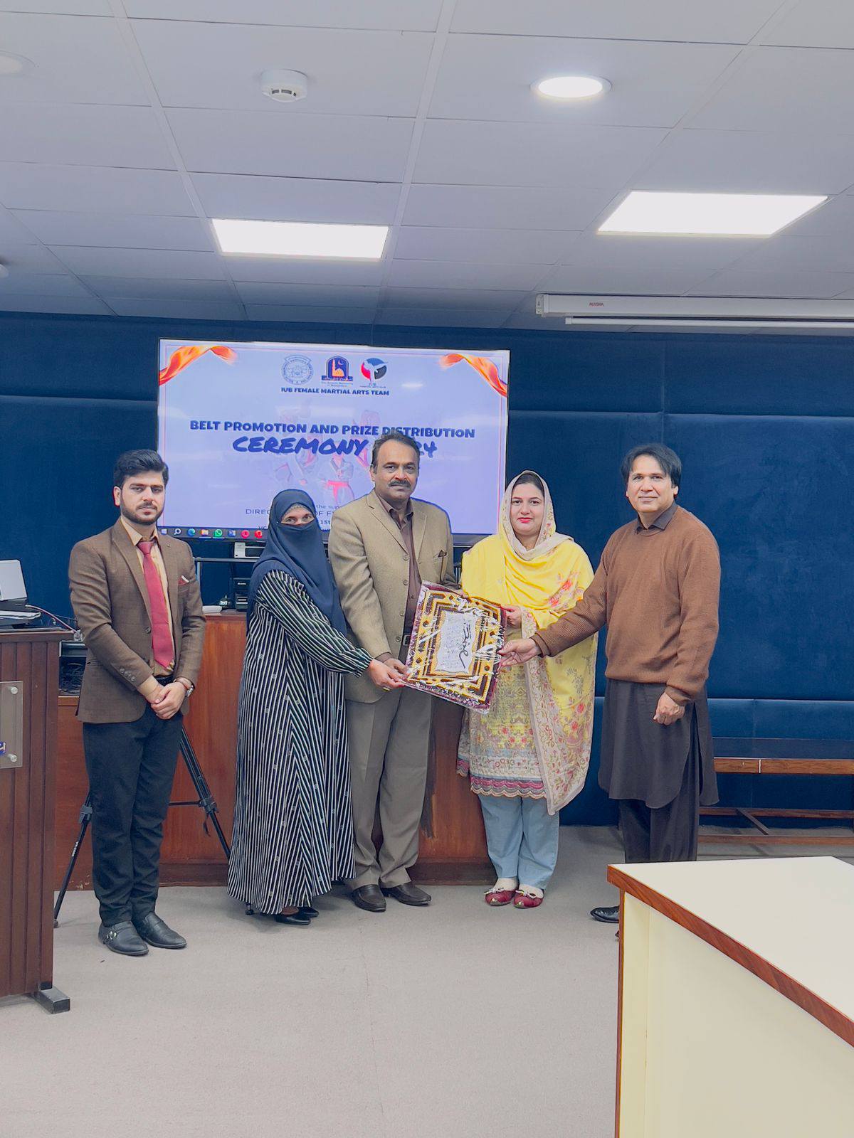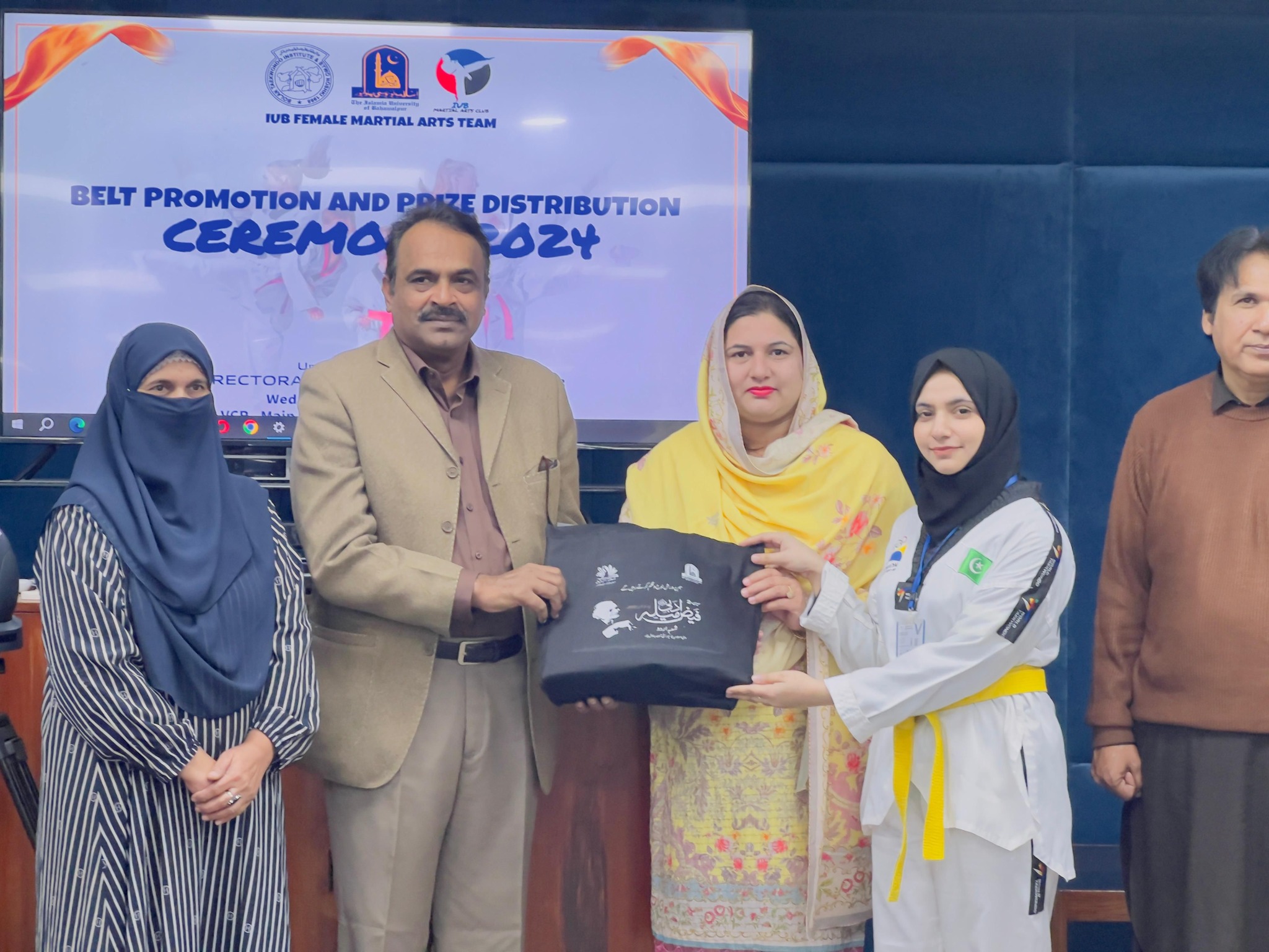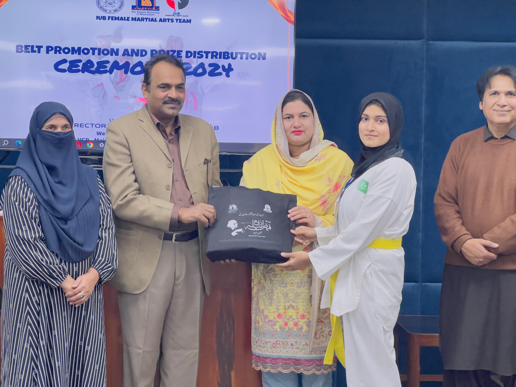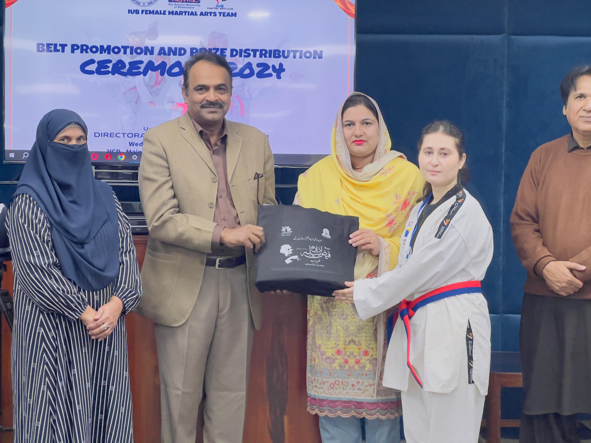The Directorate of Female Sports at Islamia University of Bahawalpur held a belt promotion ceremony for the female martial arts team. Prof. Dr. Syed Amir Sohail, the Dean of the Faculty of Arts and Languages, was the chief guest.