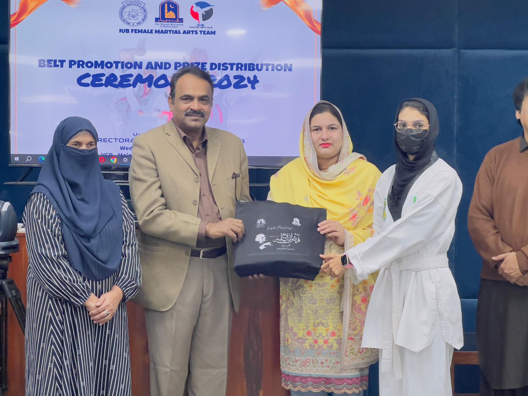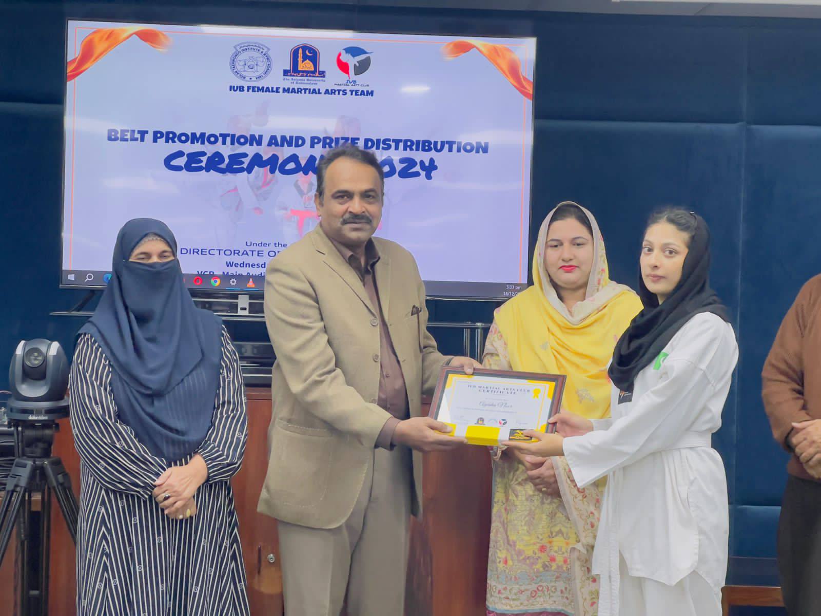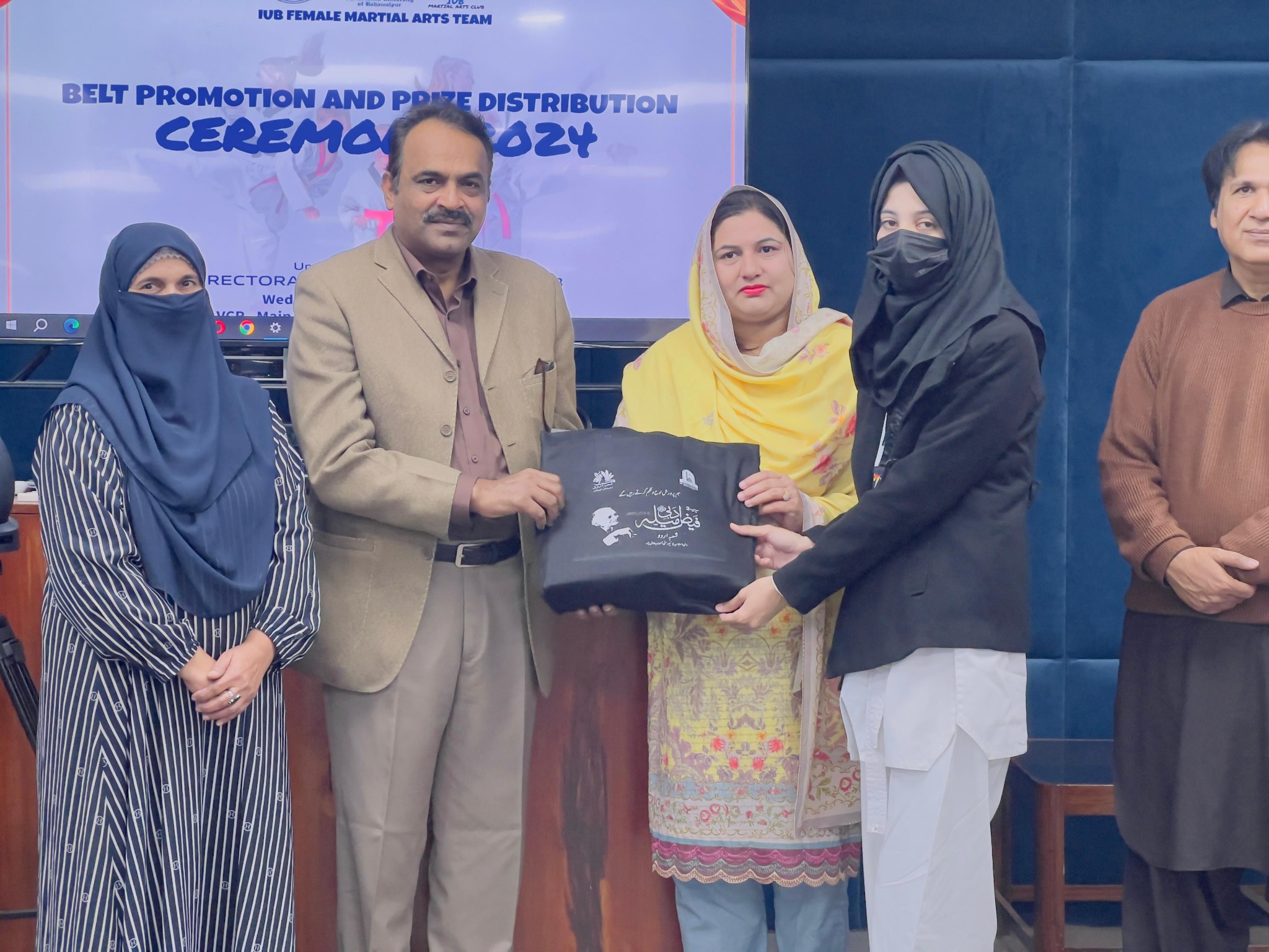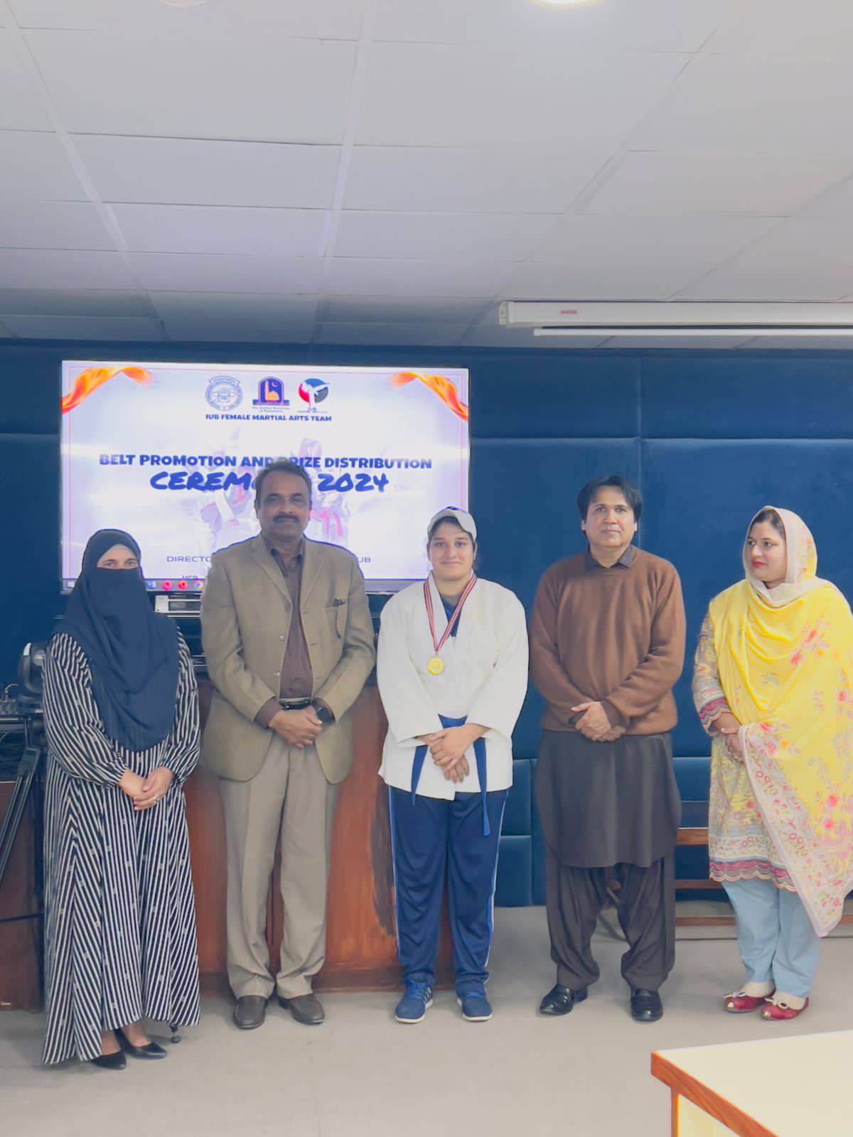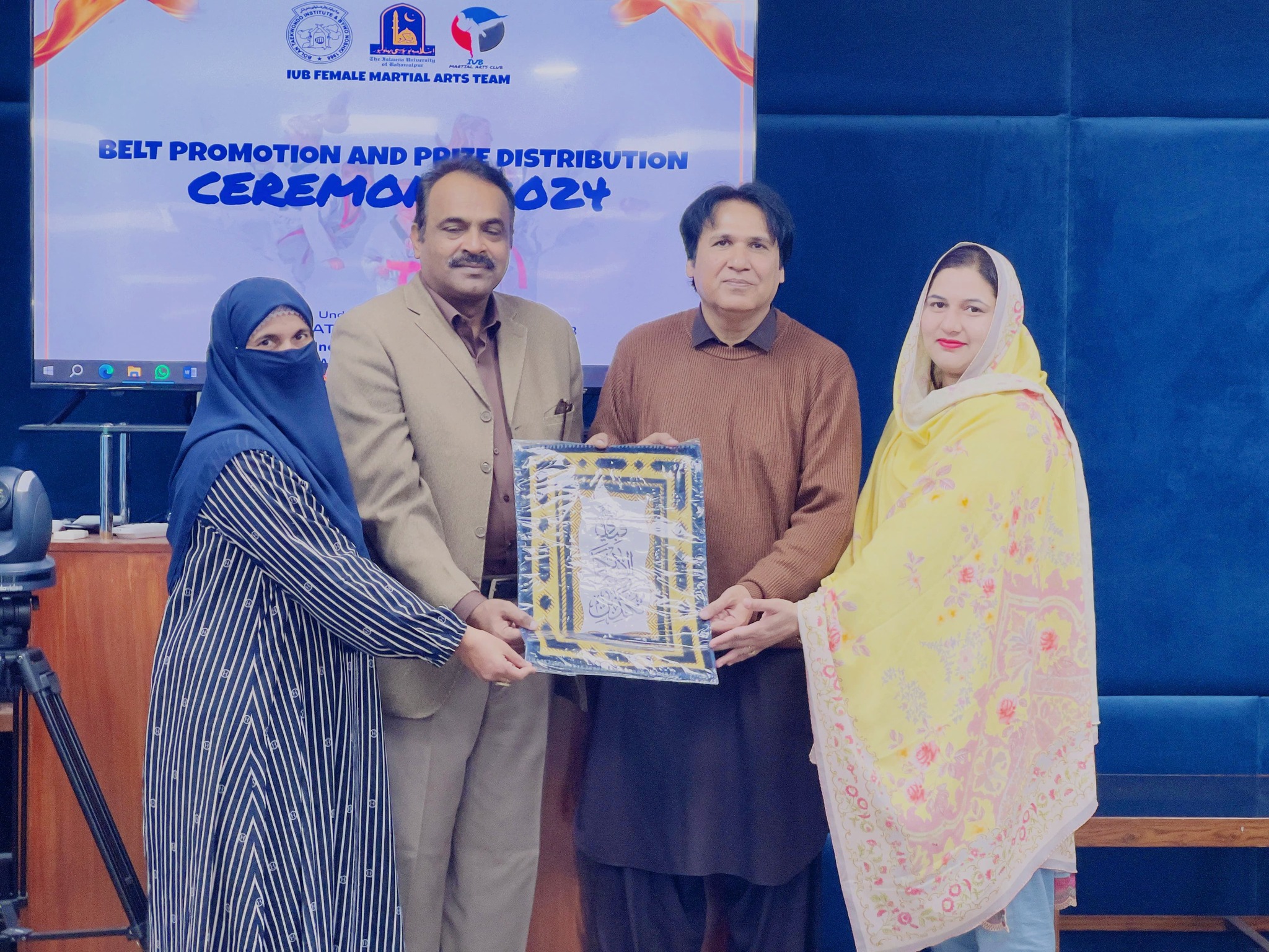 The Directorate of Female Sports at Islamia University of Bahawalpur held a belt promotion ceremony for the female martial arts team. Prof. Dr. Syed Amir Sohail, the Dean of the Faculty of Arts and Languages, was the chief guest.
