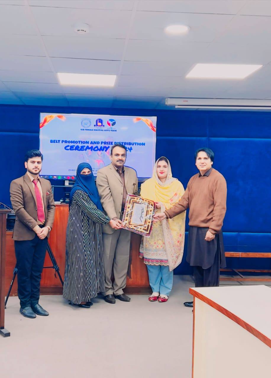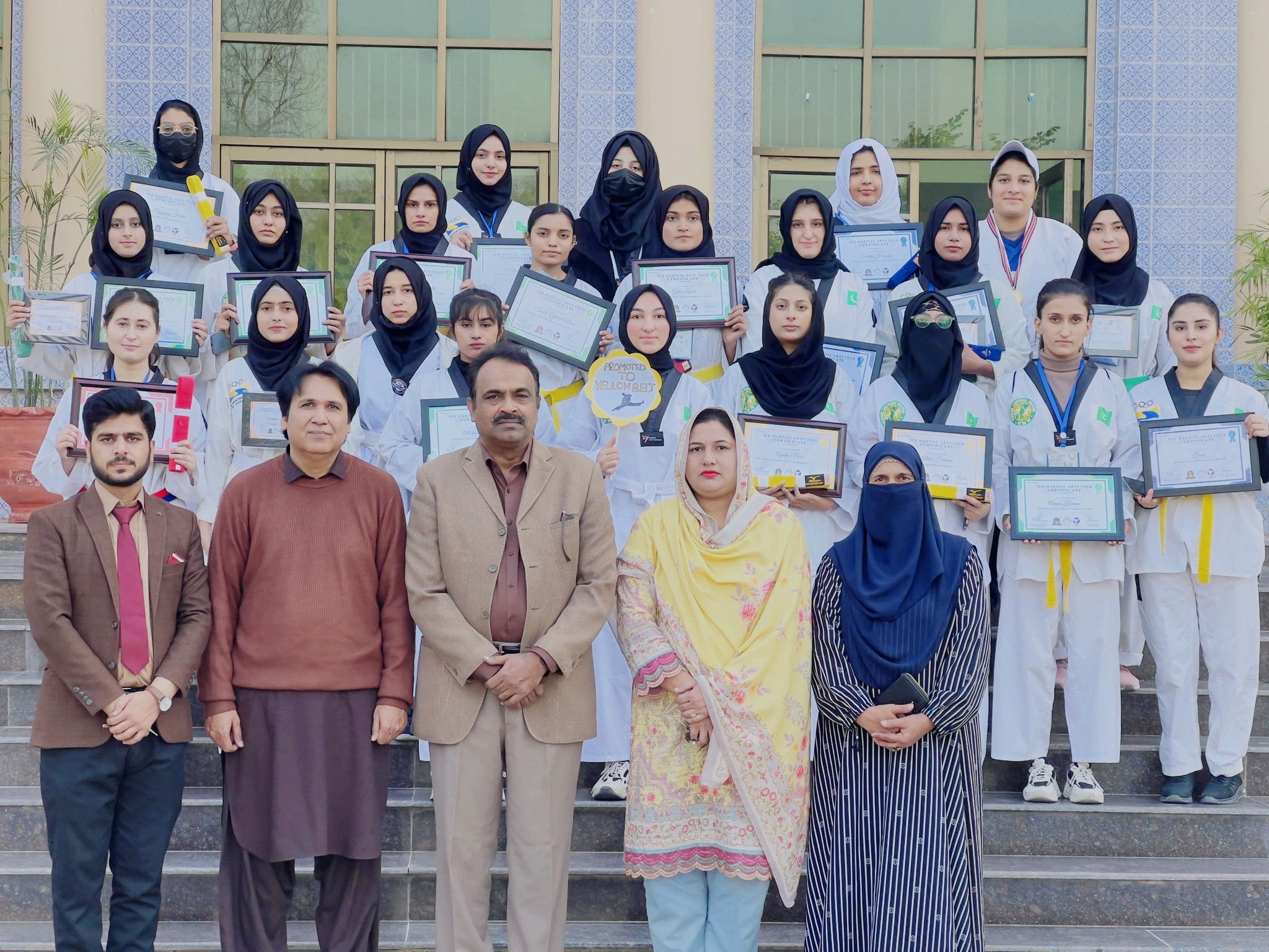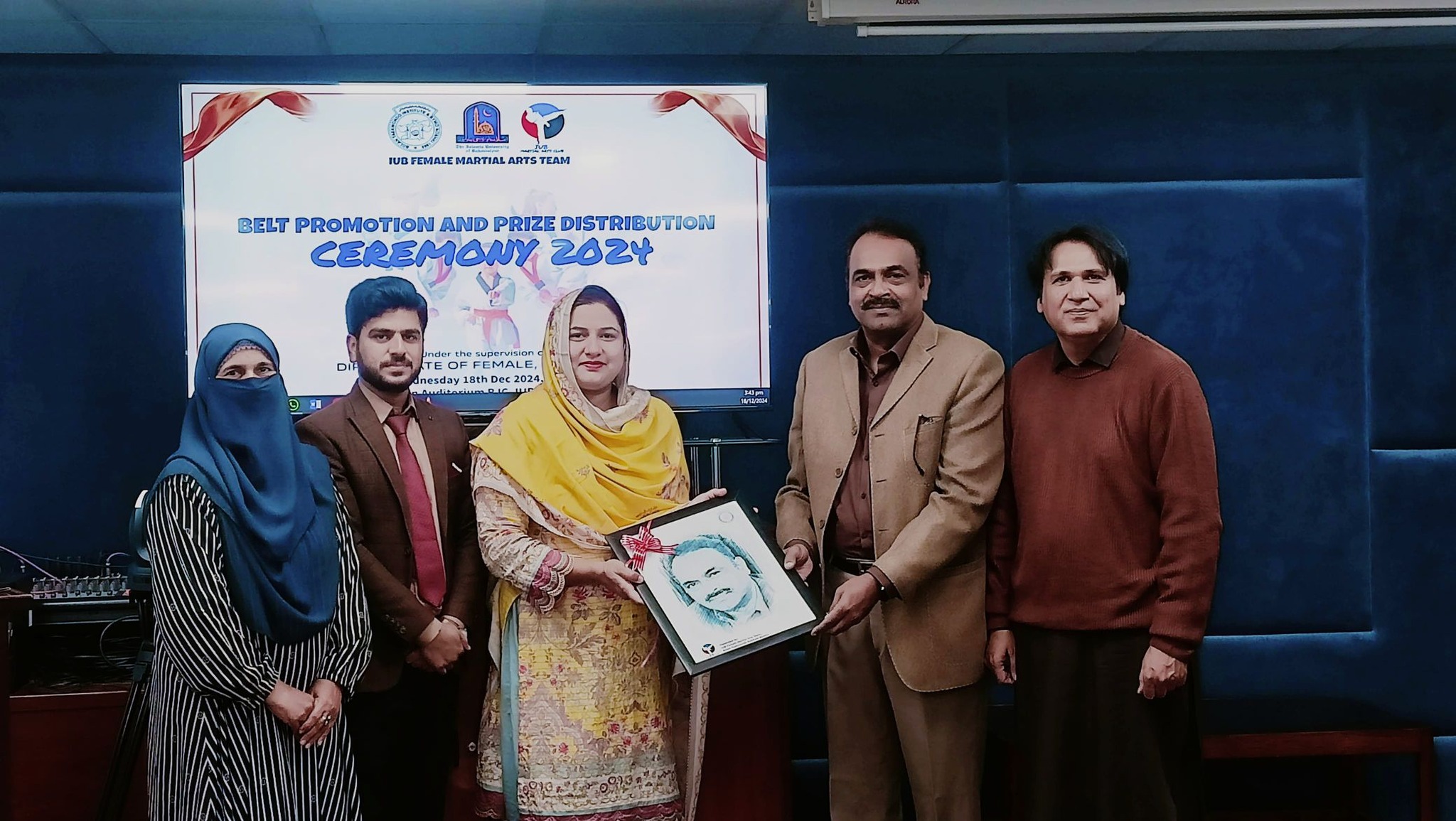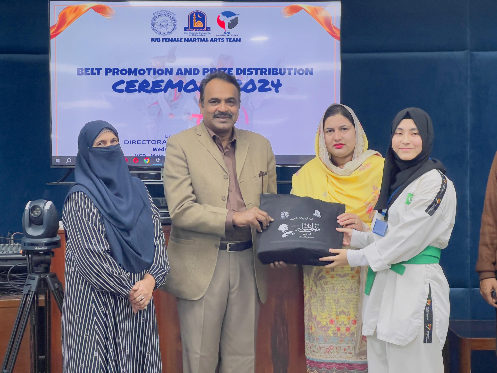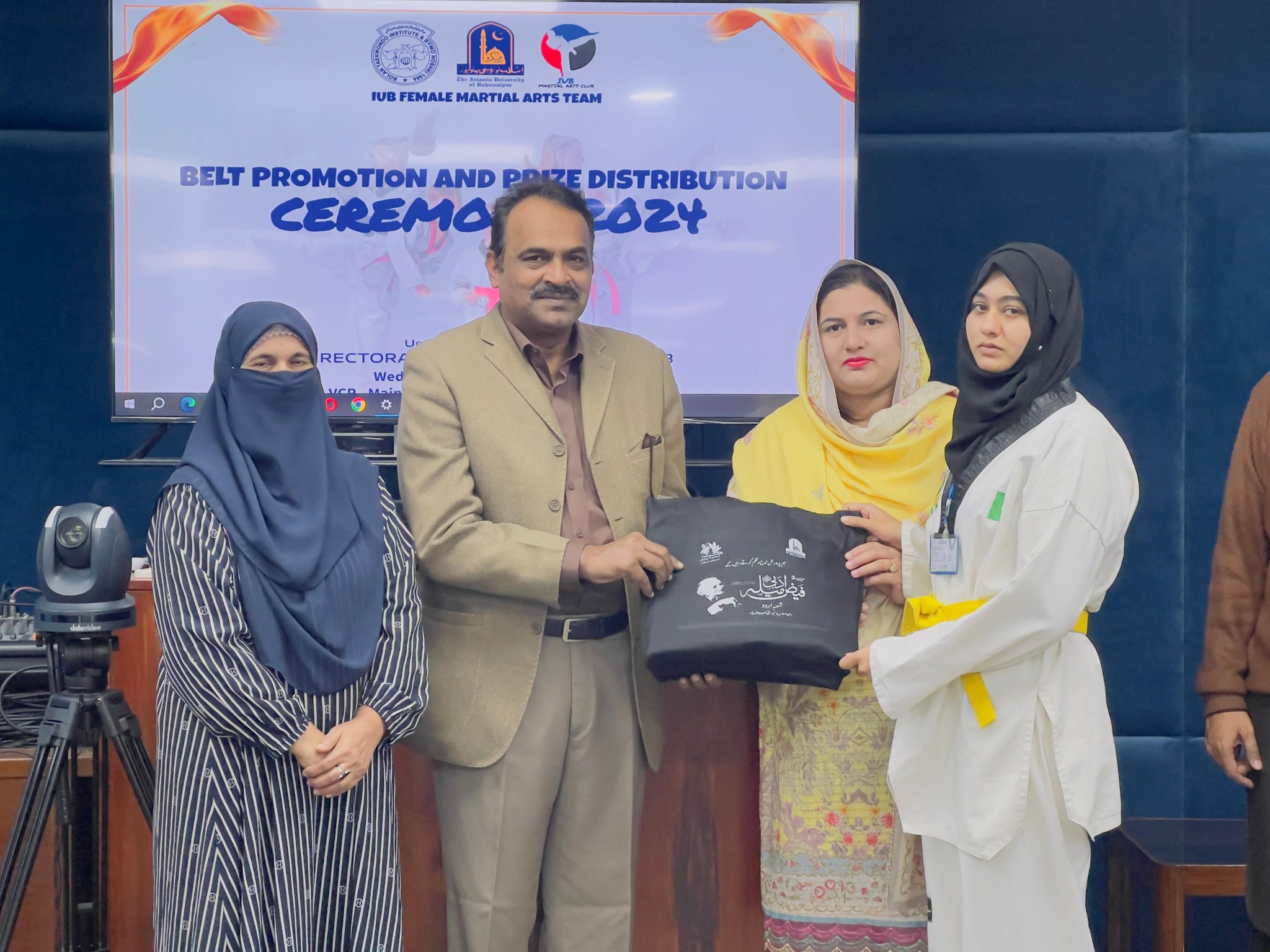 The Directorate of Female Sports at Islamia University of Bahawalpur held a belt promotion ceremony for the female martial arts team. Prof. Dr. Syed Amir Sohail, the Dean of the Faculty of Arts and Languages, was the chief guest.