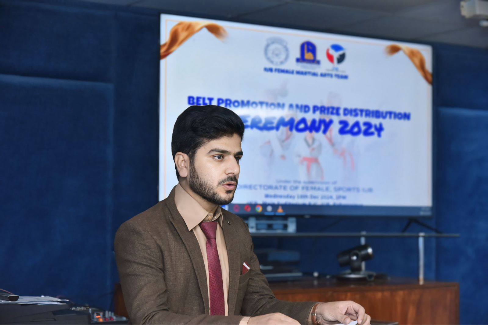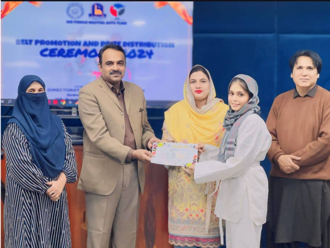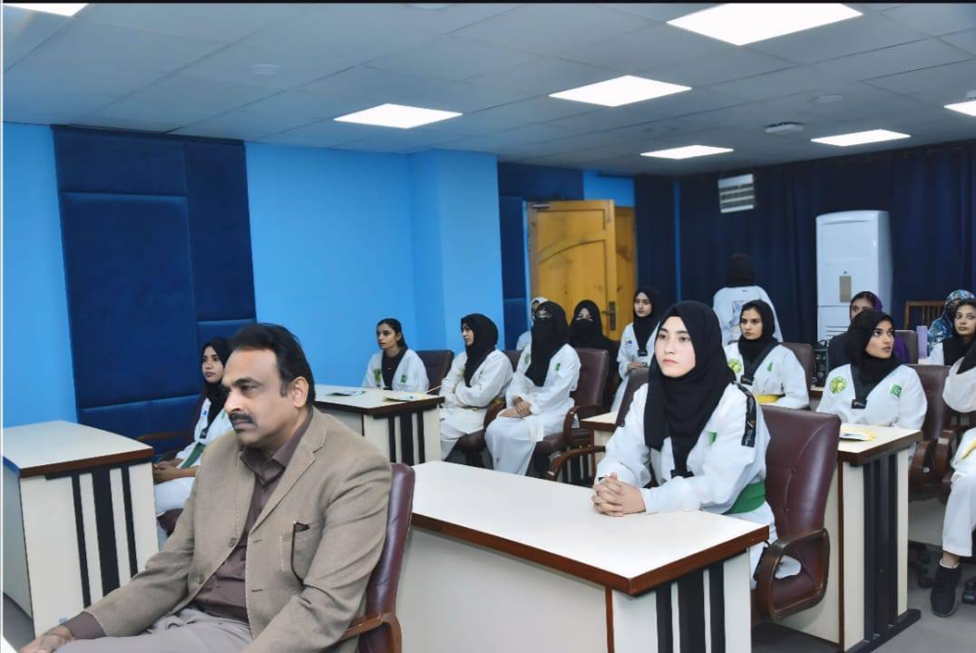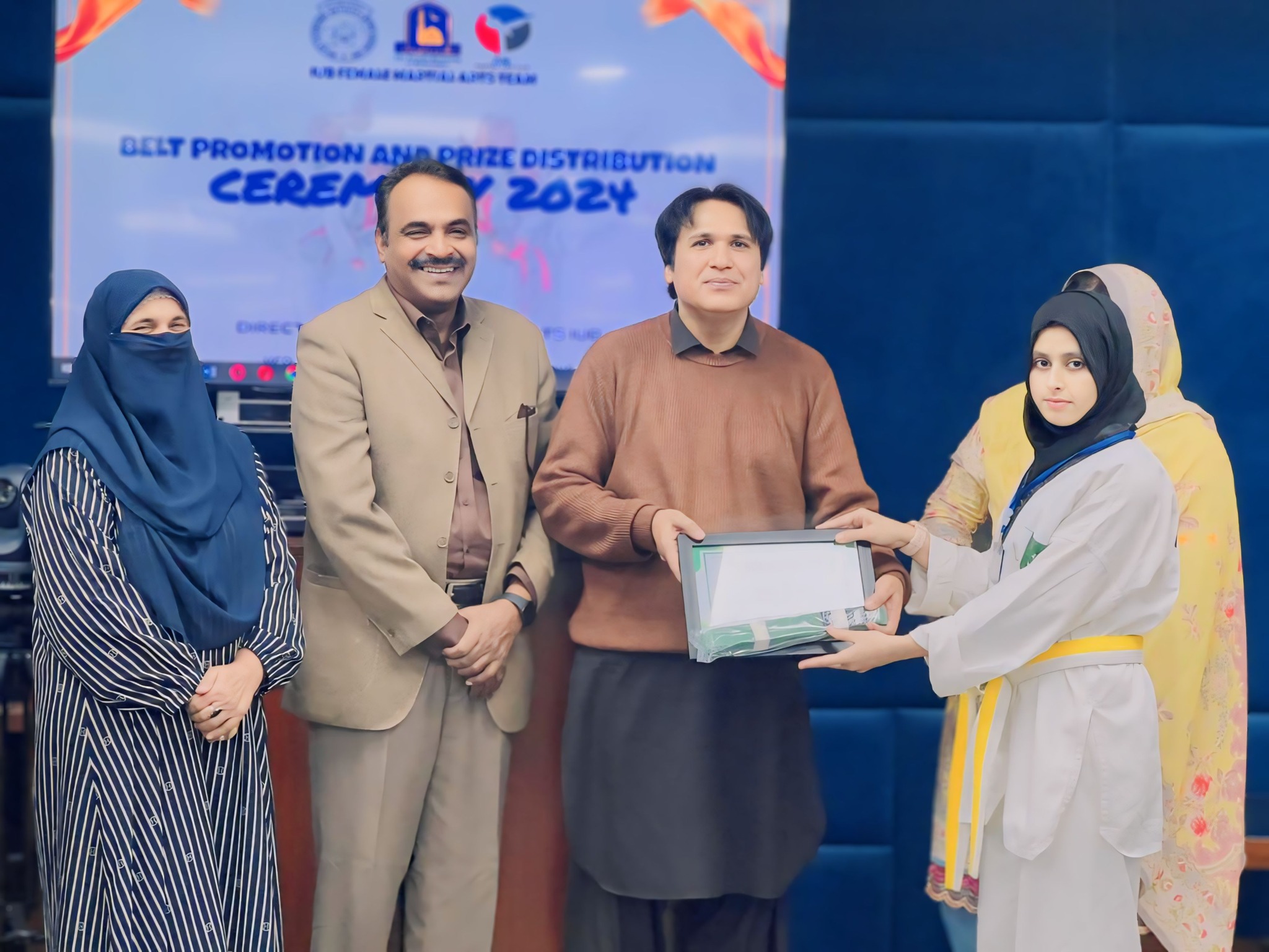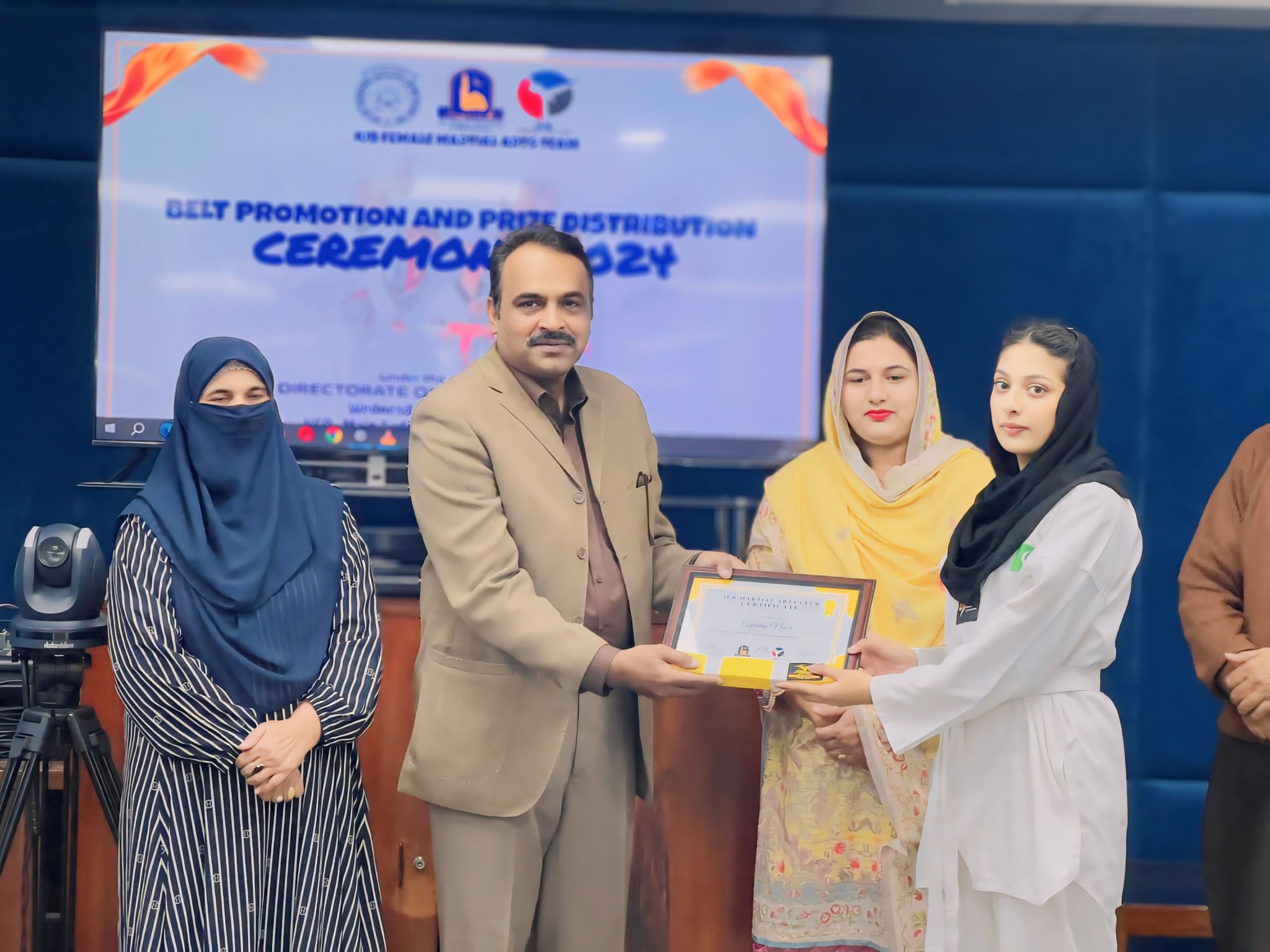 The Directorate of Female Sports at Islamia University of Bahawalpur held a belt promotion ceremony for the female martial arts team. Prof. Dr. Syed Amir Sohail, the Dean of the Faculty of Arts and Languages, was the chief guest.