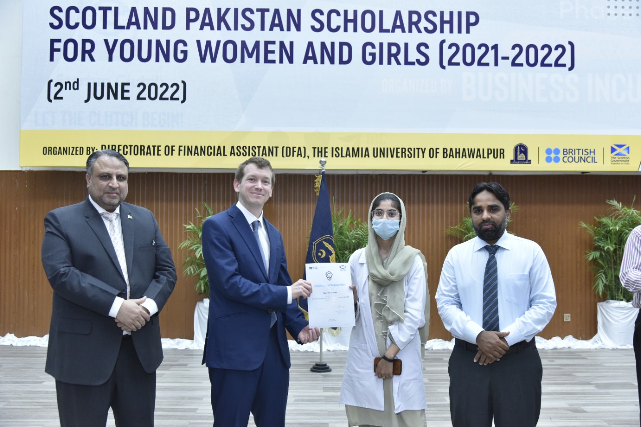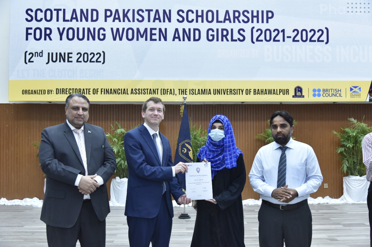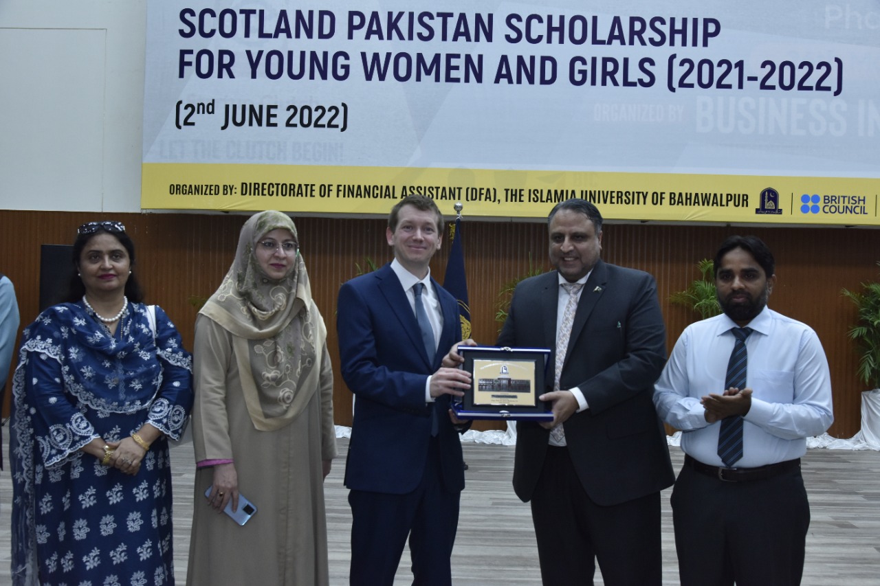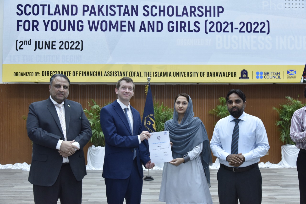 Certificates/Cheques Distribution Ceremony under Scotland Pakistan Scholarship for Females Students 2021-22 held at Main Auditorium, Baghdad-ul-Jadeed Campus, IUB. Director of British Council Sindh, Balochistan and Punjab Mr. Michael Houlgate along with Vice Chancellor Engr. Prof. Dr. Athar Mahboob and Director Financial Assistance Prof. Dr. Ghulam Hassan Abbasi distributed scholarships.