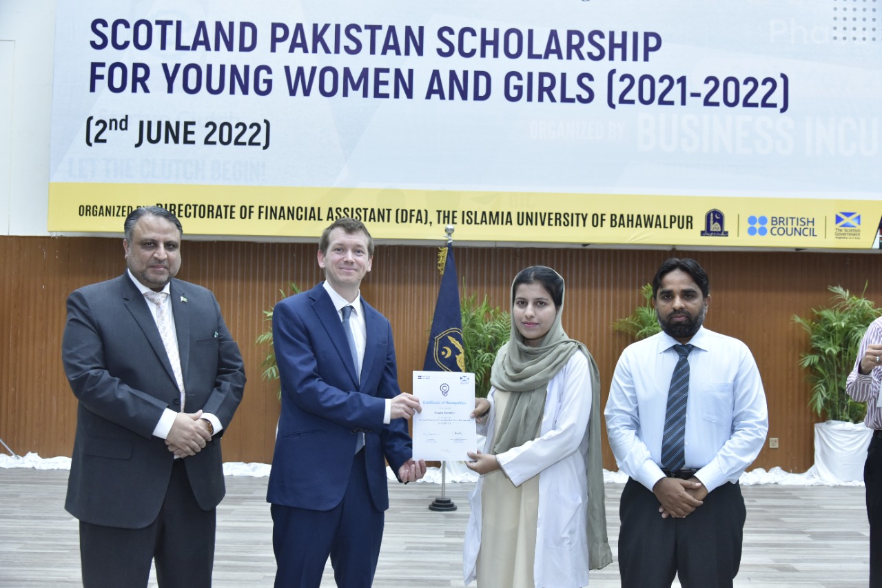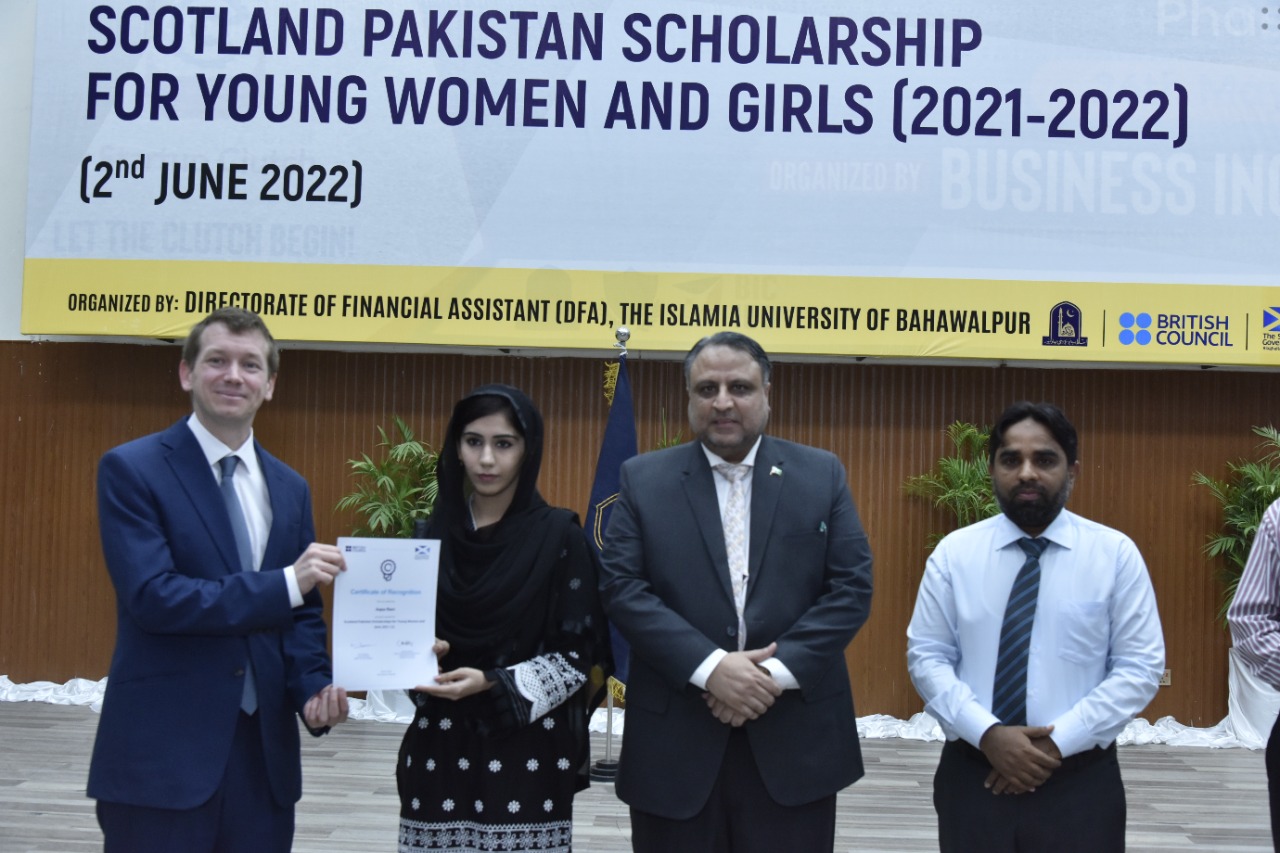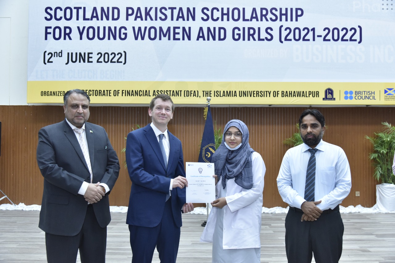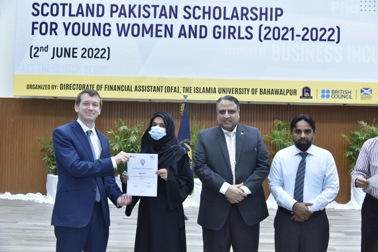 Certificates/Cheques Distribution Ceremony under Scotland Pakistan Scholarship for Females Students 2021-22 held at Main Auditorium, Baghdad-ul-Jadeed Campus, IUB. Director of British Council Sindh, Balochistan and Punjab Mr. Michael Houlgate along with Vice Chancellor Engr. Prof. Dr. Athar Mahboob and Director Financial Assistance Prof. Dr. Ghulam Hassan Abbasi distributed scholarships.