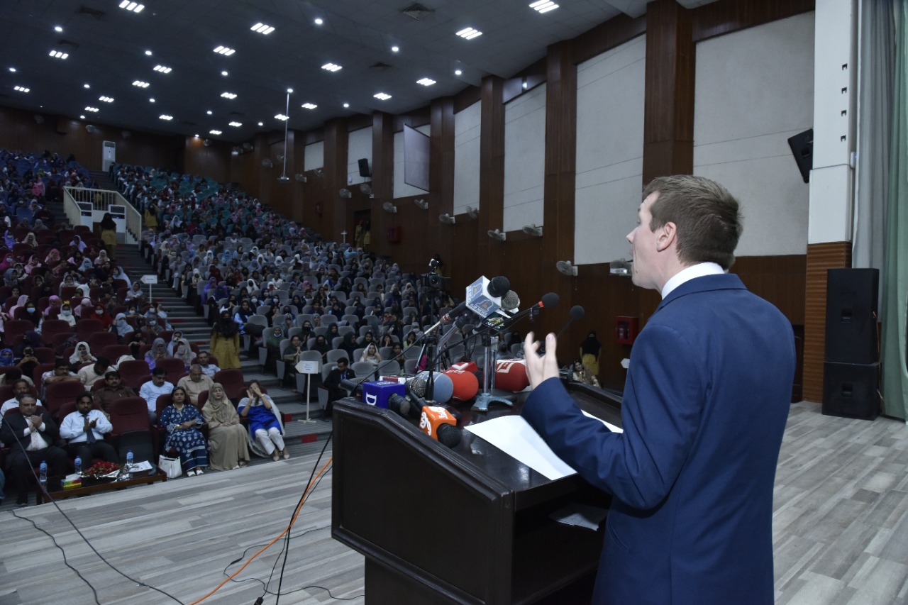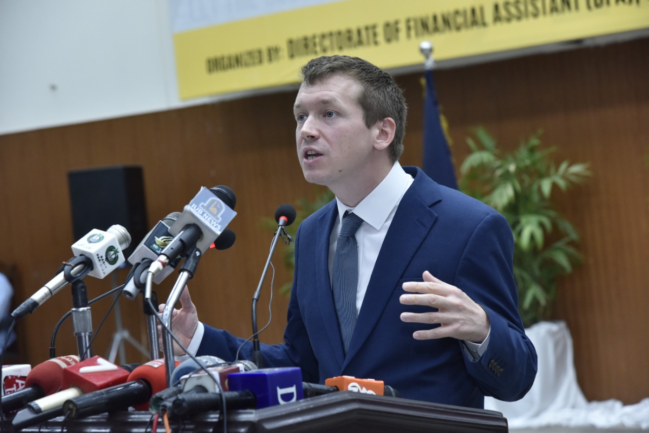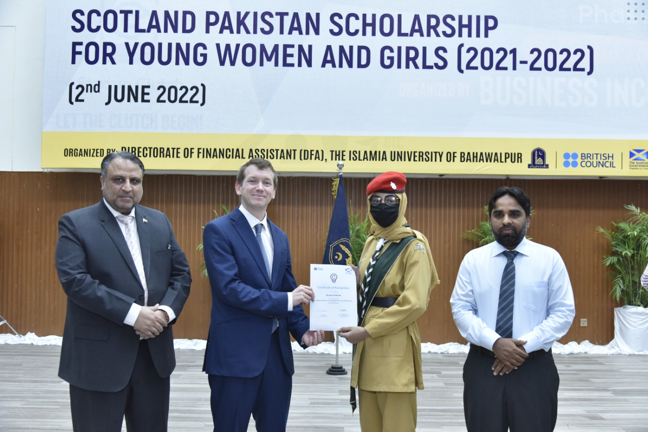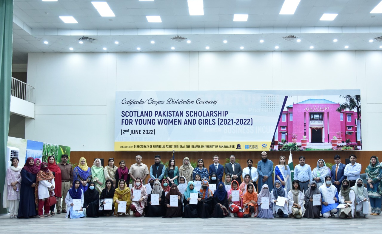 Certificates/Cheques Distribution Ceremony under Scotland Pakistan Scholarship for Females Students 2021-22 held at Main Auditorium, Baghdad-ul-Jadeed Campus, IUB. Director of British Council Sindh, Balochistan and Punjab Mr. Michael Houlgate along with Vice Chancellor Engr. Prof. Dr. Athar Mahboob and Director Financial Assistance Prof. Dr. Ghulam Hassan Abbasi distributed scholarships.