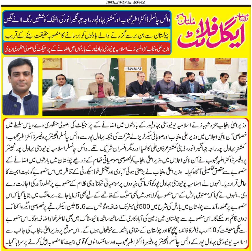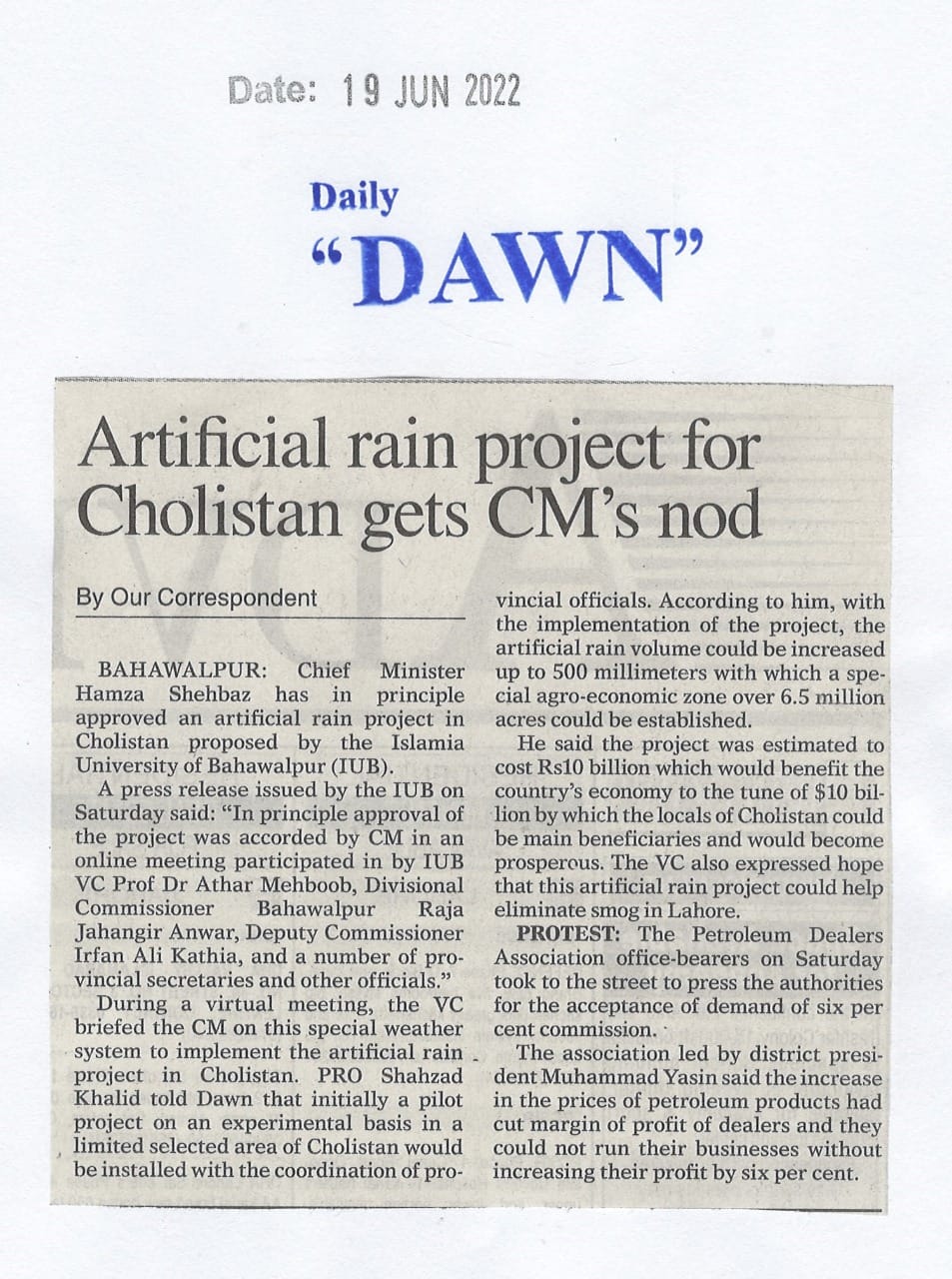 Punjab Chief Minister Muhammad Hamza Shahbaz Sharif has approved in principle the project of artificial rain in Cholistan proposed by The islamia University of Bahawalpur.