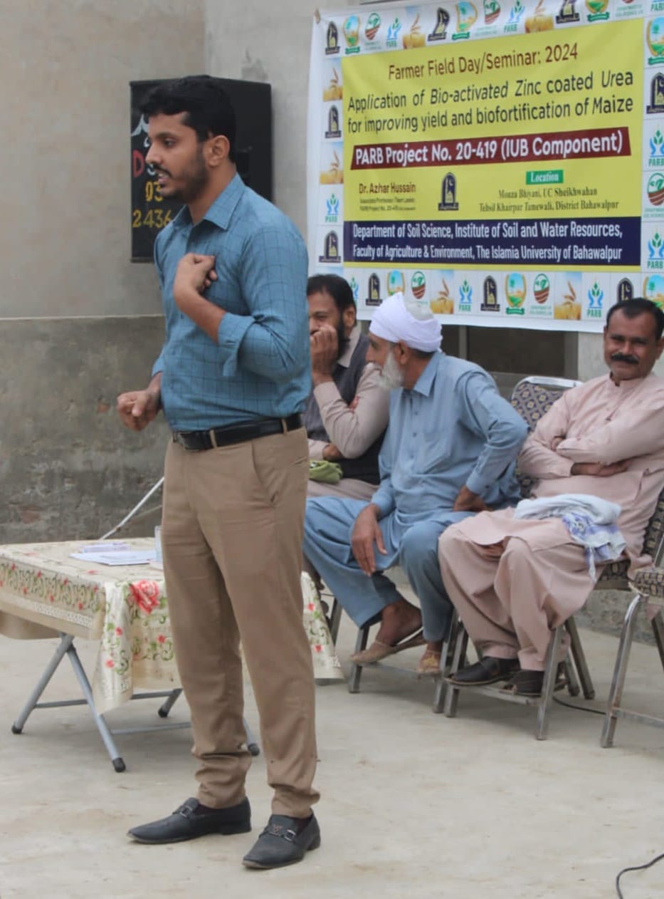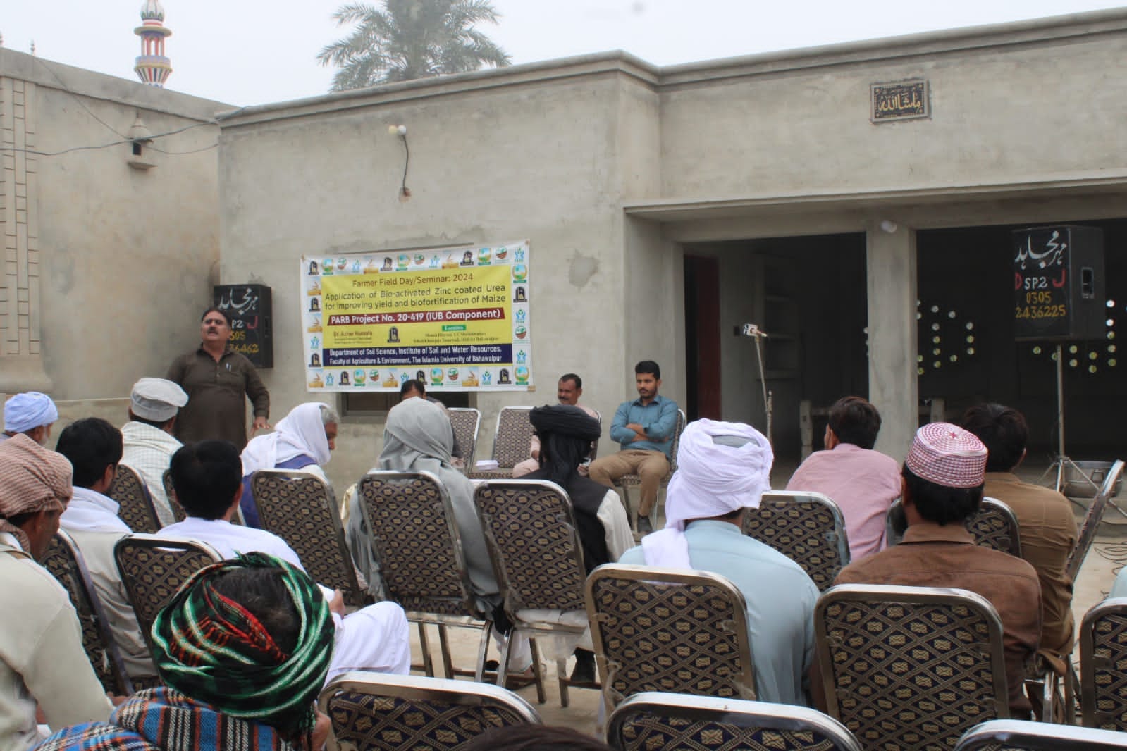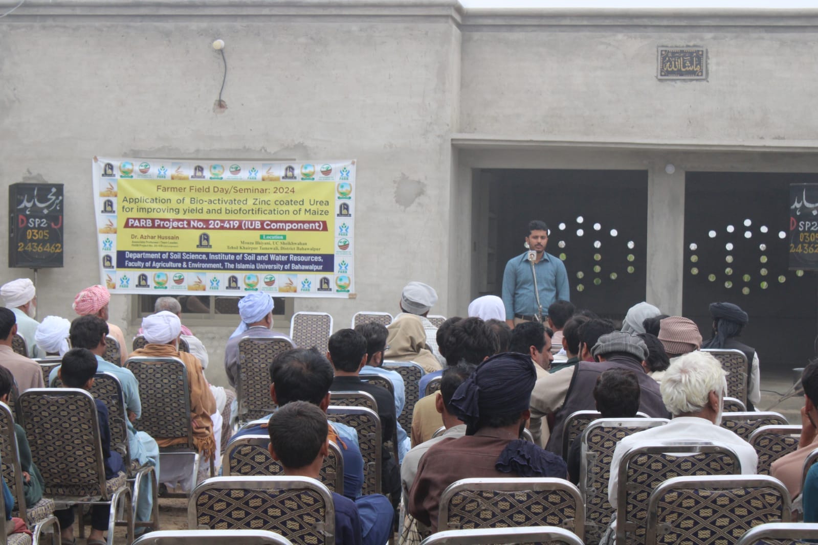 November 16, 2024: Department of Soil Science Faculty of Agriculture and Environment, the Islamia University of Bahawalpur organized a seminar on the occasion of Farmers field Day 2024 at Farmer field trial, Mouza Bhiyani, UC Shaikhwahan, Tehsil Khairpur Tamawali, District Bahawalpur.
