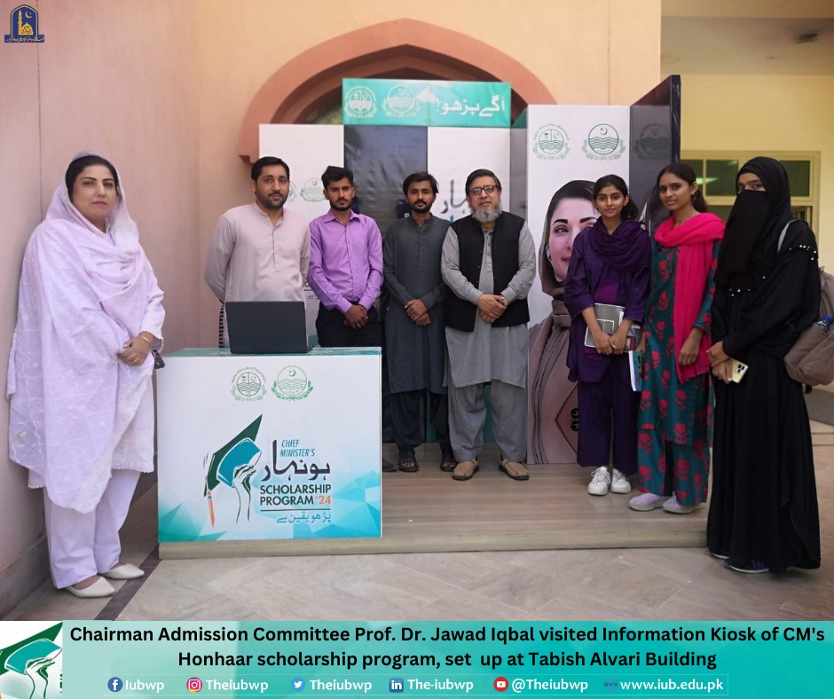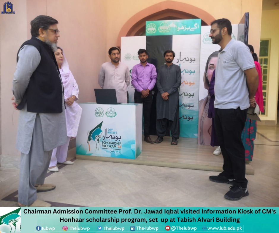 Chairman Admission Committee Prof. Dr. Jawad Iqbal visited Information Kiosk of CM's Honhaar scholarship program, set up at Tabish Alvari Building today. Staff of Directorate of Financial Assistance explained the benefits and procedure of application of Honhaar scholarship to visiting students and helped them apply for the scholarship.