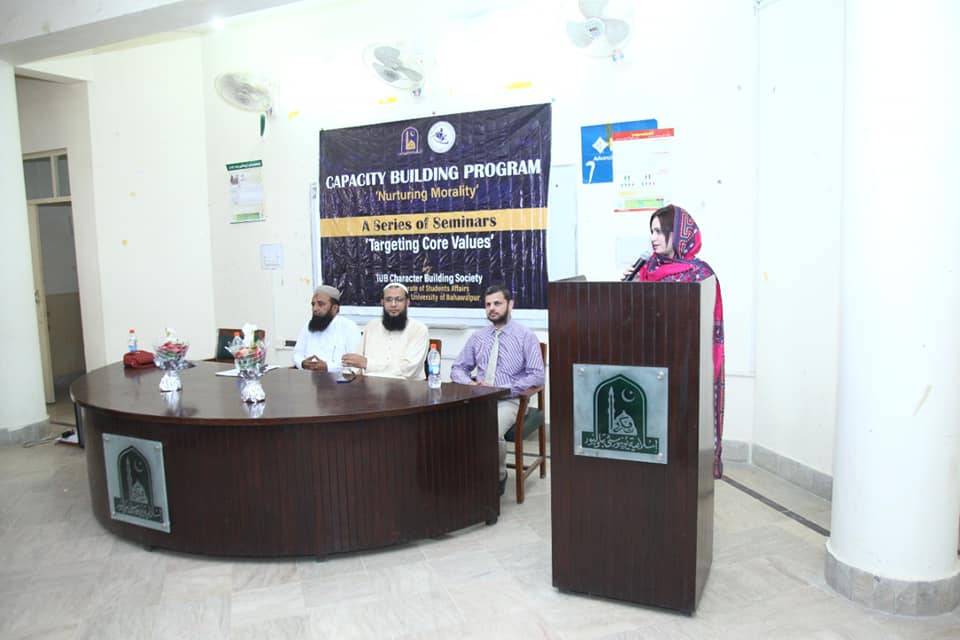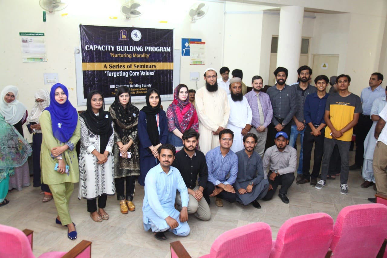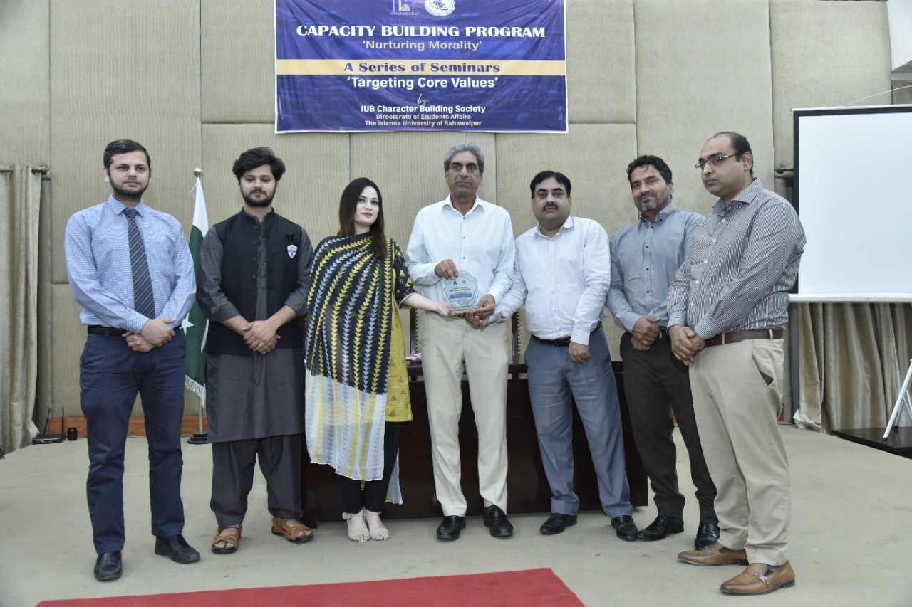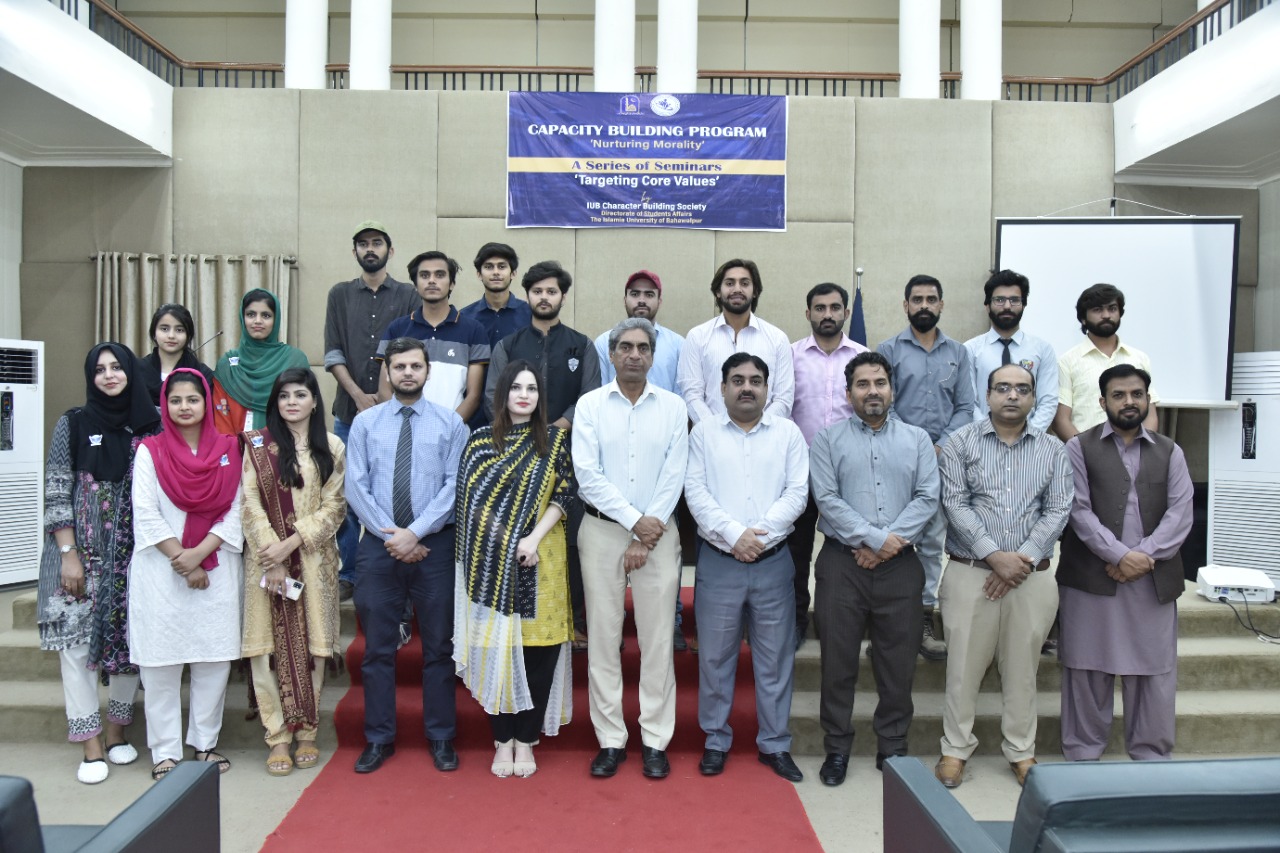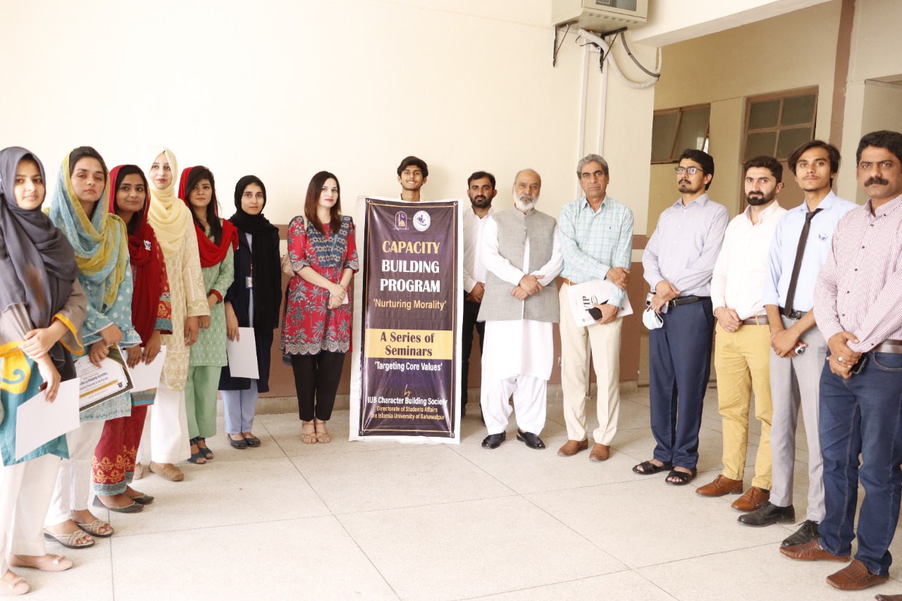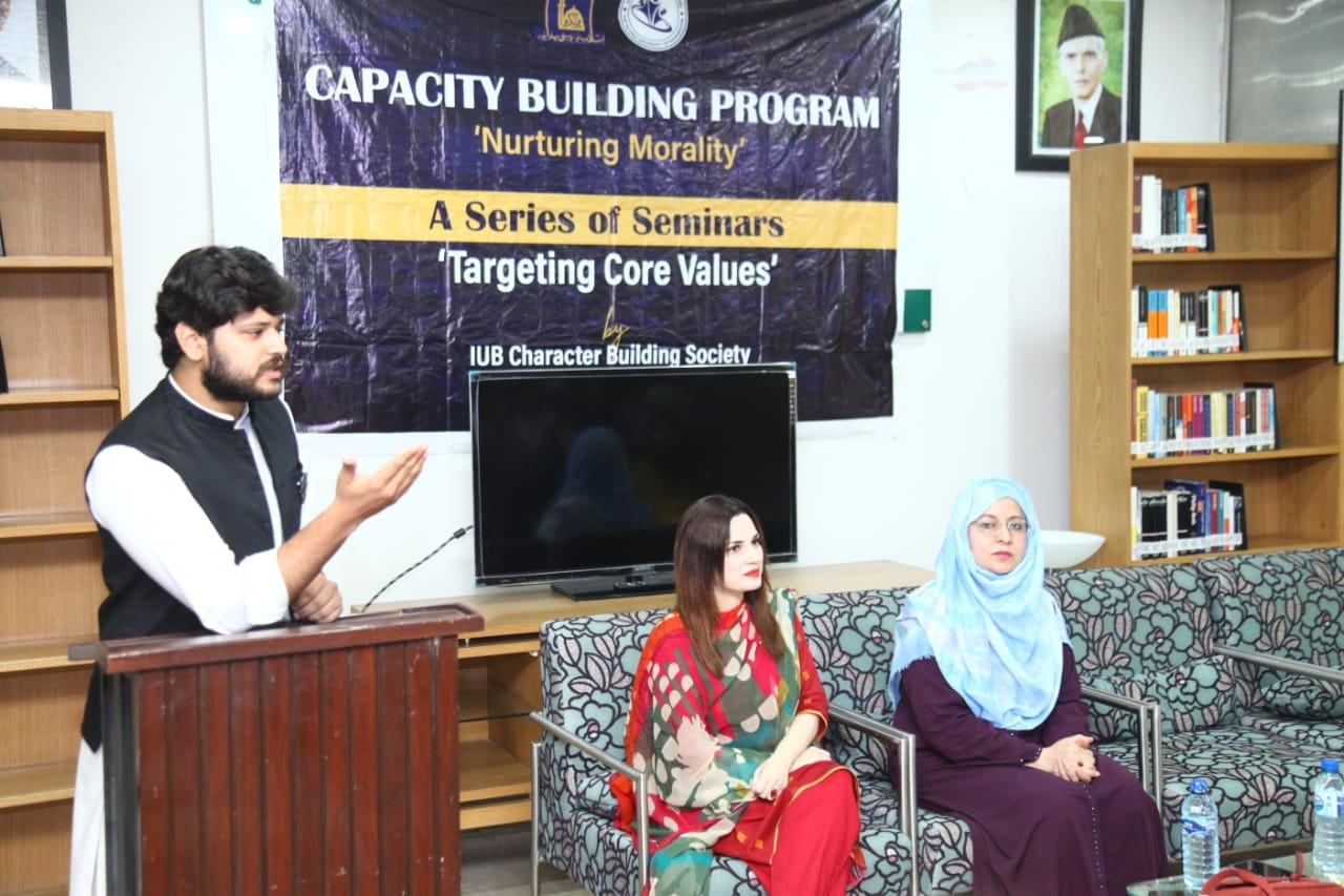 The IUB Character Building Society organizes a series of seminars on "Targeting Core Values". It is organized by the Directorate of Student Affairs of the Islamia University of Bahawalpur. This series of seminars is still going on.