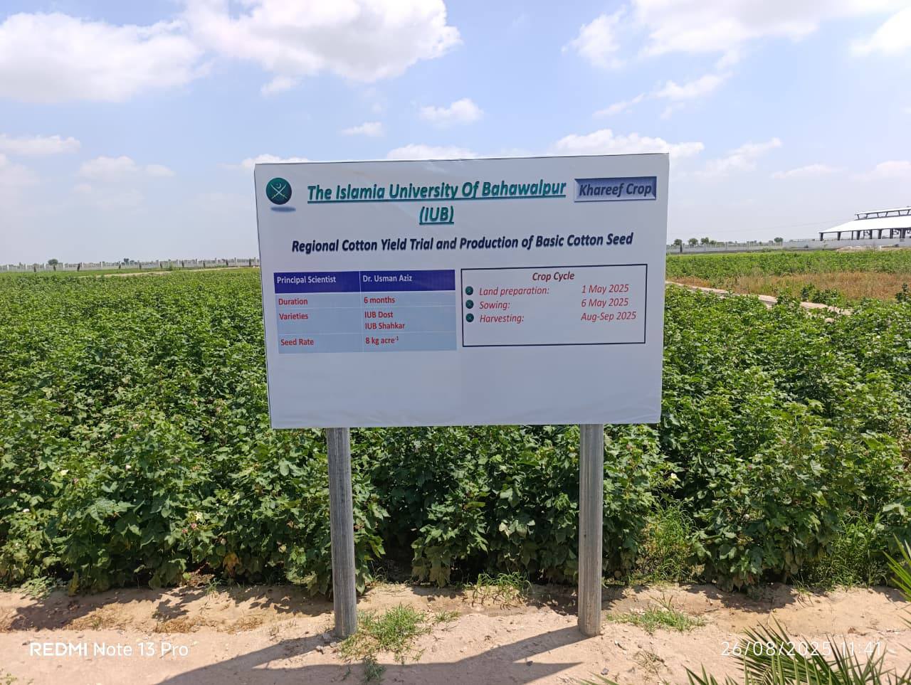 During a recent visit to Chapu Research Farm in Cholistan, an IUB delegation witnessed a significant achievement: their cotton varieties ranked highest in the ongoing trials. The team, including Dr. Usman Aziz, Dr. Humayun Raza, and Mr. Masood Ahmad, was given a tour by Research Assistant Miss Hadiqa, who showcased the exceptional performance of the IUB-developed Cotton Lines.