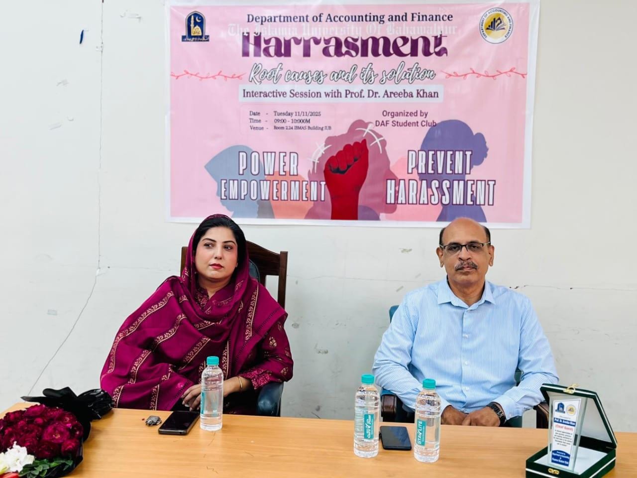 The Department of Accounting and Finance Student Club hosted a powerful session on “Harassment: Its Root Causes and Prevention”, featuring Prof. Dr. Areeba Khan as the esteemed guest speaker.