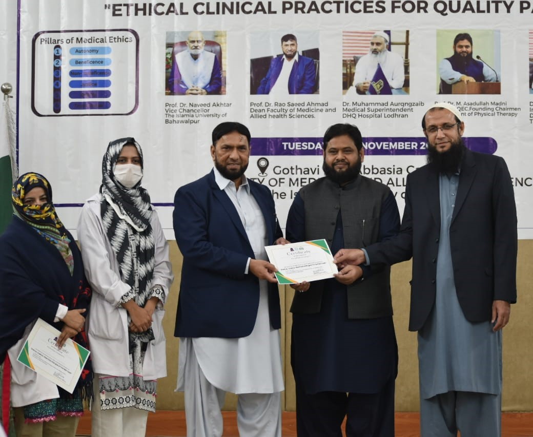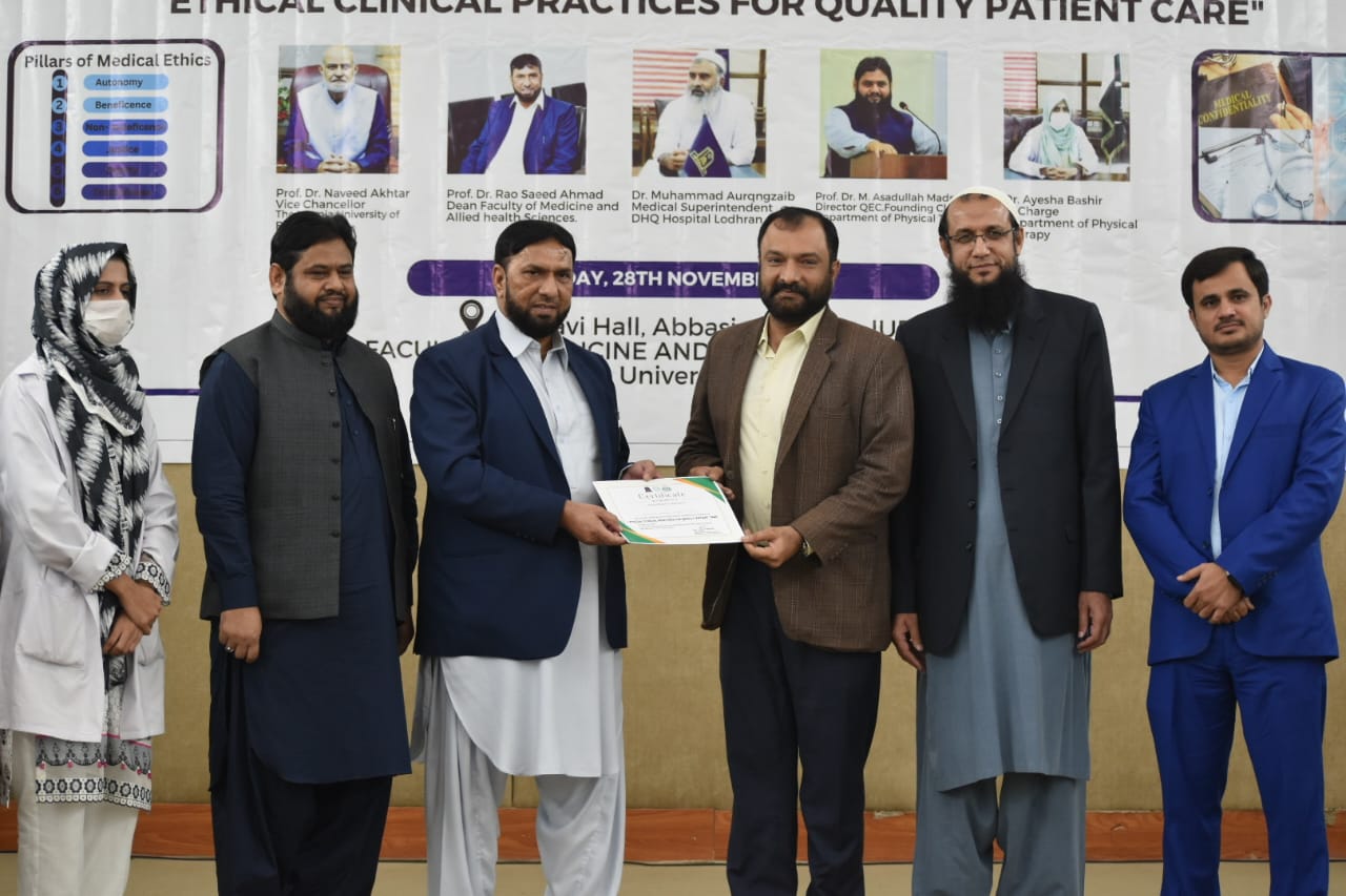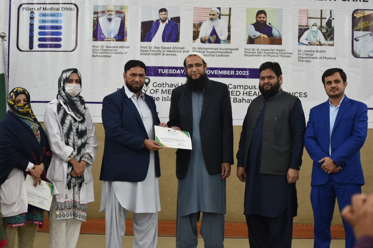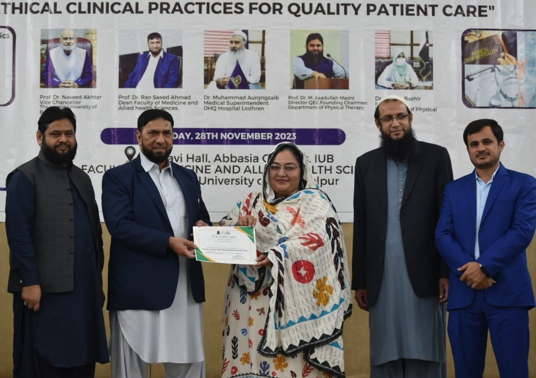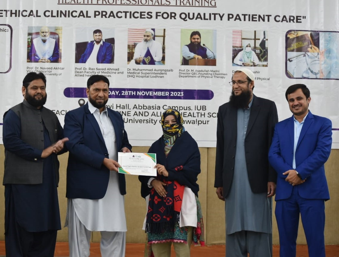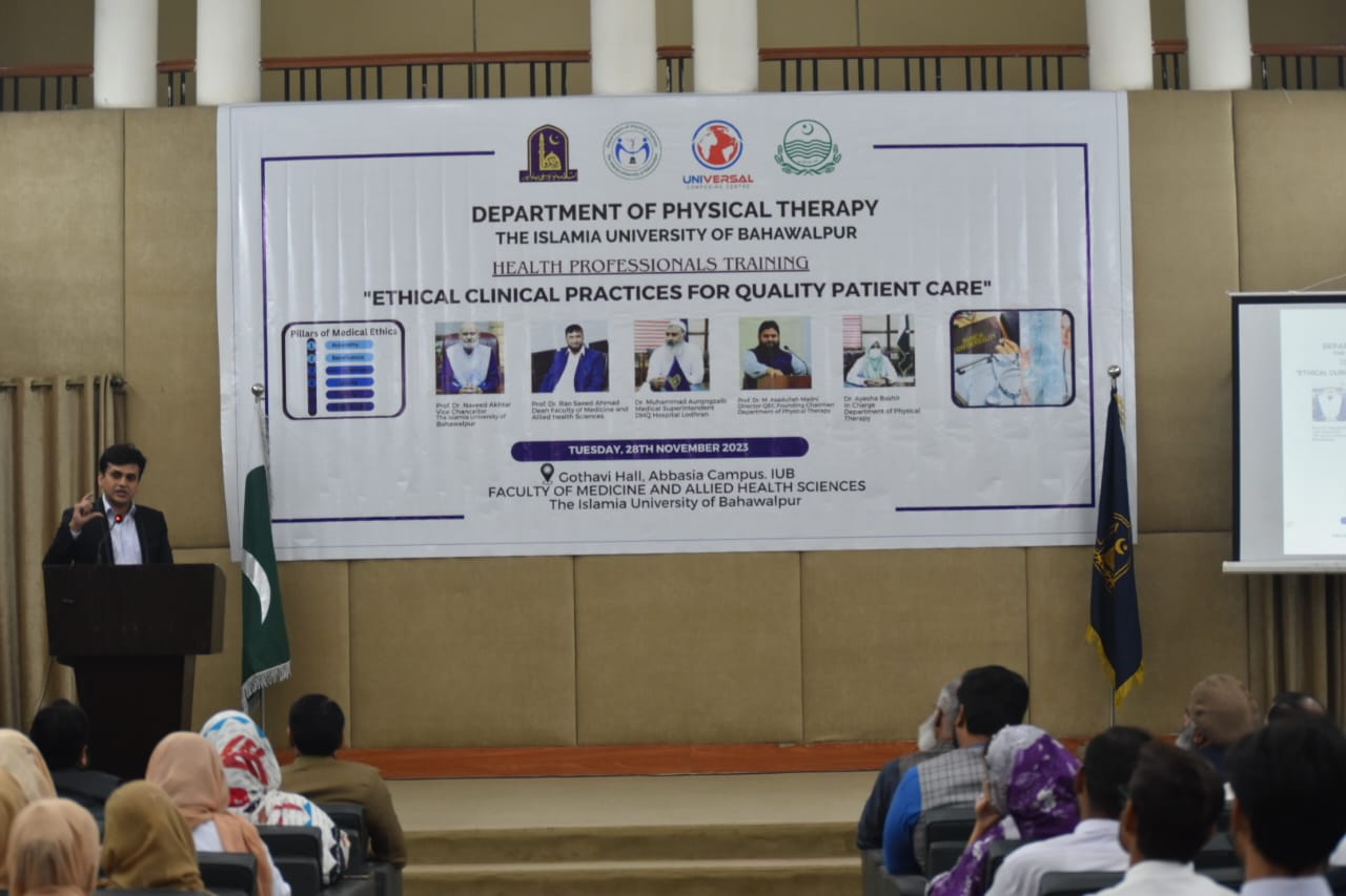 The Department of Physical Therapy, Faculty of Medicine and Allied Health Sciences, The Islamia University of Bahawalpur in collaboration with DHQ Hospital Lodhran organized a one day Health Professionals training program on "Ethical Clinical Practices for Enhancing Quality Patient Care".