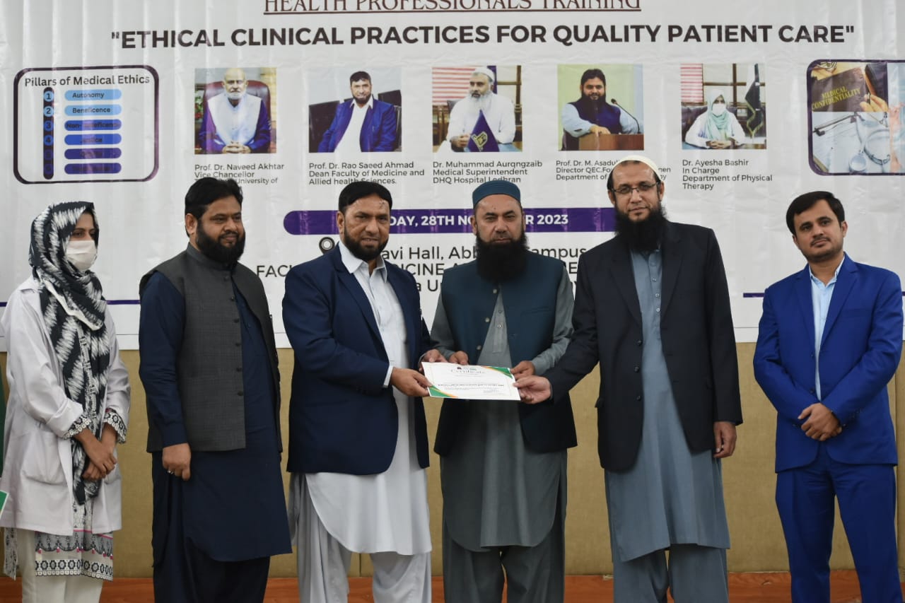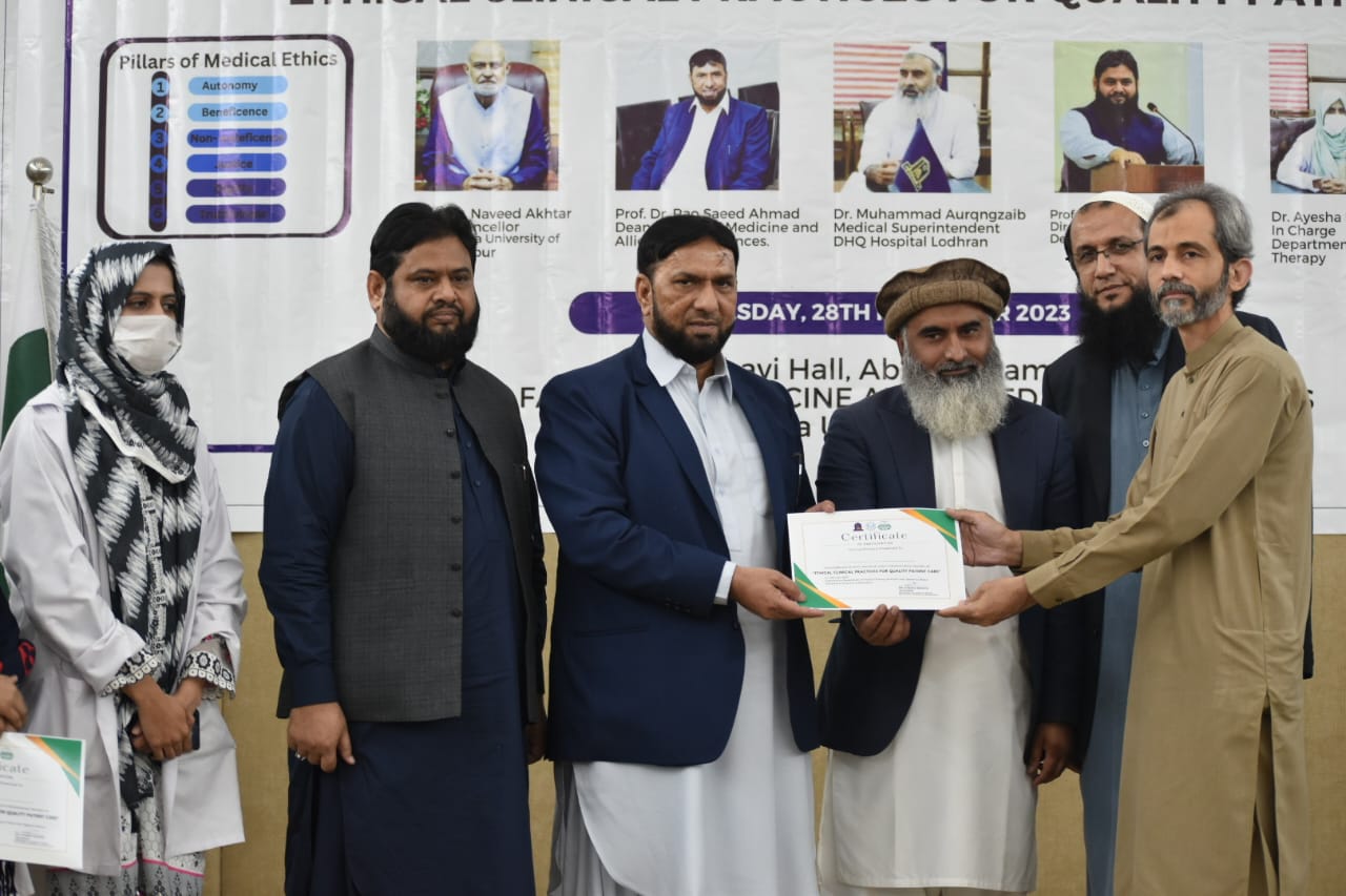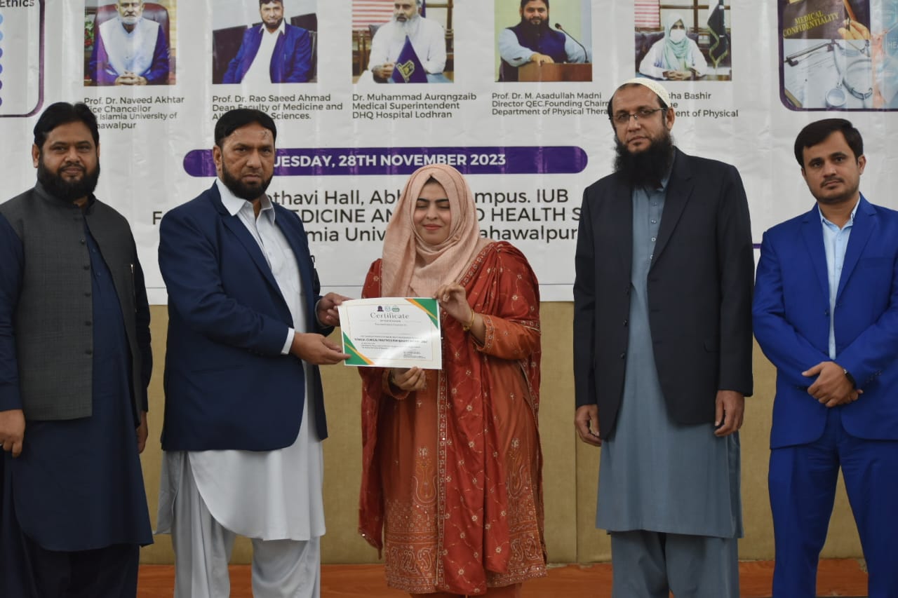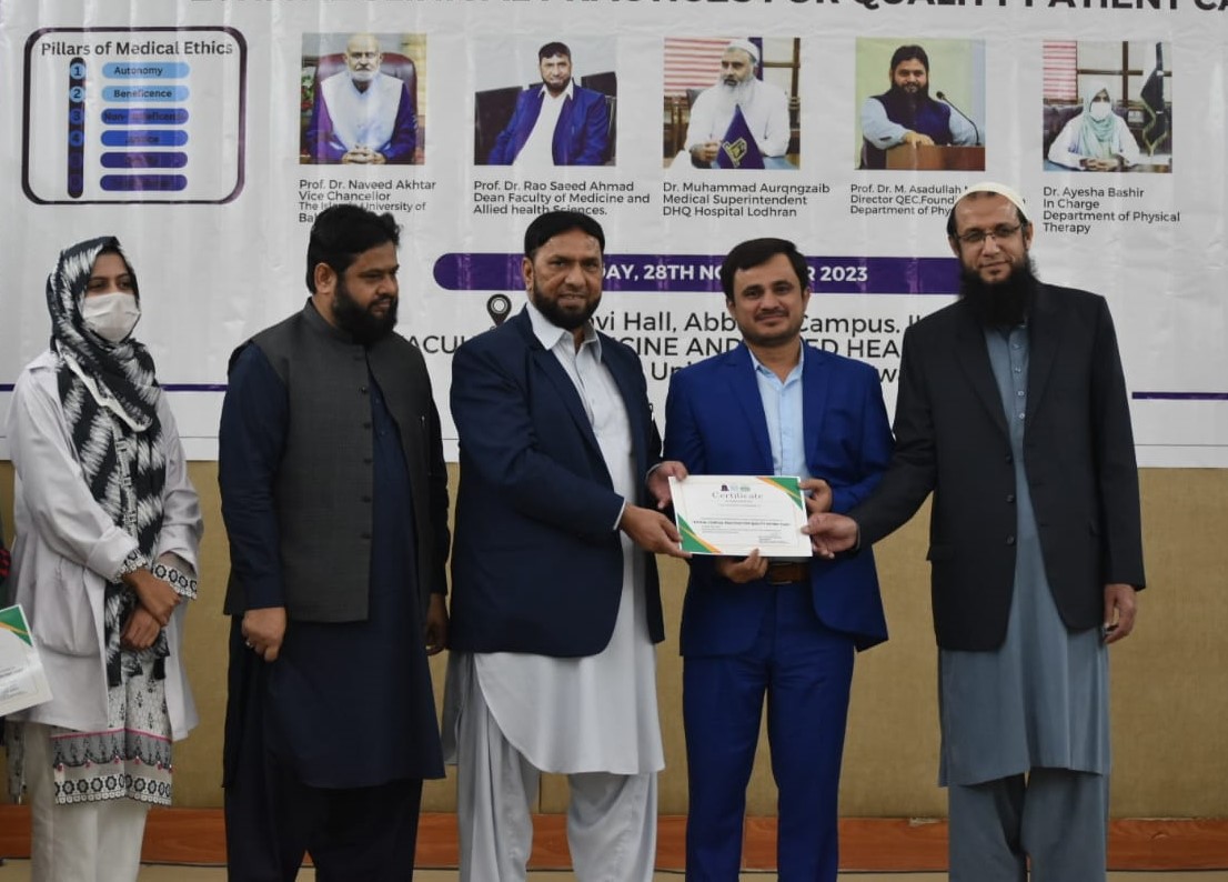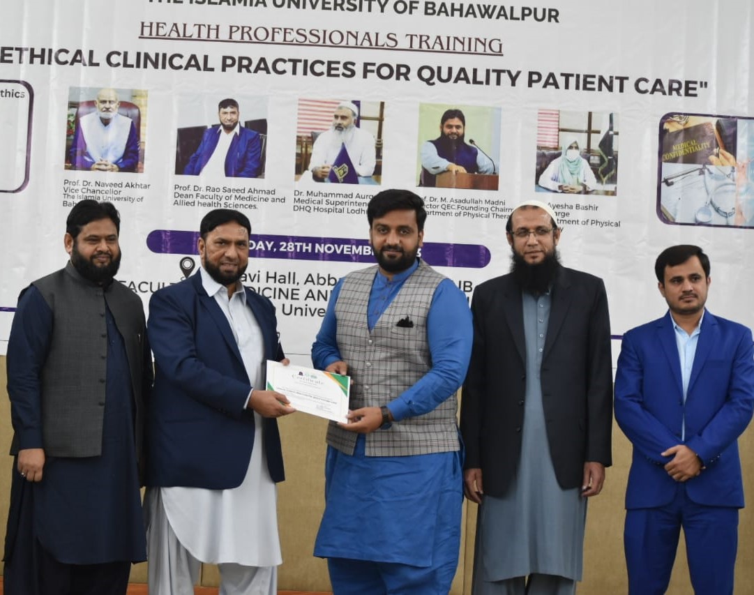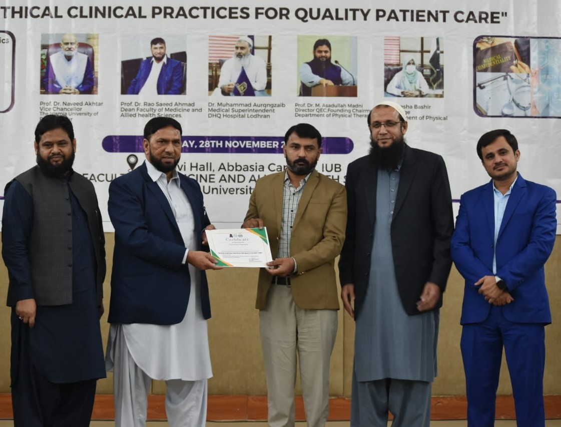 The Department of Physical Therapy, Faculty of Medicine and Allied Health Sciences, The Islamia University of Bahawalpur in collaboration with DHQ Hospital Lodhran organized a one day Health Professionals training program on "Ethical Clinical Practices for Enhancing Quality Patient Care".