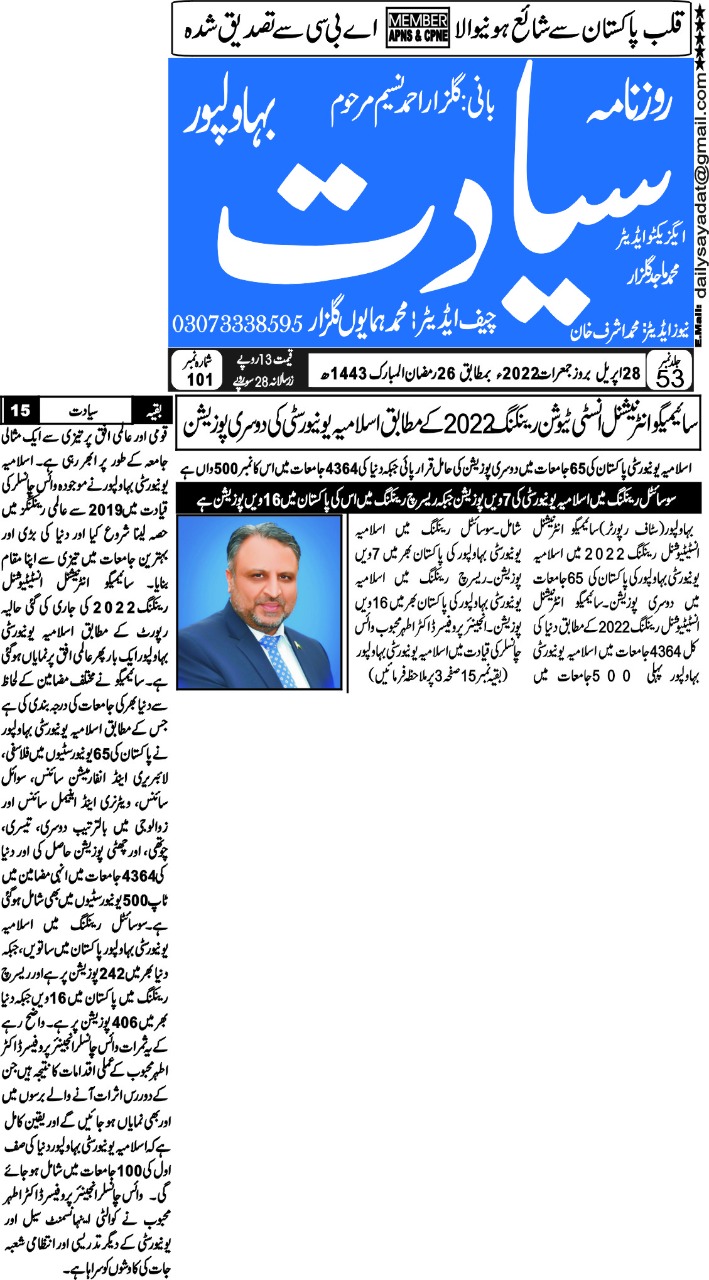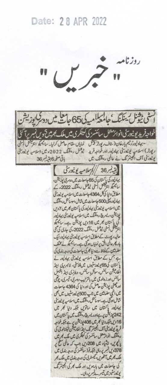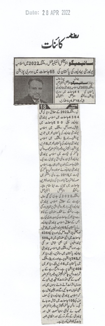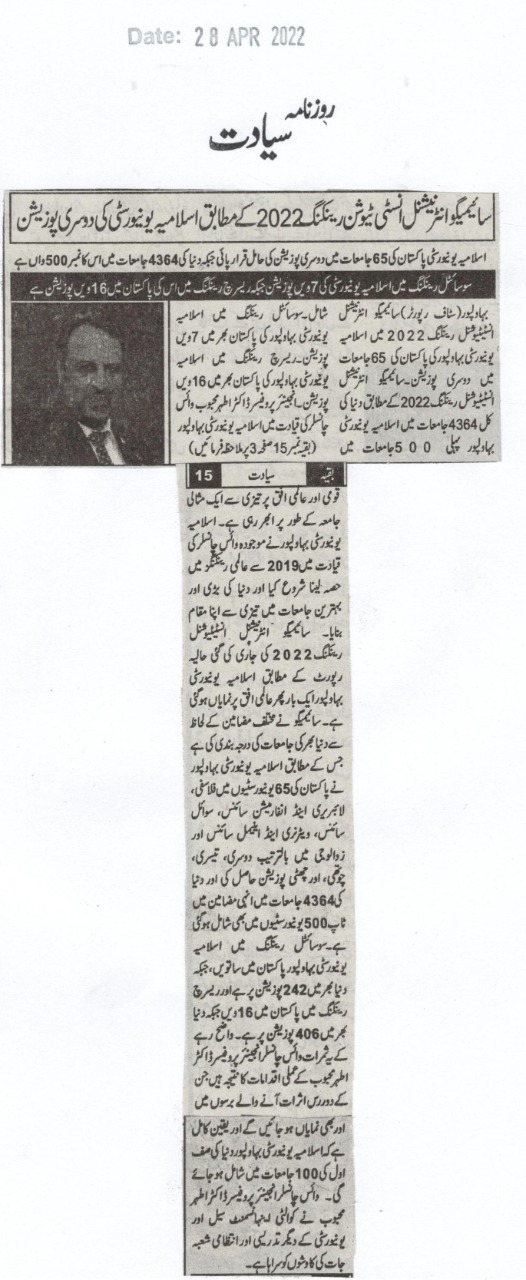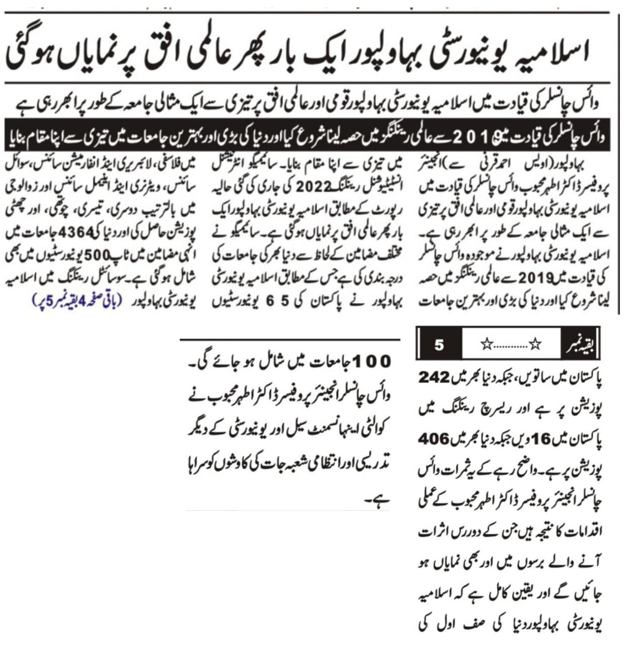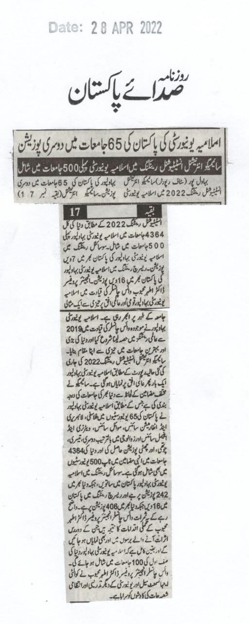 According to the Scimago International Institutional Rankings 2022, the Islamia University of Bahawalpur is ranked second among 65 universities in Pakistan.