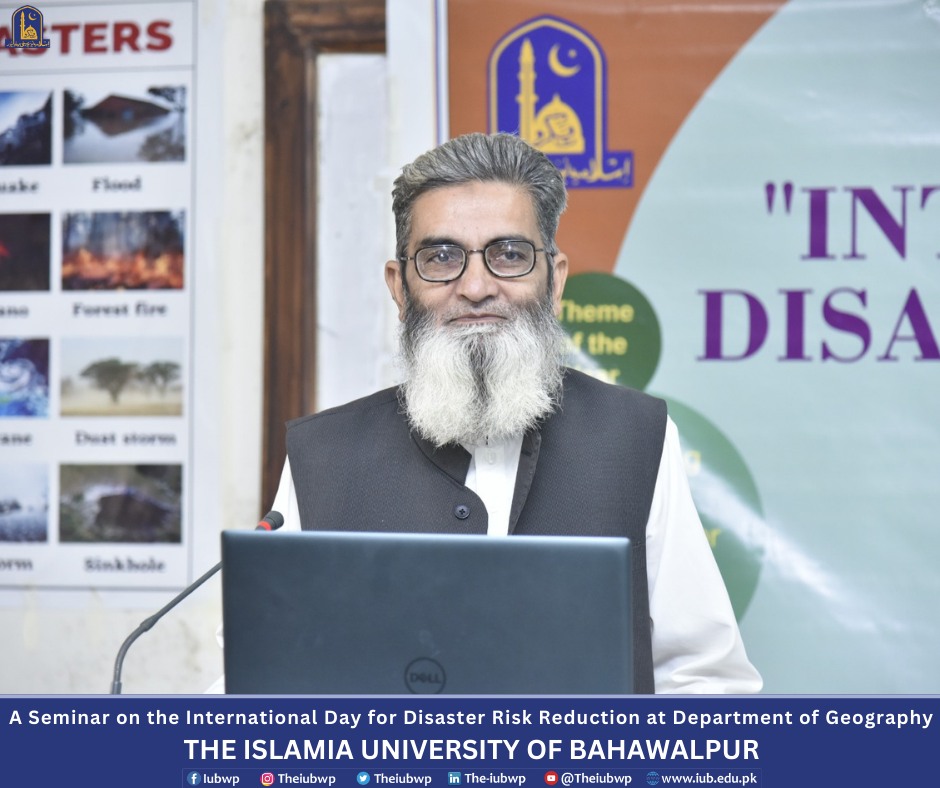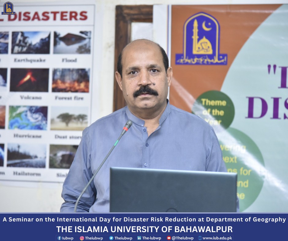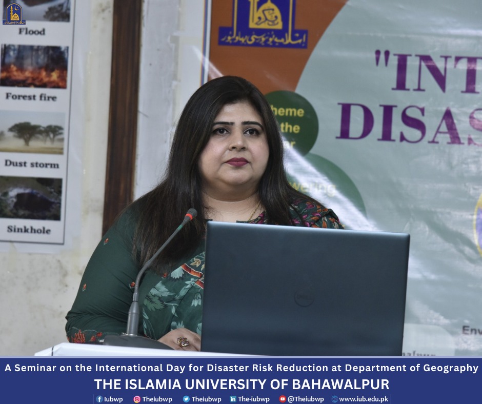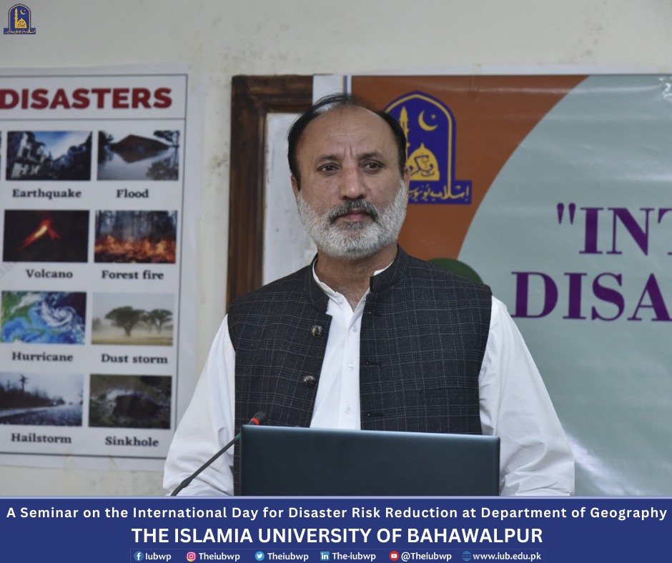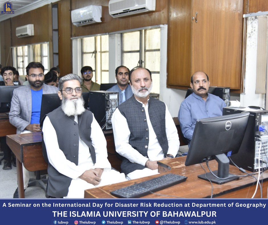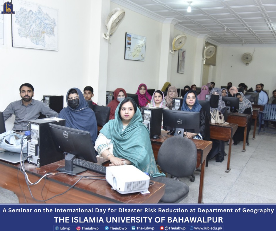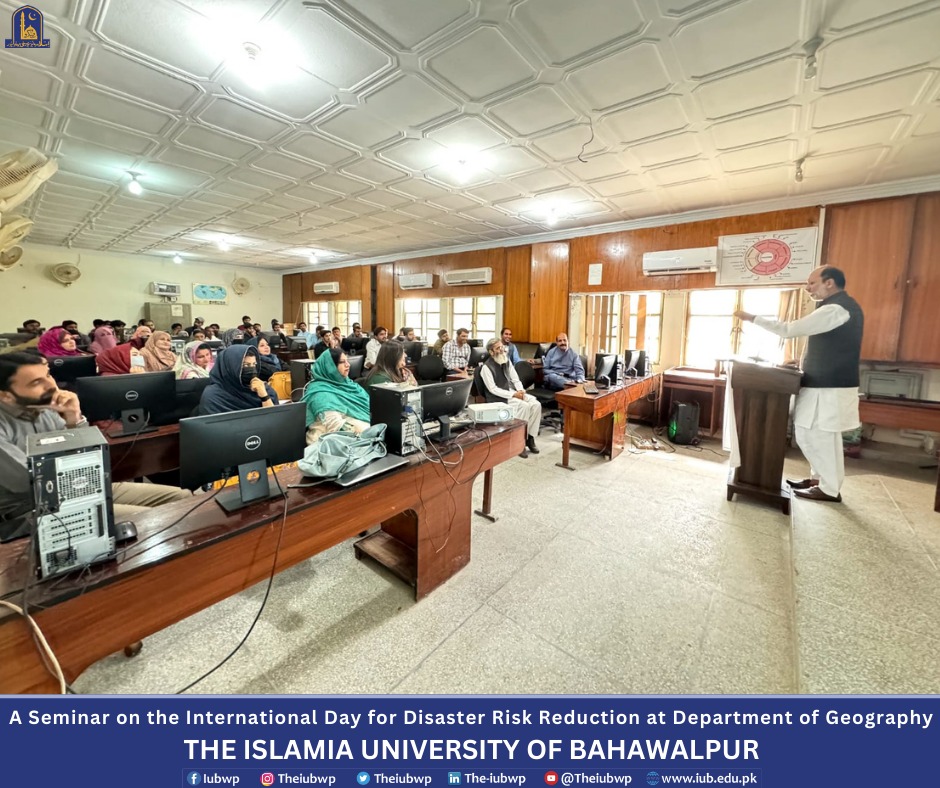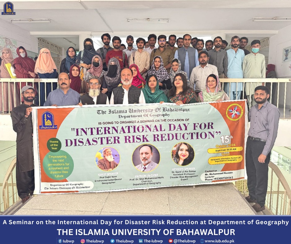 Department of Geography, the Islamia University of Bahawalpur organized a seminar on the International Day for Disaster Risk Reduction on the title "Disaster Risk Reduction: Empowering Communities for a Safer Tomorrow" and an orientation for newly enrolled students of BS, M.Phil. and Ph.D. programs. This activity was held on October 15, 2024.