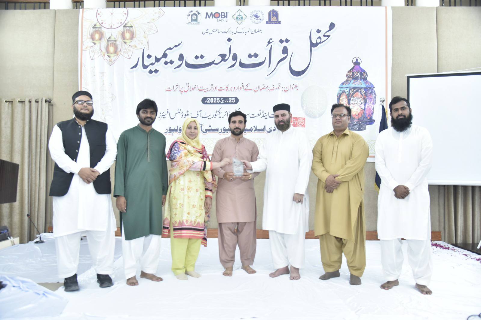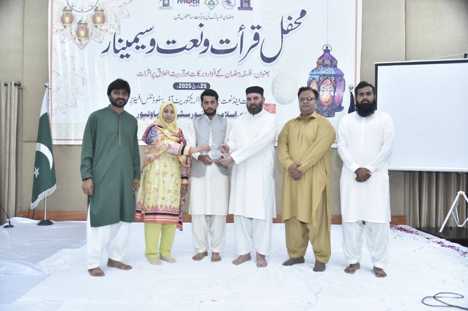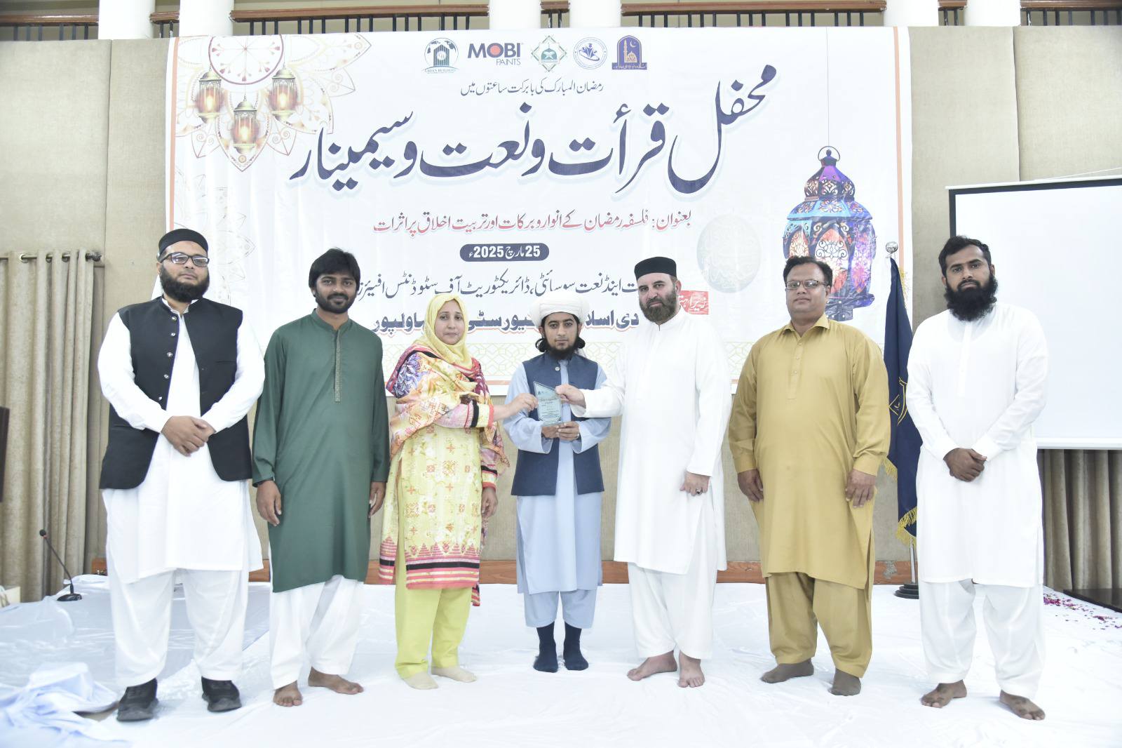25 March 2025: IUB Qiraat and Naat Society organized the grand mehfil Qiraat & Naat and Seminar at Ghulam Muhammad Gothvi Hall, Abbasia Campus, on the occasion of the Holy Blessed Ramadan. The guest speaker was Syed Zeeshan Akhtar, Chairman of the Al-Khidmat Foundation in South Punjab.