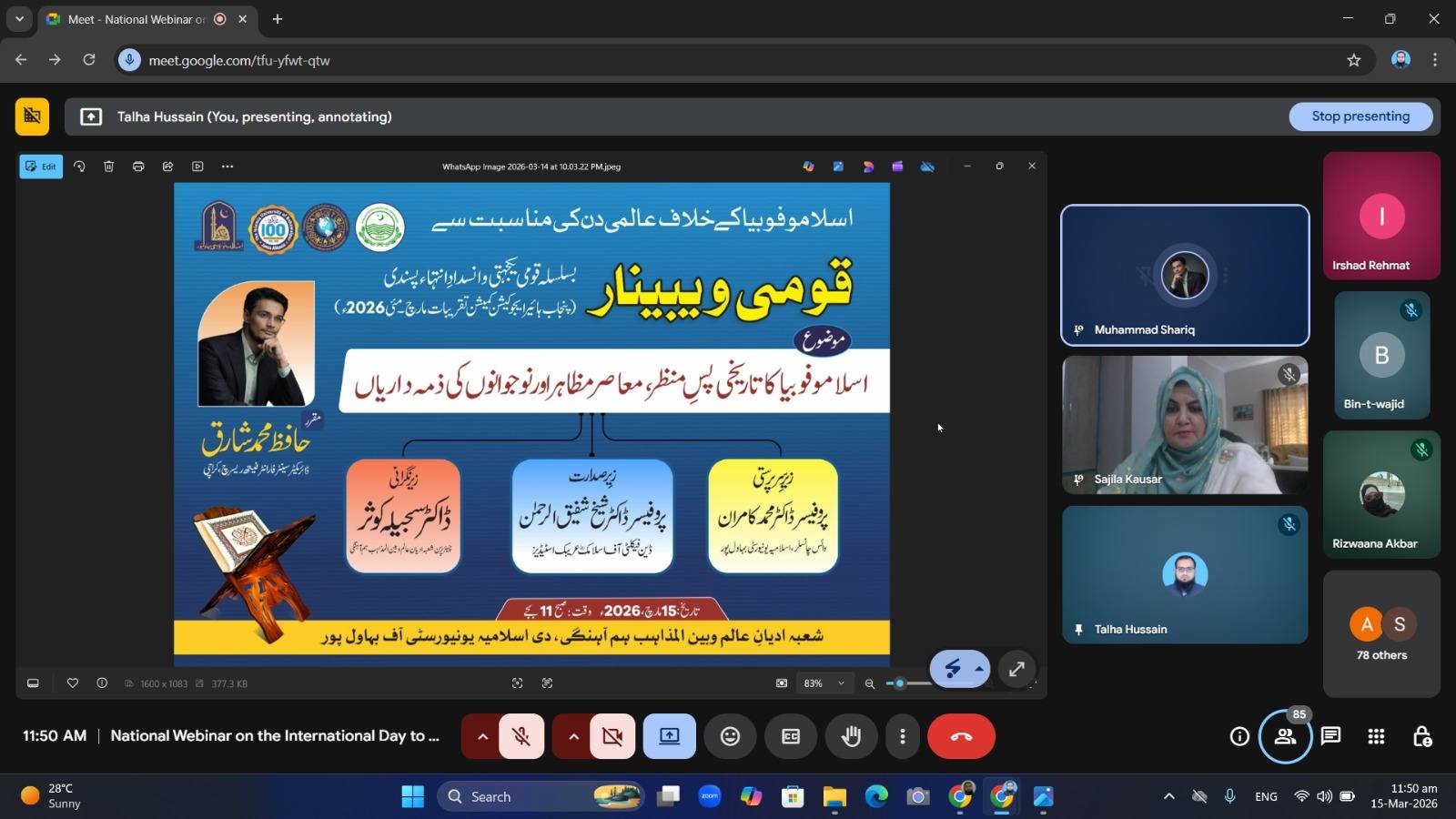 A national webinar on National Solidarity and Countering Extremism (Punjab Higher Education Commission Events March-May 2026) was organized by the Department of World Religions and Interfaith Harmony, The Islamia University of Bahawalpur on the occasion of the International Day Against Islamophobia on March 15 at 11 am.