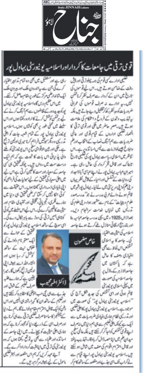 The Islamia University of Bahawalpur was established in the year 1975 by upgrading historical institute of the Jamia Abbasia.