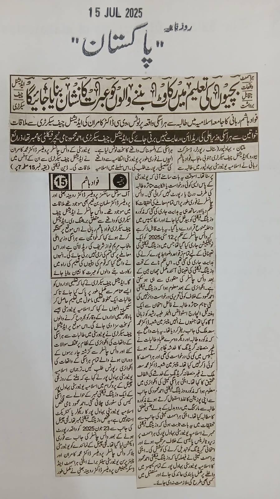 The Islamia University of Bahawalpur was established in the year 1975 by upgrading historical institute of the Jamia Abbasia.