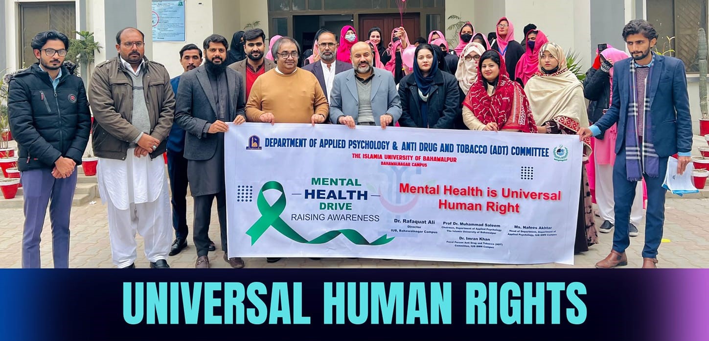Awareness Seminar on “Mental Health is Universal Human Right” and "Prevention of Drug and Tobacco" was held on January 12, 2024 at Bahawalnagar Campus. Anti-Drug & Tobacco Committee (Bahawalnagar Campus) and Head of Department Ms Nafees Akhtar Department of Applied Psychology (Bahawalnagar Campus) hosted Awareness Seminar in line with the HEC Policy on Drug and Tobacco Abuse in Higher Education