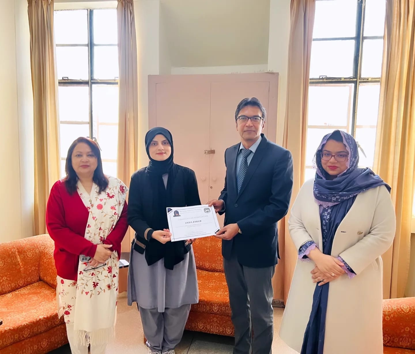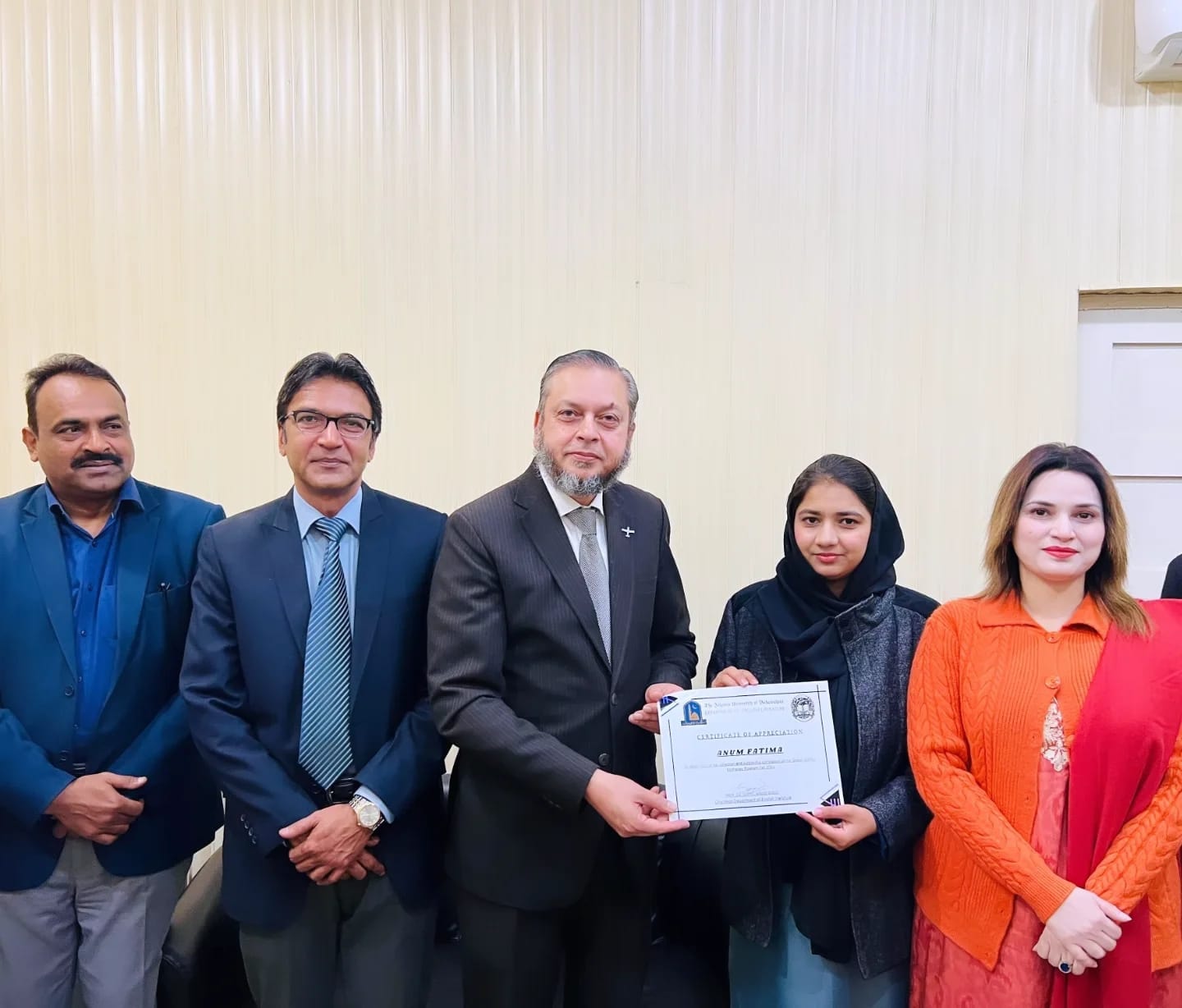 Two students, Anum Fatima and Ansa Ayoub, from the Department of English Literature were awarded certificates by the worthy Vice Chancellor, Prof. Dr. Muhammad Kamran, along with Prof. Dr. Sohail Ahmad Saeed, Chairman, Department of English Literature, in recognition of their selection for the prestigious Global UGRAD Exchange Program.