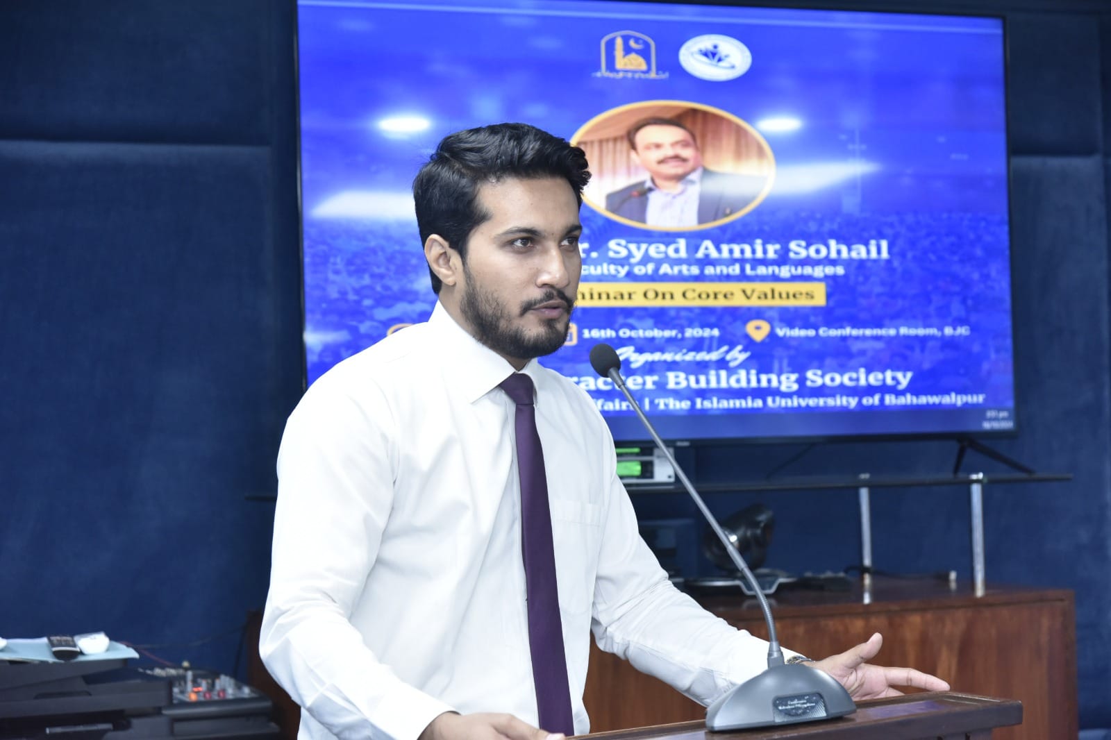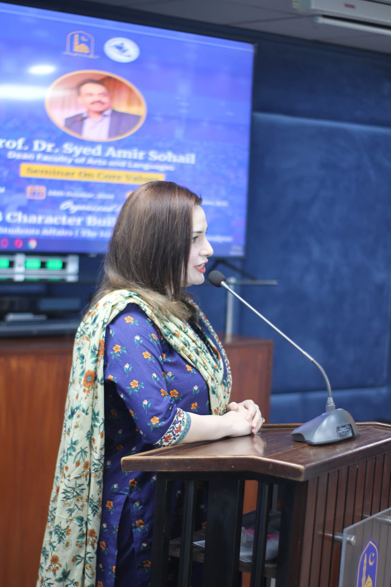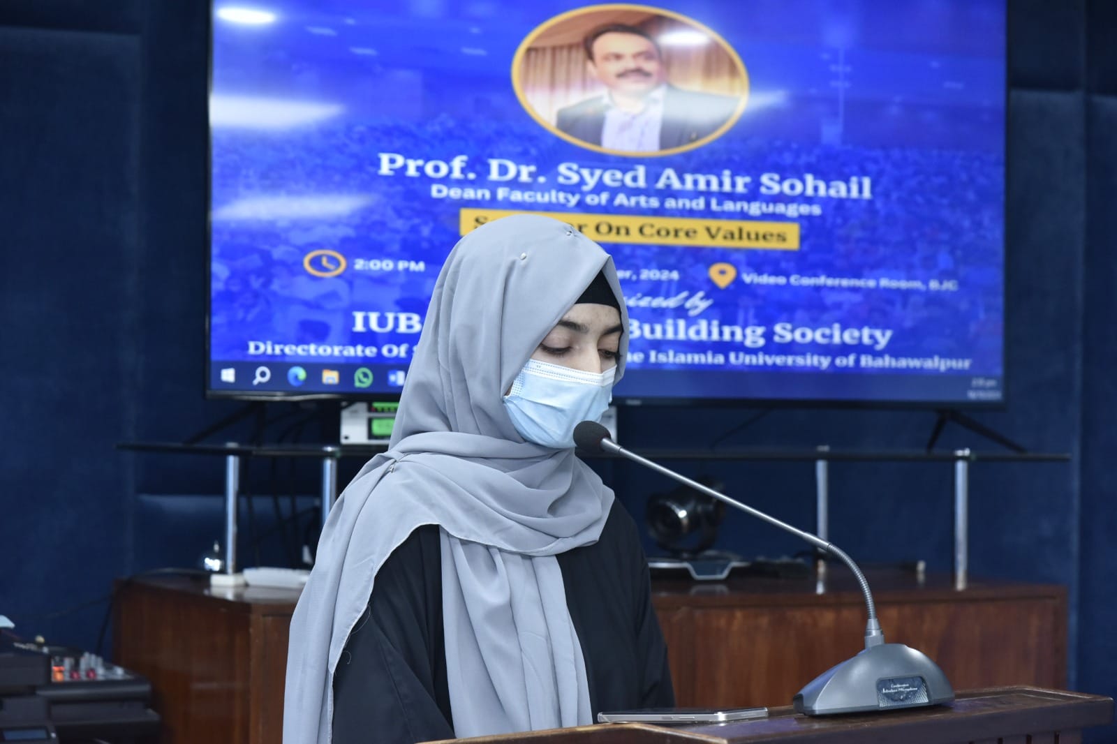 The IUB Character Building Society is delighted to organize the seminar on the importance of core values. The session began with a welcome note from Advisor Dr. Noveen Javed, who welcomed the guest speakers, co-advisors, faculty members, and all attendees. Dean Faculty of Arts and Languages Professor Dr. Amir Sohail is the chief guest in this seminar.