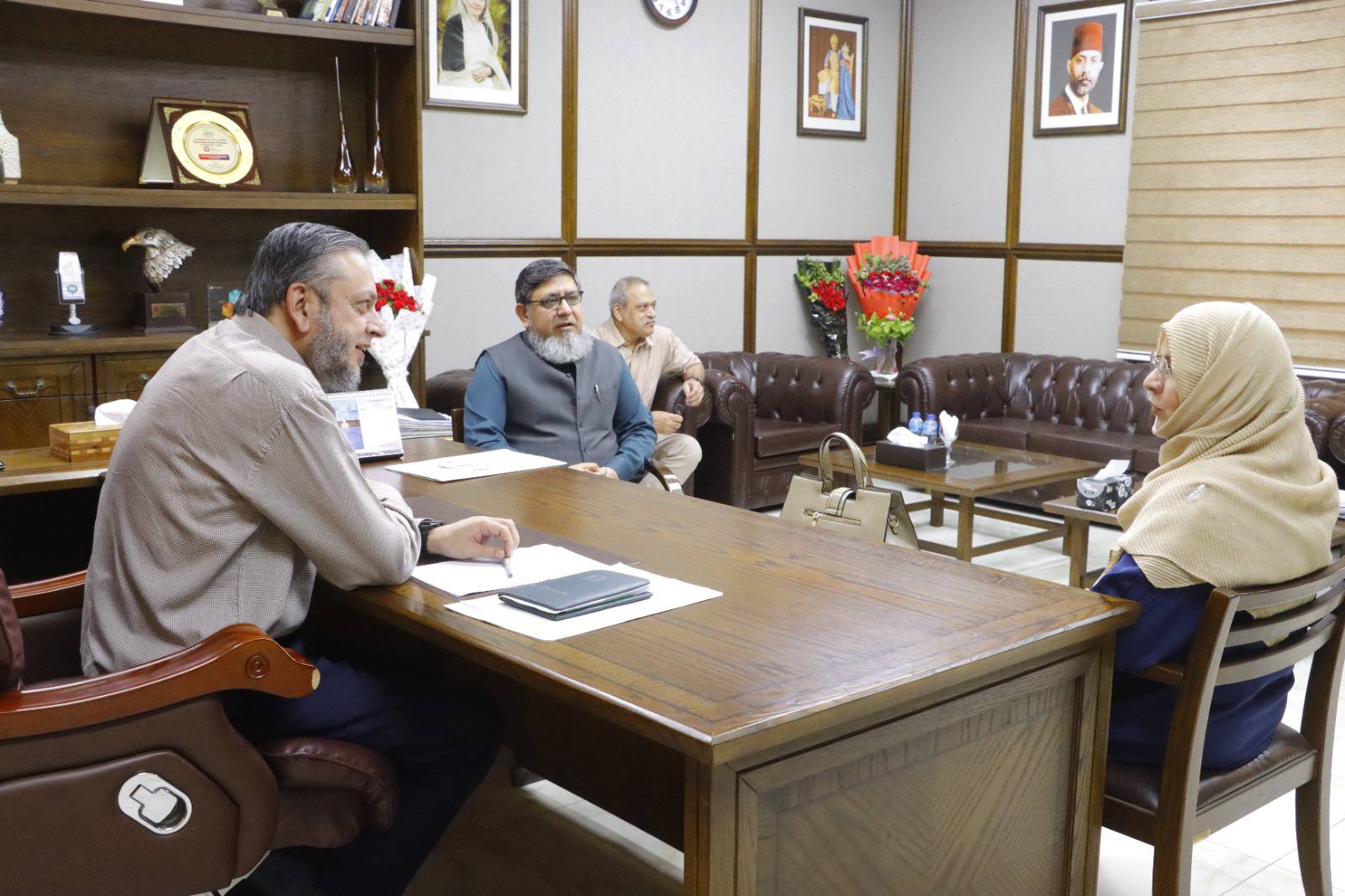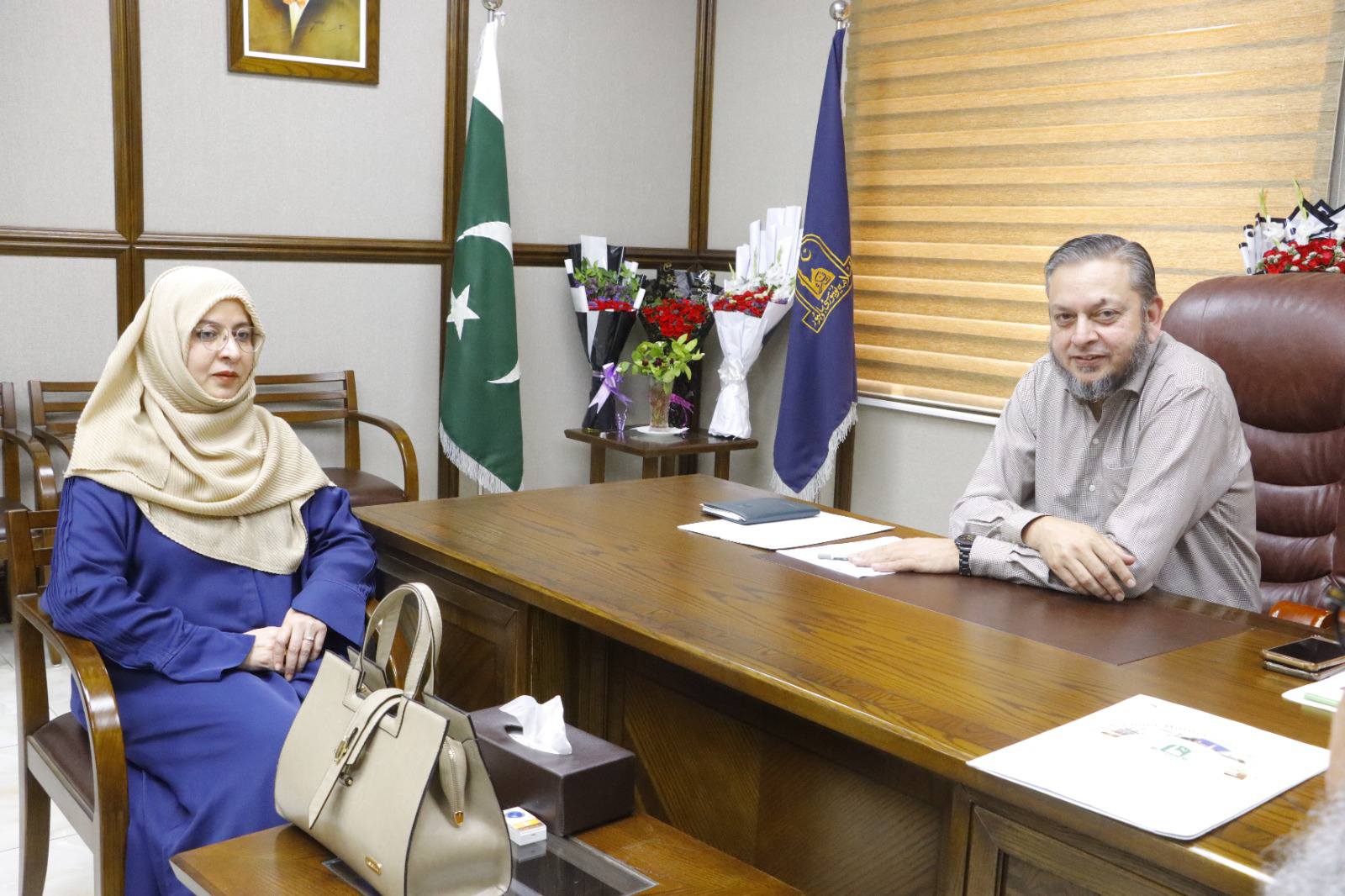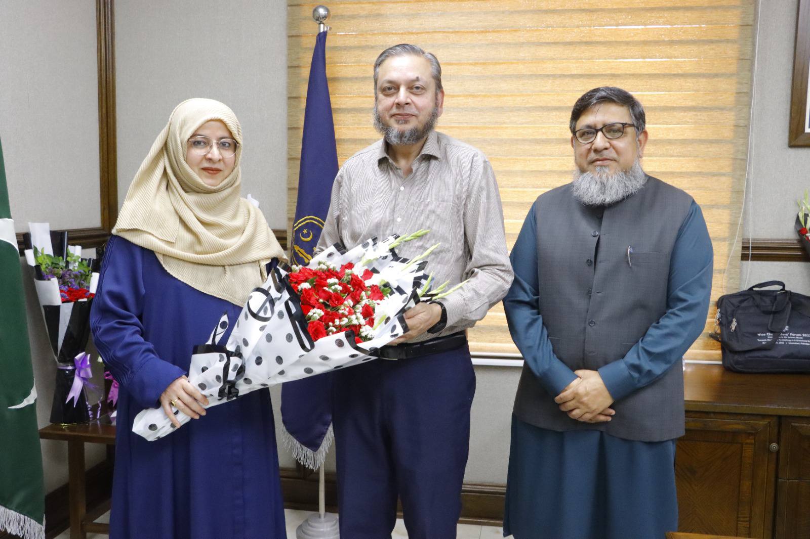Worthy Vice Chancellor of the Government Sadiq College Women University, Bahawalpur, Pakistan (GSCWU), Prof. Dr. Shazia Anjum felicitated Honourable Vice Chancellor Prof. Dr. Muhammad Kamran on assuming responsibilities as VC IUB. Professor Dr. Jawad Iqbal and Dr. Abdul Sattar Zahoori were also present on this occasion.