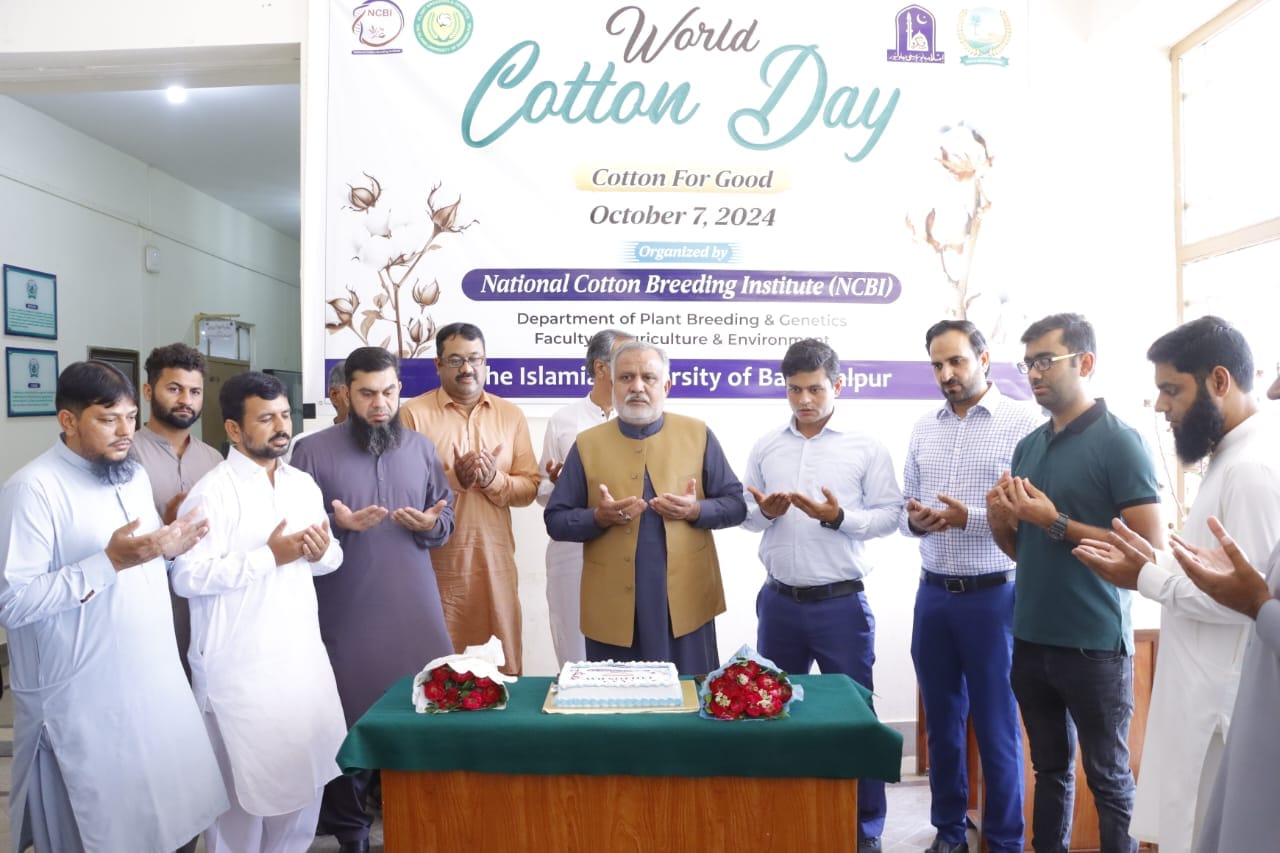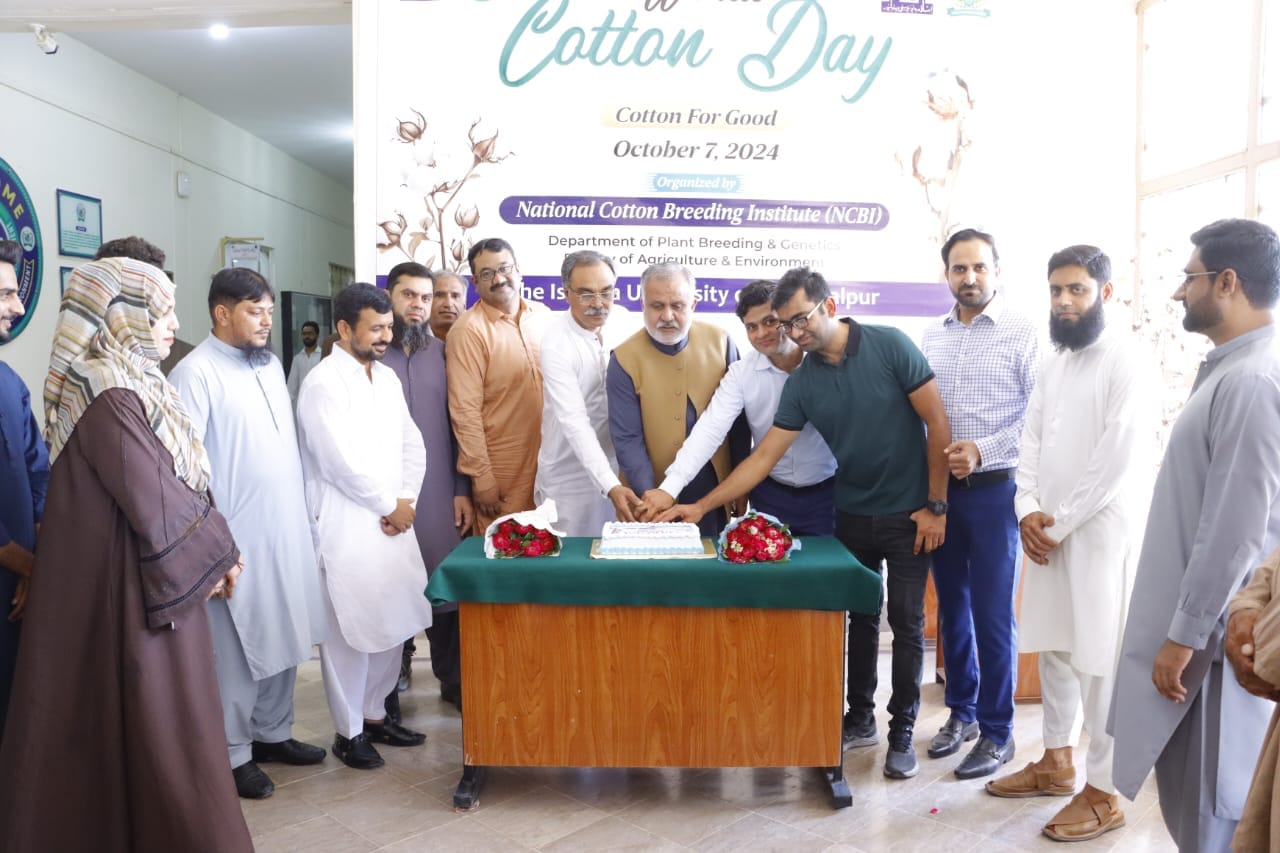 World Cotton Day Celebrated at National Cotton Breeding Institute, Islamia University of Bahawalpur - October 7, 2024. The National Cotton Breeding Institute (NCBI), Department of Plant Breeding & Genetics, Faculty of Agriculture & Environment, Islamia University of Bahawalpur (IUB), organized World Cotton Day under the theme "Cotton For Good."