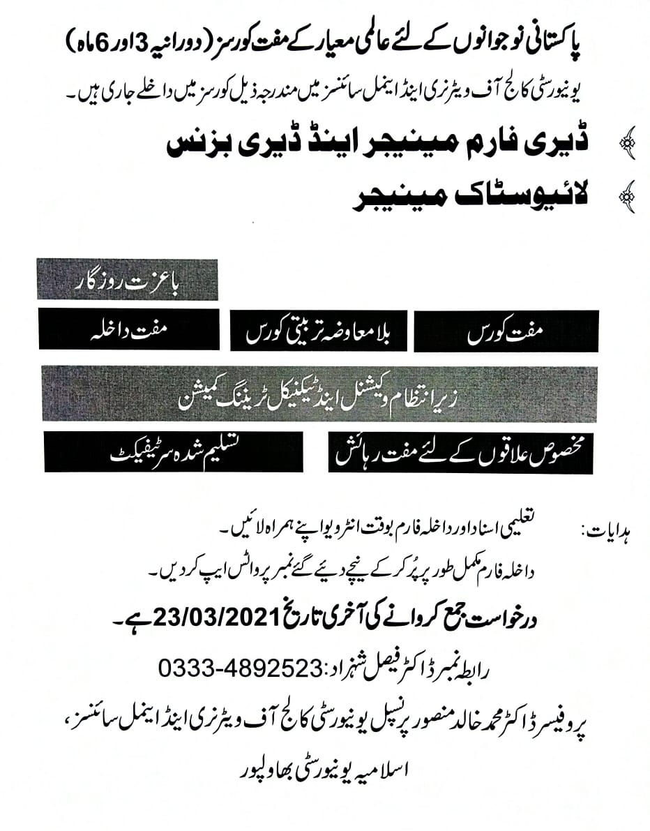 Applications are invited for the following short courses which will be held in University College of Veterinary & Animal Sciences, The Islamia University of Bahawalpur with the financial help of NAVTTC. Interested candidates are requested to submit their applications (application form attached) along with their CV, copy of CNIC and attested copies of all educational testimonials in the office of undersigned till 23/03/2021.