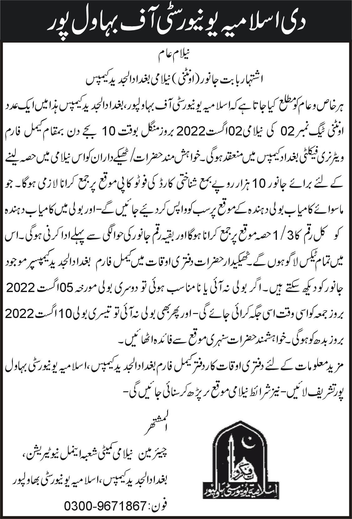 | Auction Notice | 100 Acre Agriculture Land | 2024-08-22 | 2024-09-09 | Closed | Chairman Agriculture Auction Committee, IUB | | — |