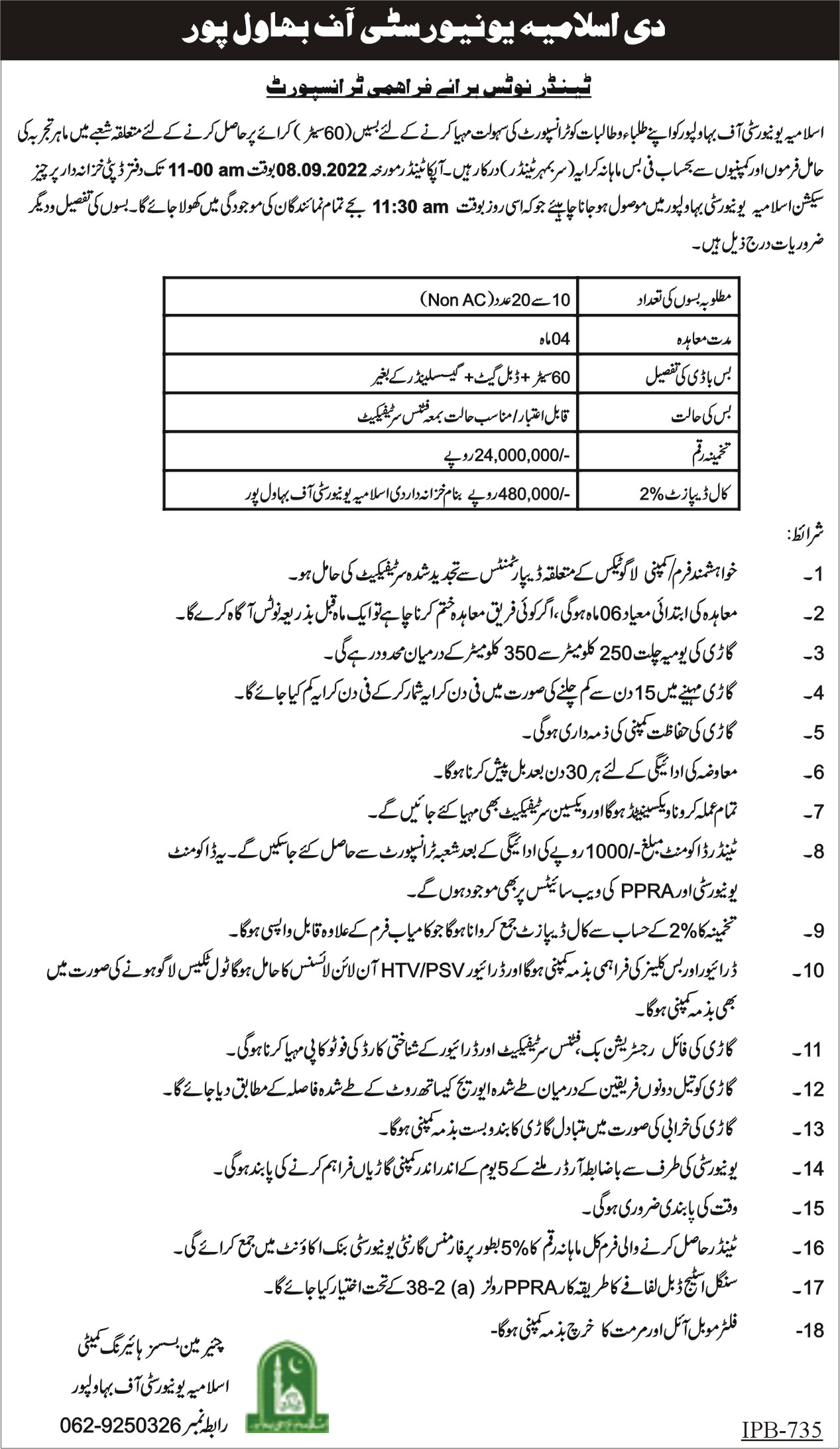 | Tender Notice Works IPB-1103 | Civil Works | 2019-12-20 | 2020-01-10 | Closed | Bahawalpur, Bahawalnagar and Rahim Yar Campuses | | |