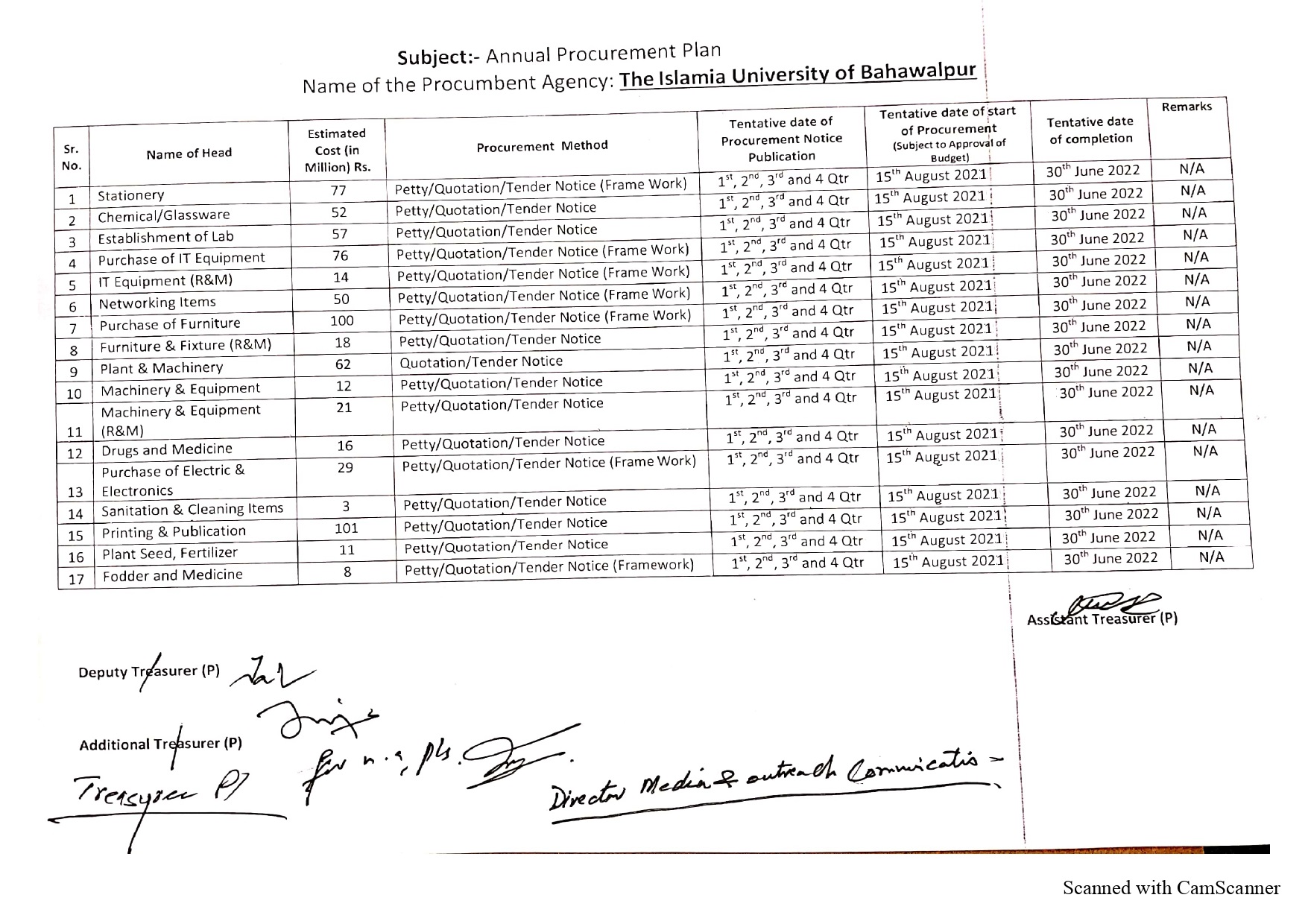 | Annual Plan | Annual Procument Plan | 2021-08-01 | 2022-06-30 | Closed | Account Branch | | — |