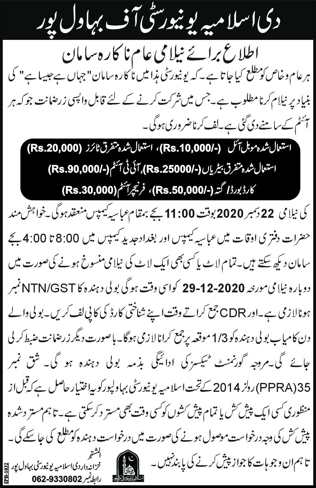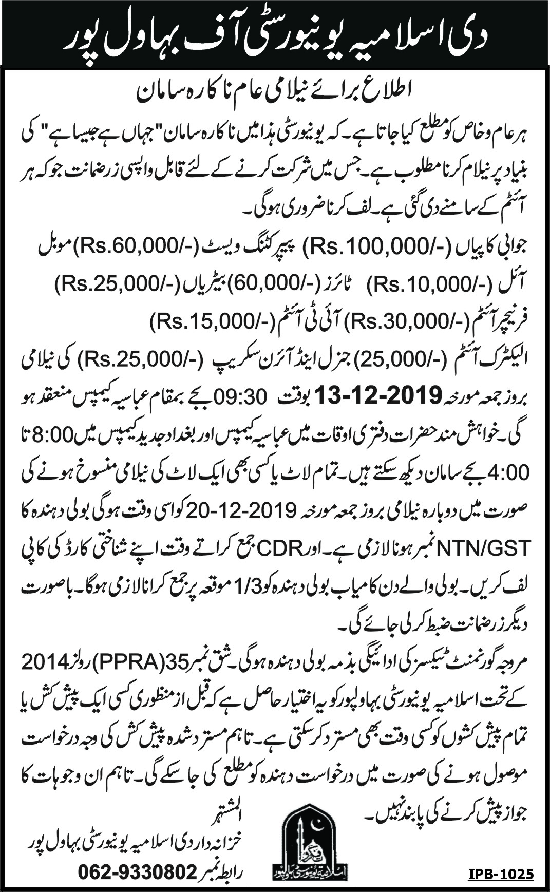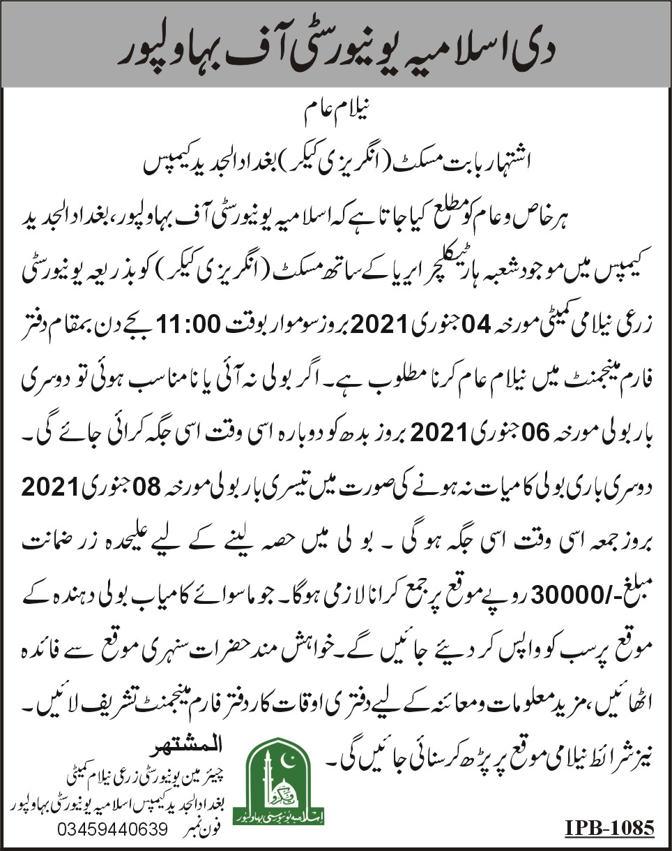 | Auction Notice | اشتہار بابت بنولہ و پھٹی واقع بغداد الجدید کیمپس | 2025-04-17 | 2025-04-28 | Closed | National Cotton Breading Institute | | |