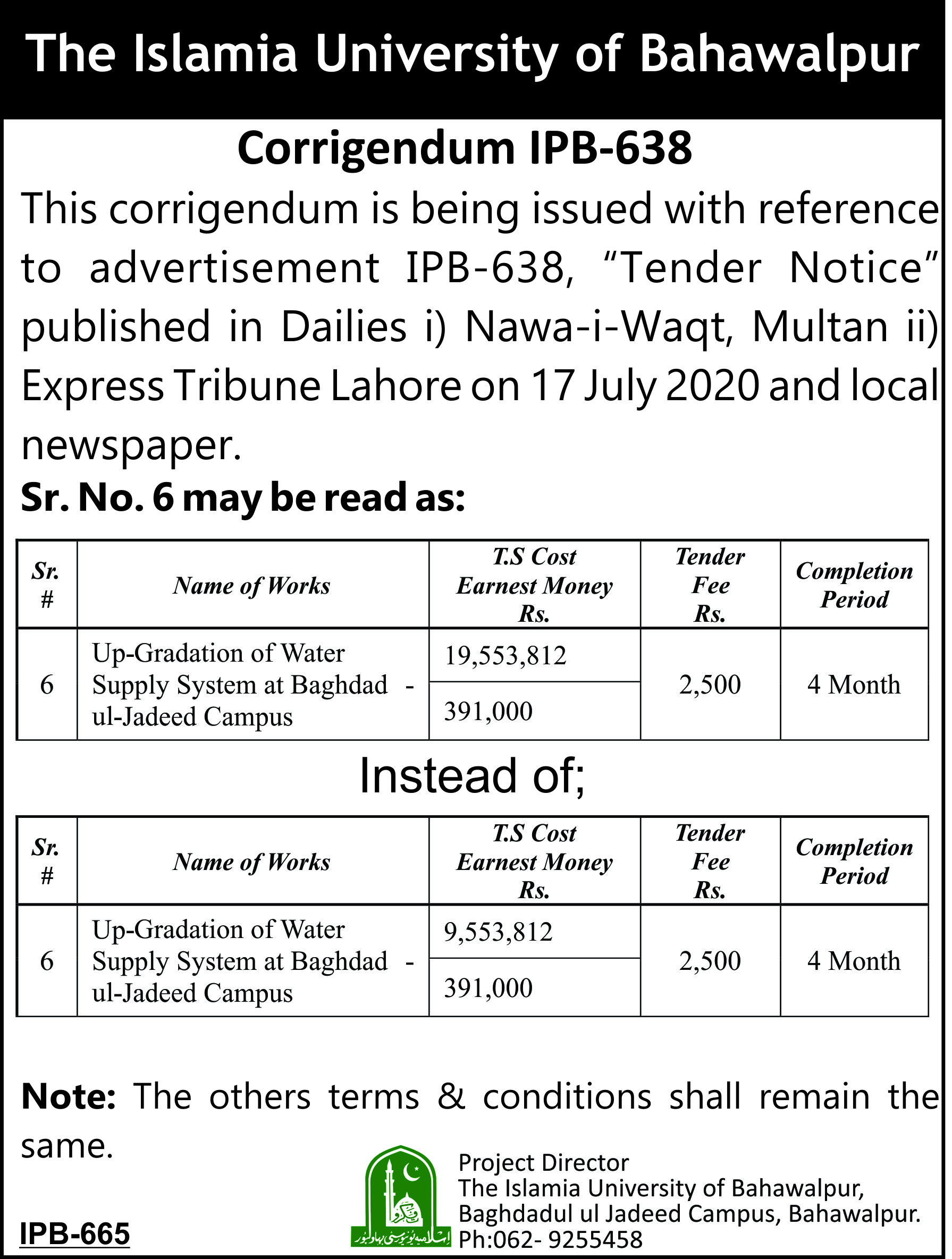 | Corrigendum IPB-638 (Tender Notice Civil Works) | Civil Works | 2020-07-24 | 2020-08-13 | Closed | Different | | |