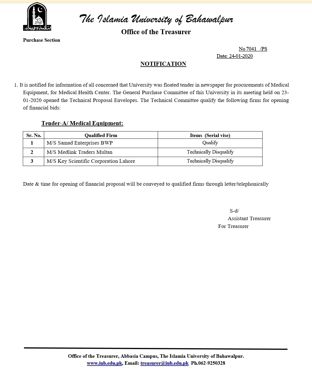 | Tender Notice IPB-384 | Medical Equipment and IT items | 2020-04-24 | 2020-05-08 | Closed | Medical Health Center and Directorate of IT | | |