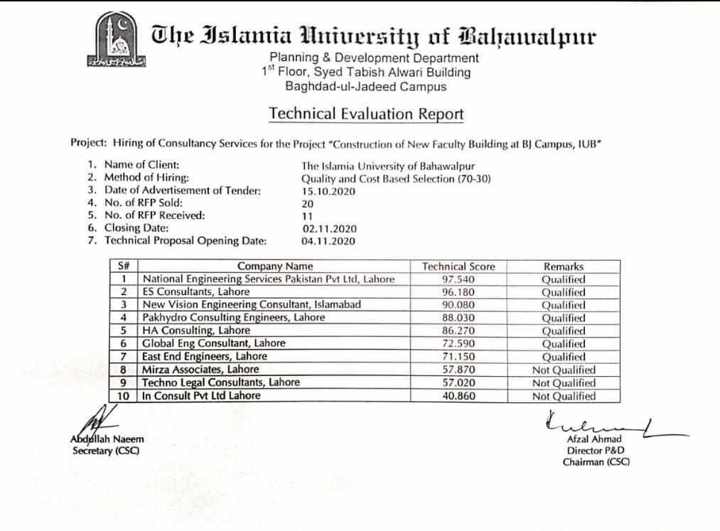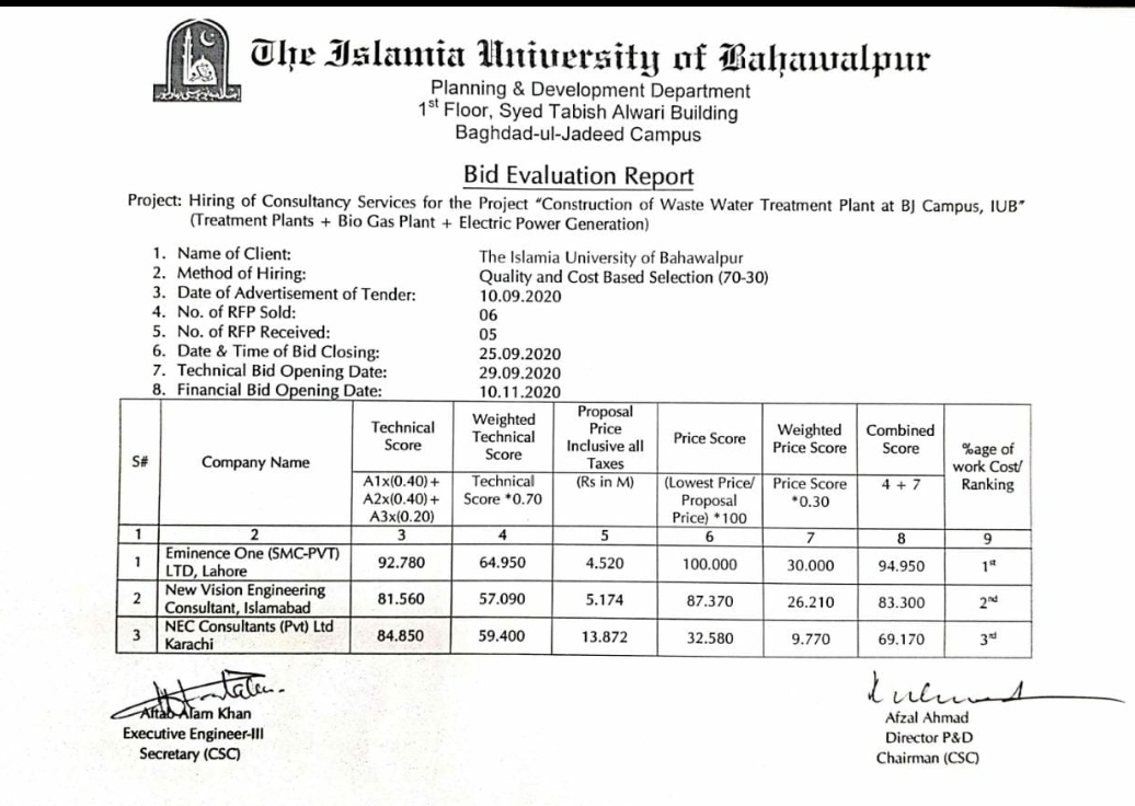 | Hiring of Consultancy Services for the Construction of Waste Water Treatment Plant at BJC IUB IPB-804 | Treatment Plant, Bio Gas Plant, Electric Power Gen | 2020-09-08 | 2020-09-25 | Closed | Directorate of Planing and Development | | |